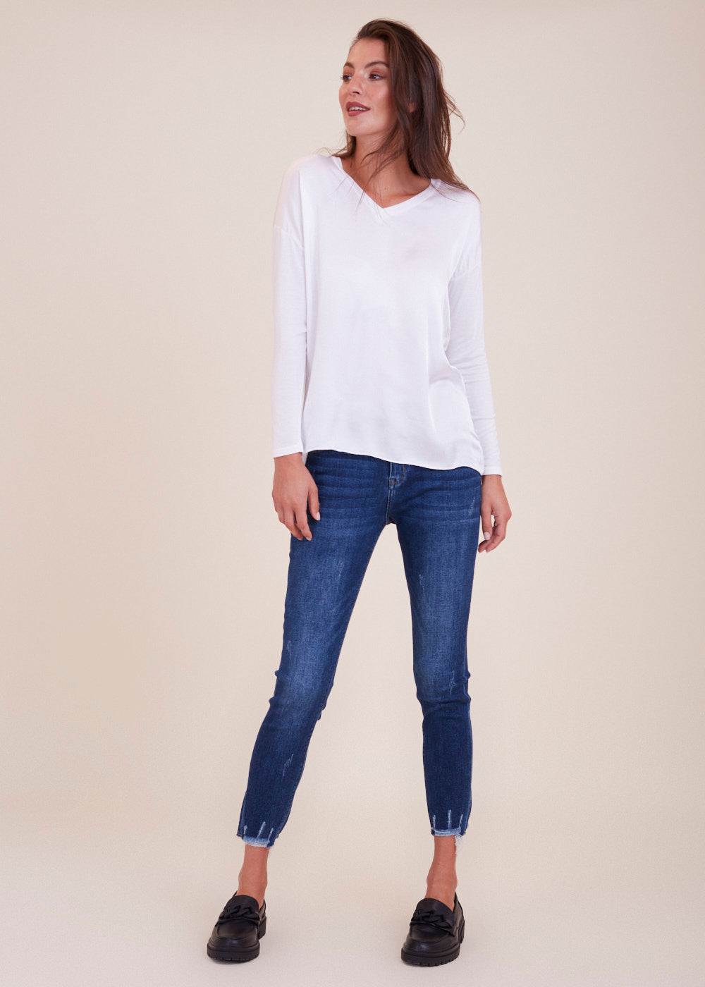 Basics sind ein absolutes Must-Have! Shirt mit langen Armen. Es hat einen Figurfernen Schnitt der nach hinten länger wird. Durch die zwei unterschiedlichen Materialen bekommt das Basic einen besonderen Touch. Der V-Ausschnitt sorgt darüber hinaus für ein schönes Dekolletee.