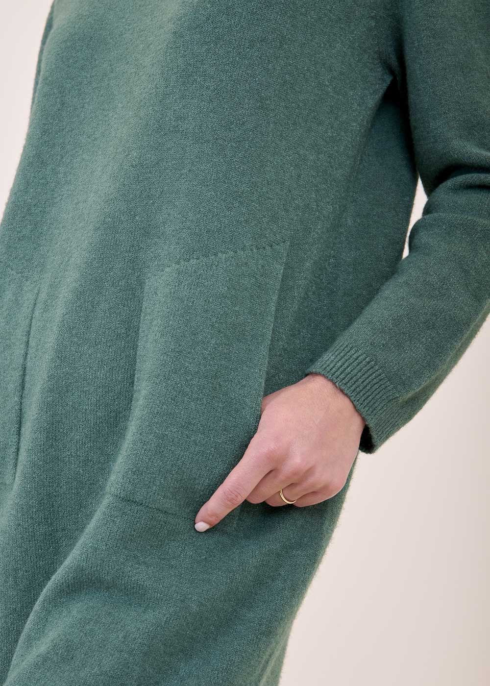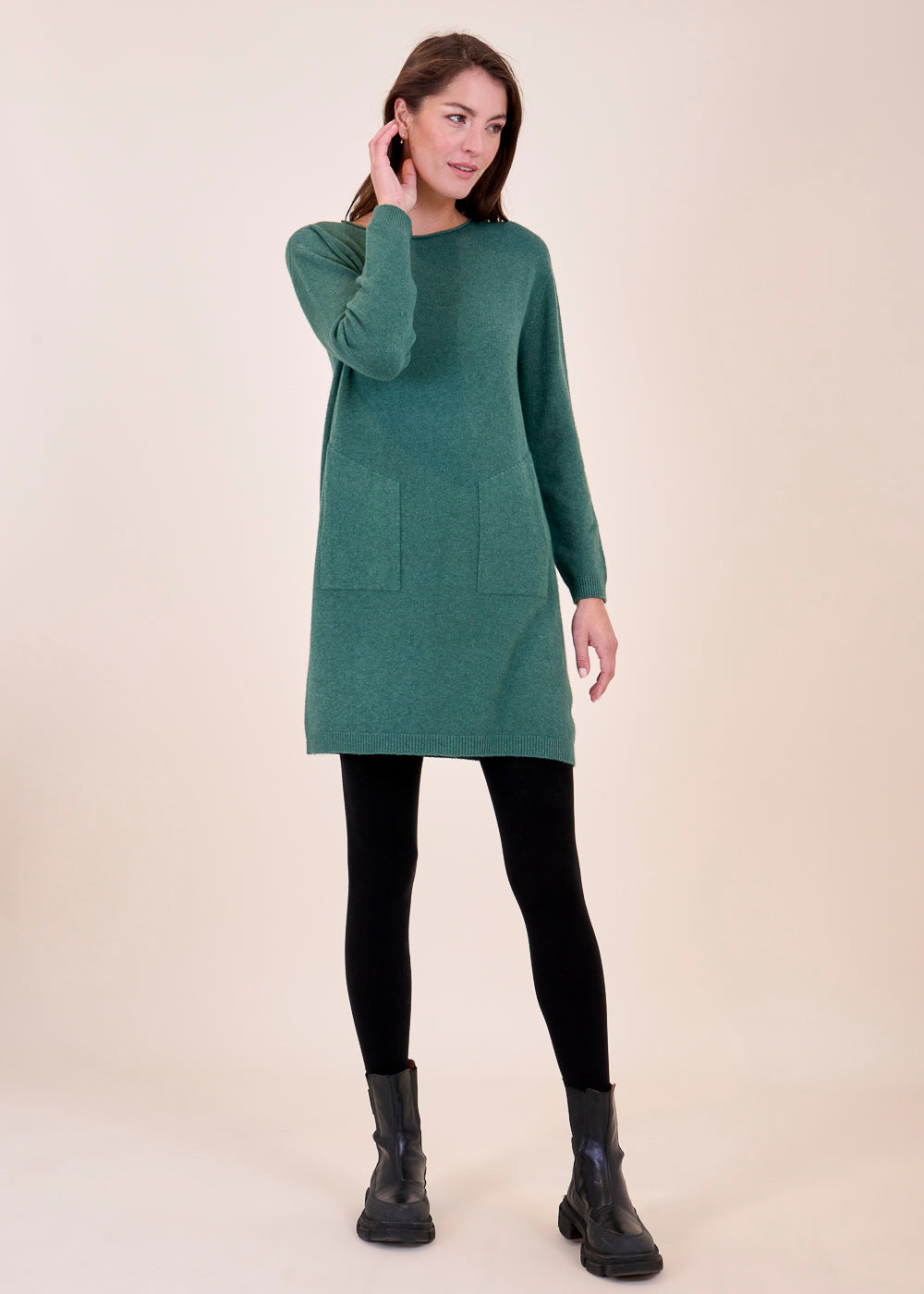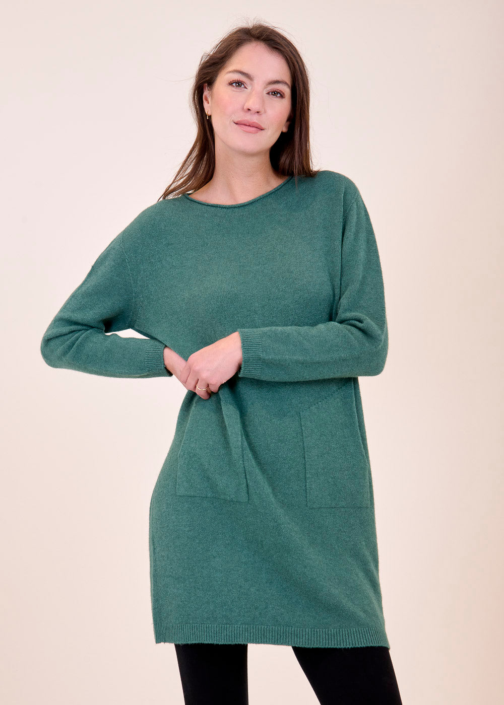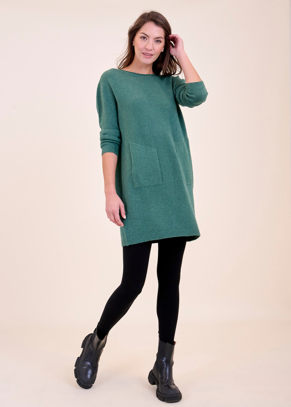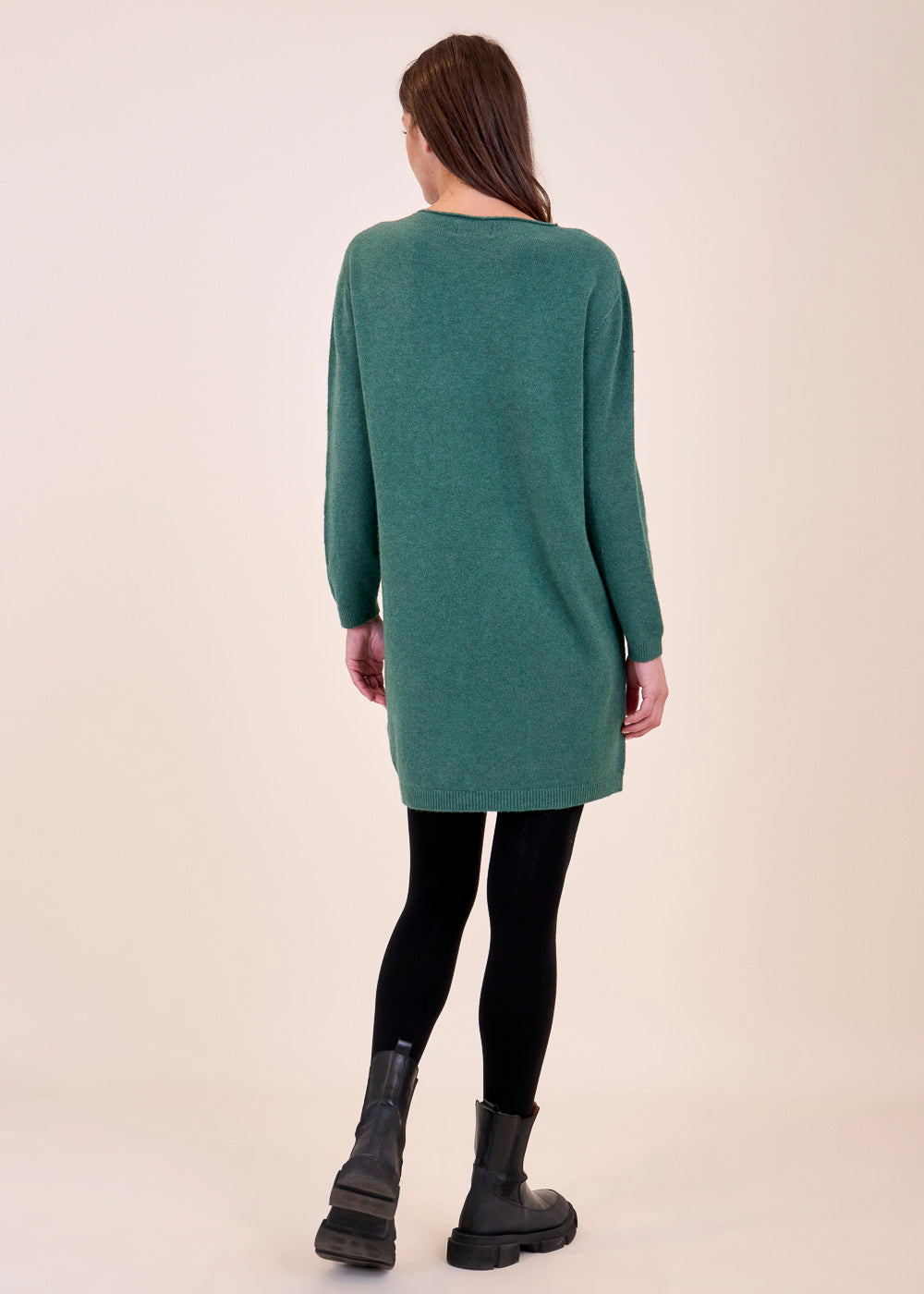 Lässig geschnittenes Strickleid aus unserem Kuschelgarn. Es hat lang geschnittene Arme und ein Rippenbündchen an den Saum, sowie an den Ärmeln. Die aufgesetzten Taschen geben dem Kleid eine gewisse Lässigkeit. Einfach zum Wohlfühlen!