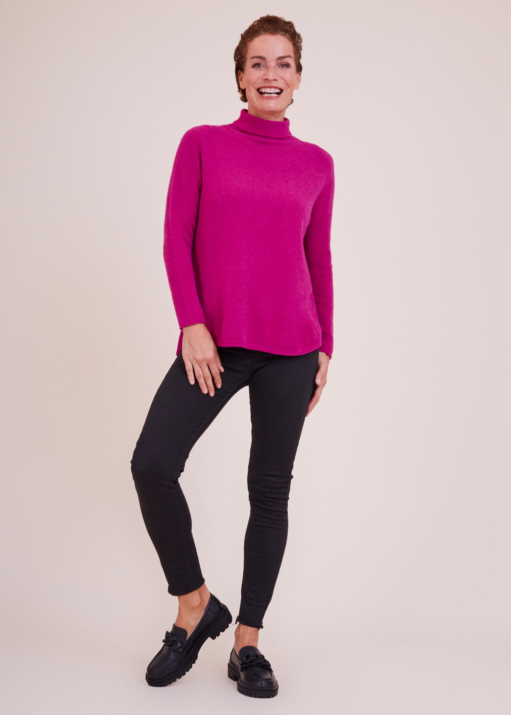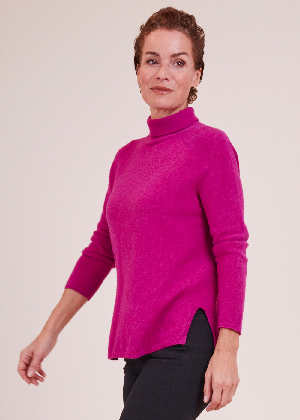 Ein Rolli zum Verlieben: Der gestrickte Pullover in der Farbe Fuxia besticht durch sein besonderes Design. Er hat Schlitze an den Seiten und ein leicht verlängertes Rückenteil. Ein kuscheliger und wunderschöner Begleiter.
