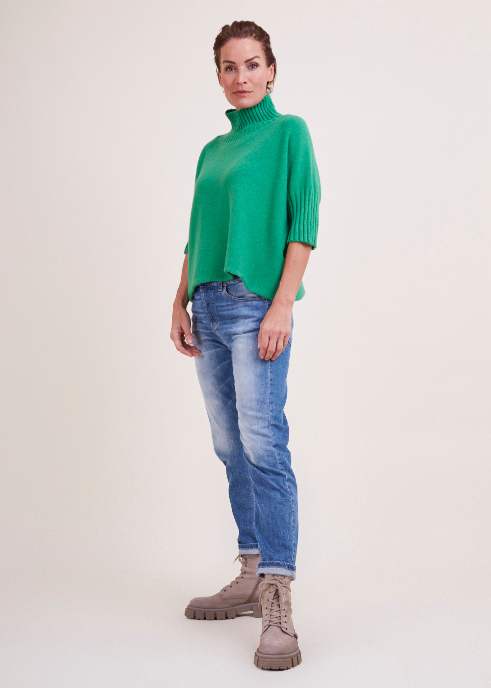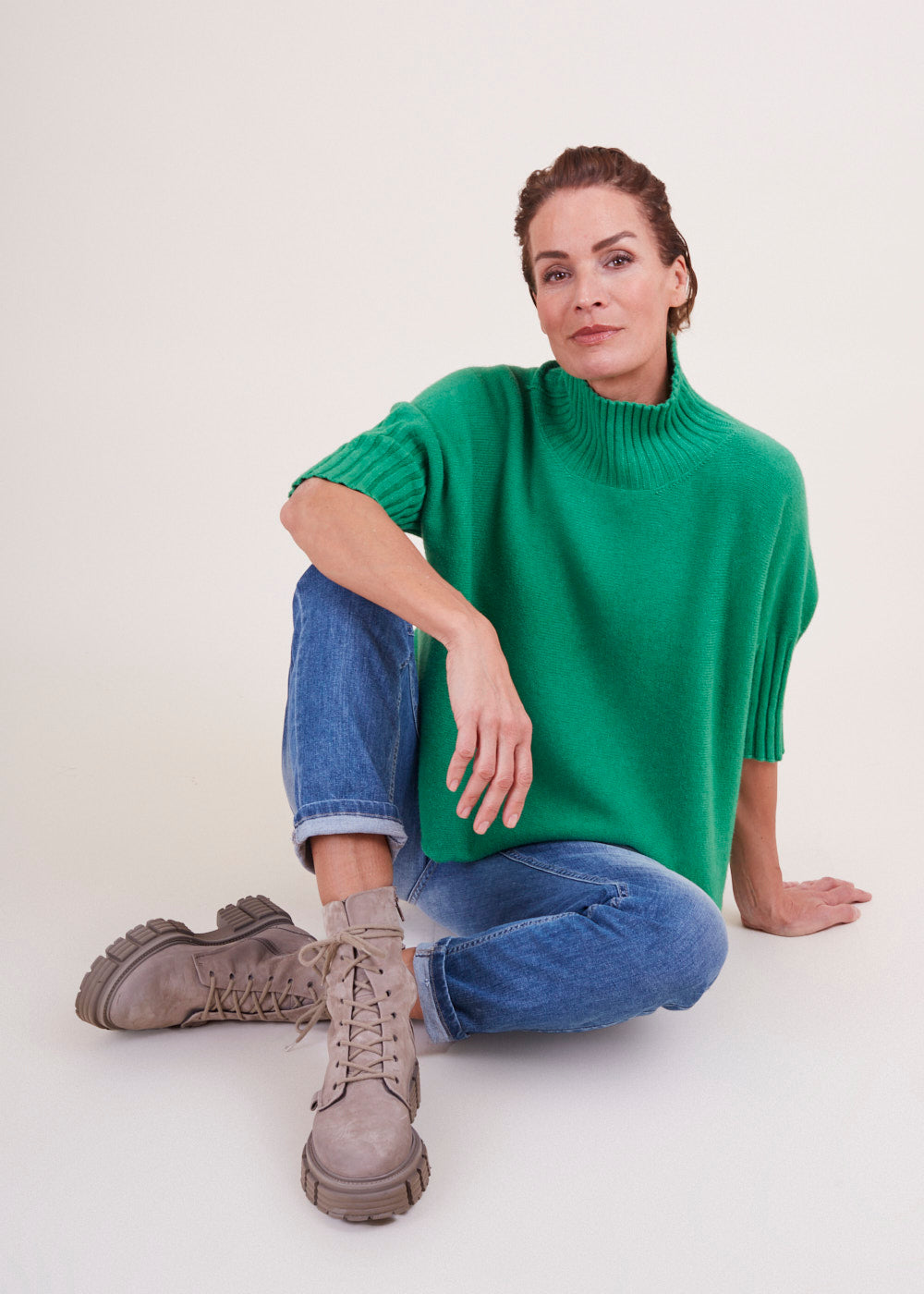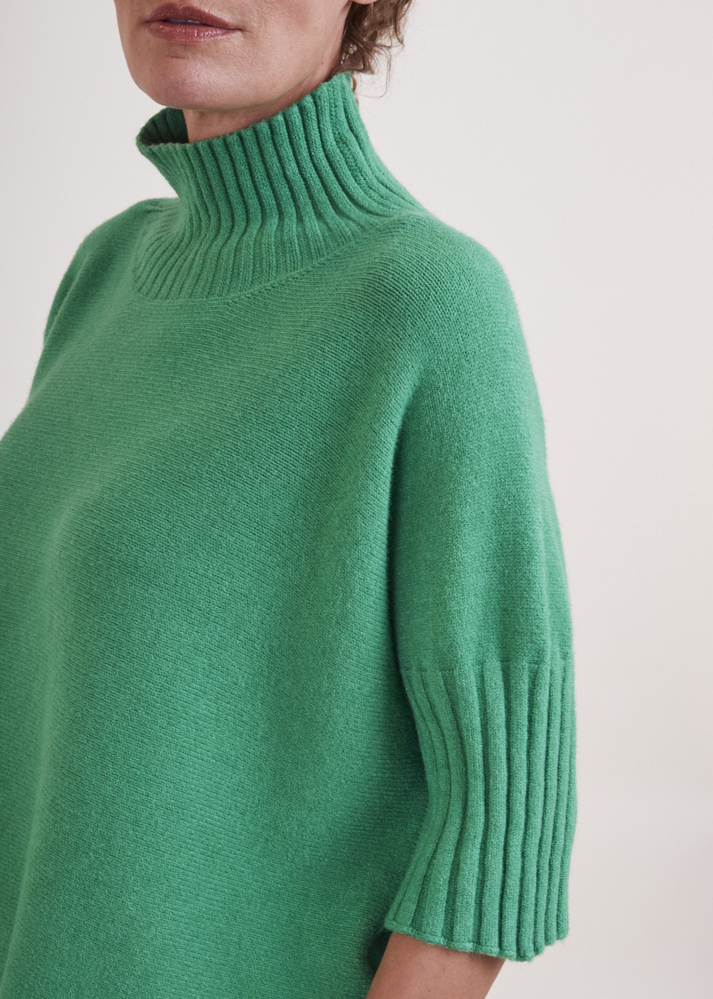 Kurz geschnittener Strickpullover mit Rollkragen aus unserem Kuschelgarn. Er hat ein Rippenbündchen am Kragen und an den Ärmeln. Mit kurz geschnittenen Armen.