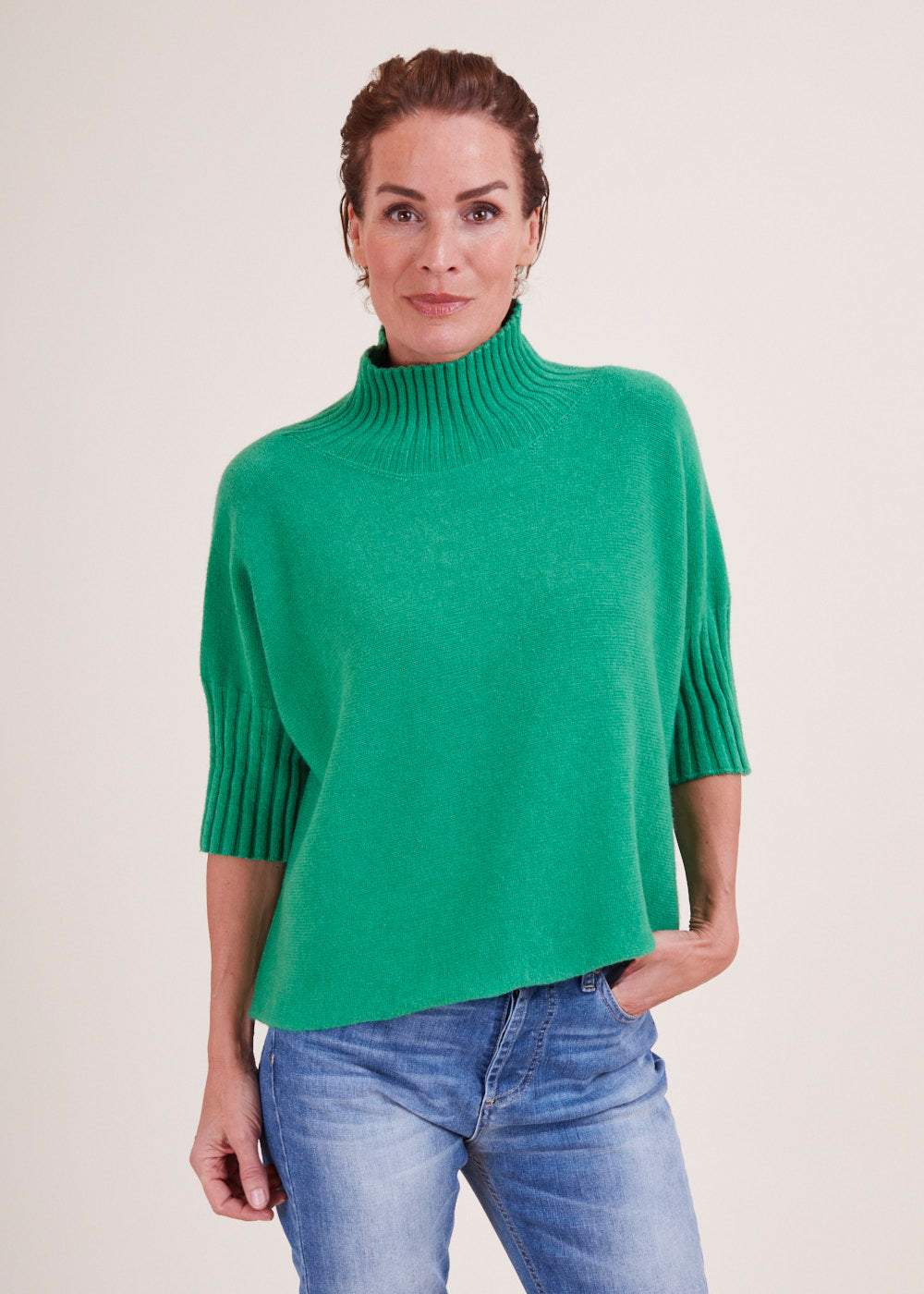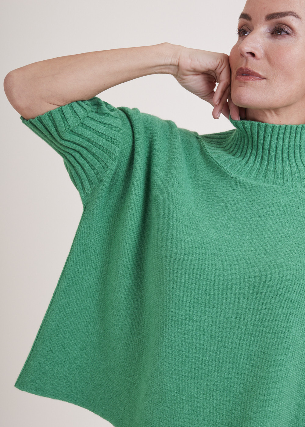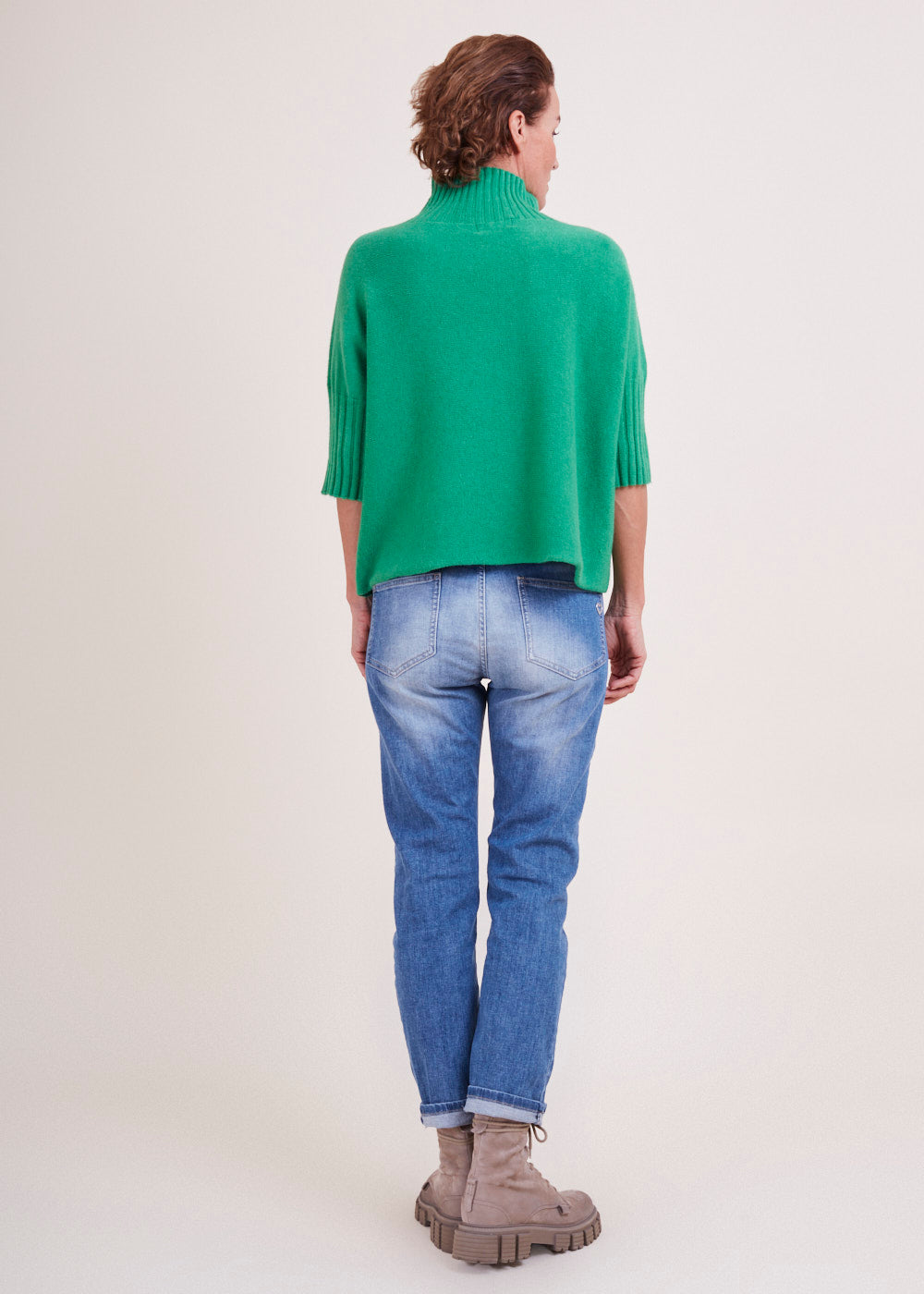 Kurz geschnittener Strickpullover mit Rollkragen aus unserem Kuschelgarn. Er hat ein Rippenbündchen am Kragen und an den Ärmeln. Mit kurz geschnittenen Armen.