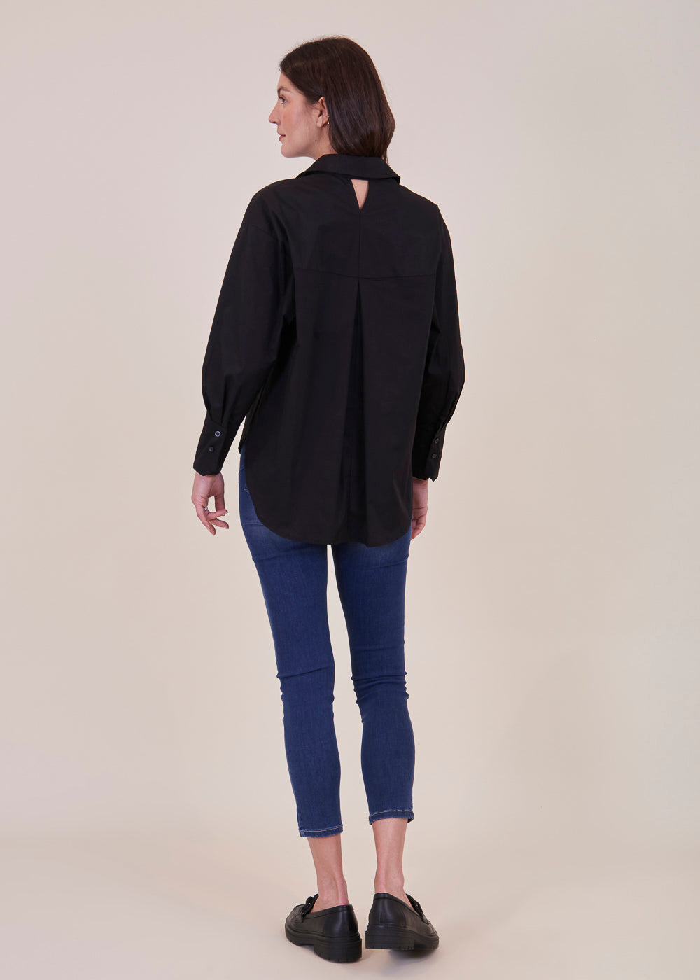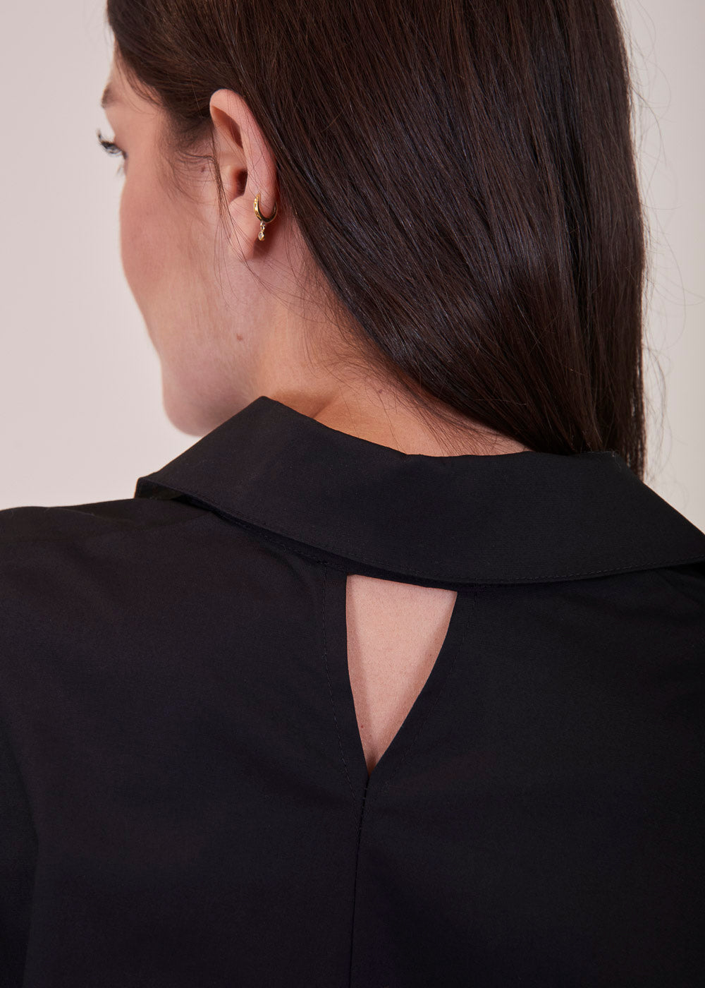 Wundervoll geschnittene Bluse aus Baumwolle mit Hemdkragen und Knopfleiste. Mit besonderem Cut-out auf den Rücken. Die Bluse hat lange Ärmel, die sich ebenfalls mit Knöpfen verschließen lassen. Die Schultern sind leicht überschnitten. Ein absoluter Hingucker.
