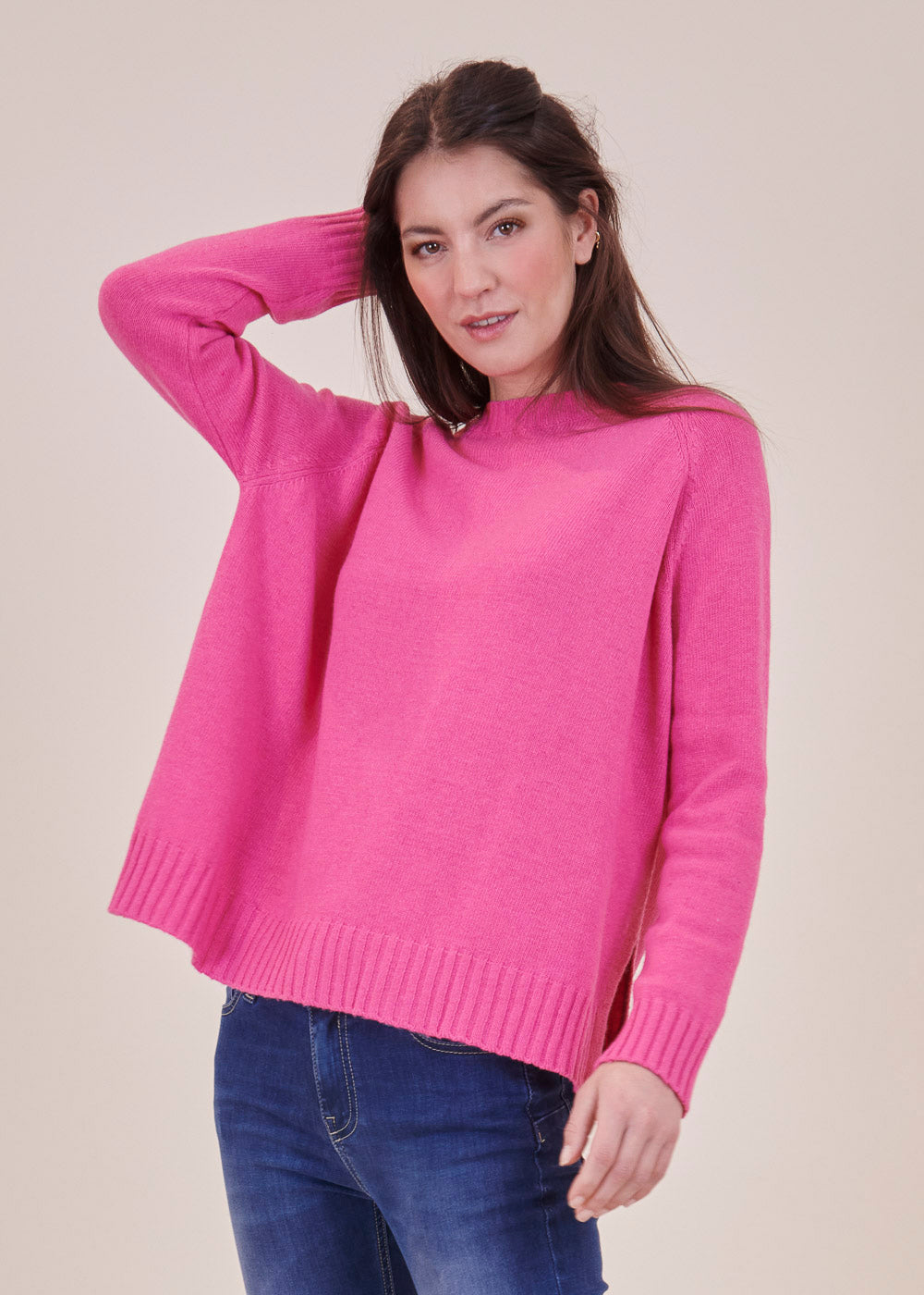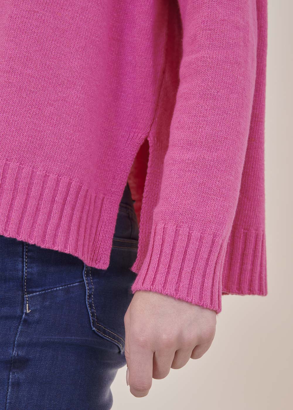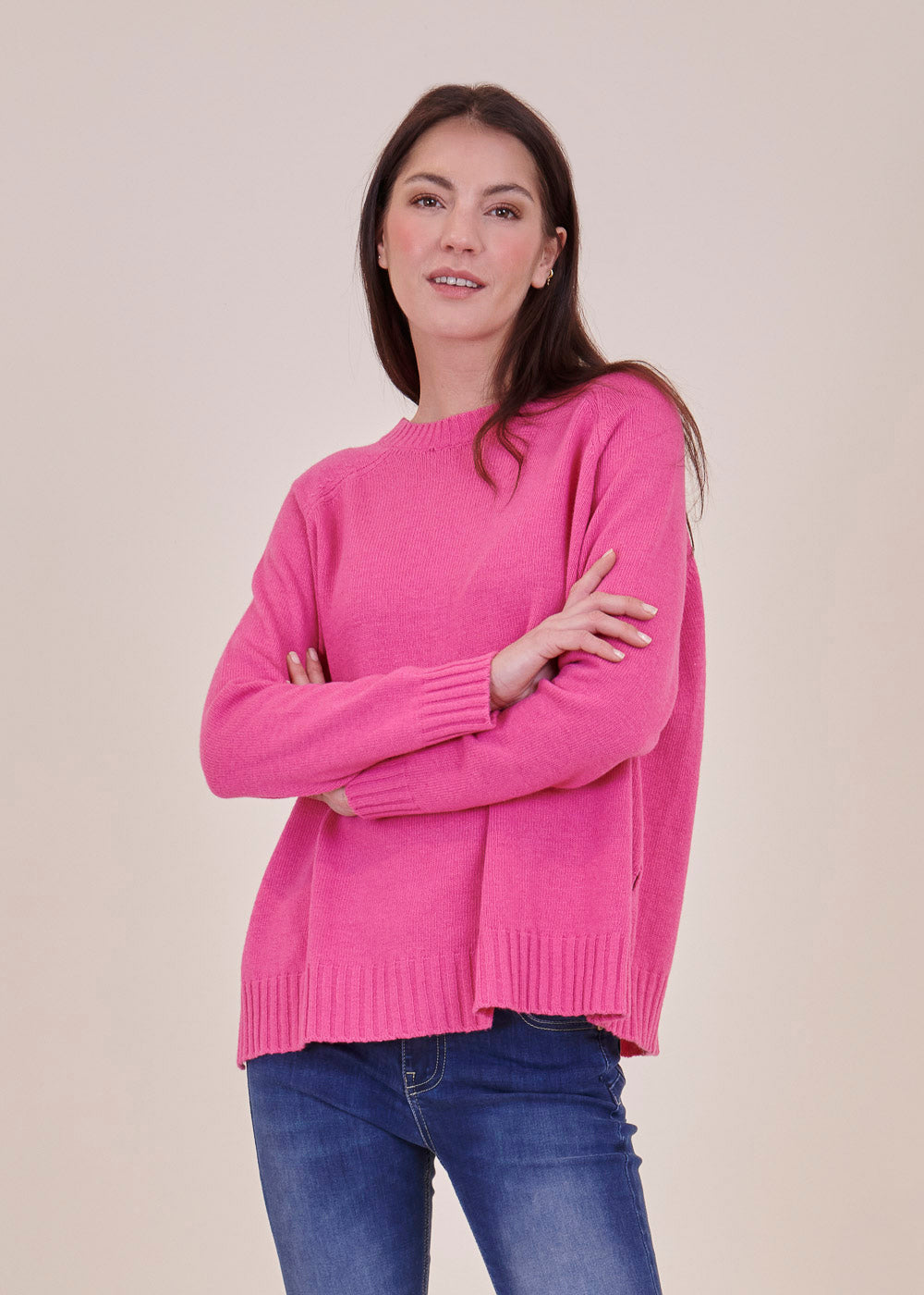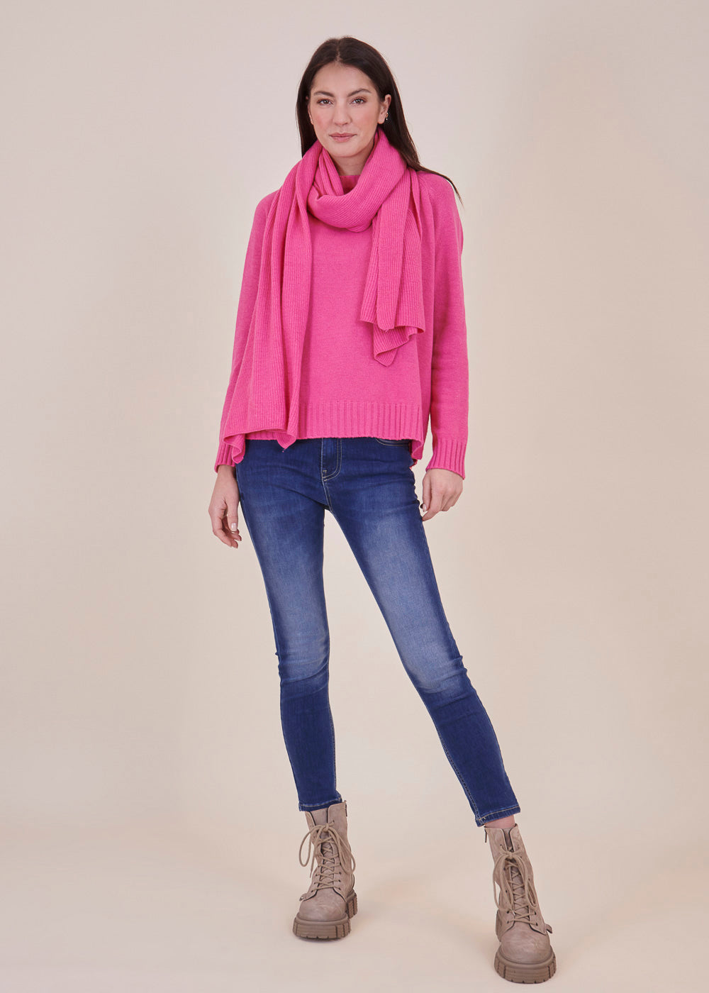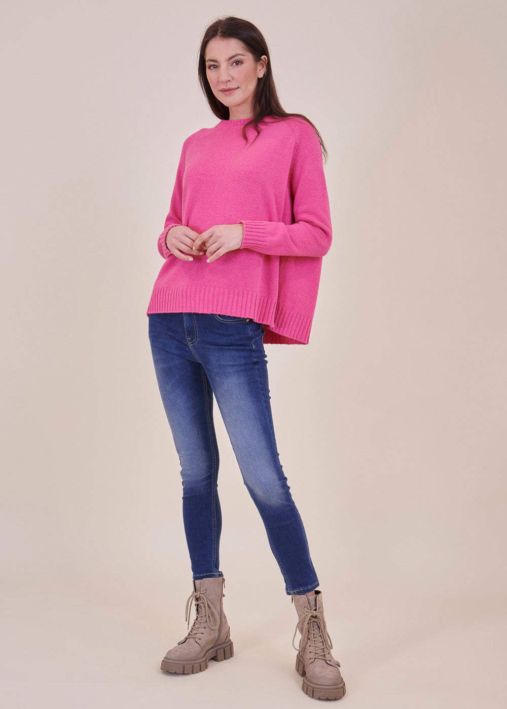 Kuscheliger Pullover mit Rundhalsschnitt und lockerem Schnitt. Der wundervolle Fuxia Ton verleiht jedem Frische. Mit breitem Rippenbündchen am Ärmeln und Saum. Seitliche Schlitze. Wir haben auch den passenden Schal in unserem Shop.