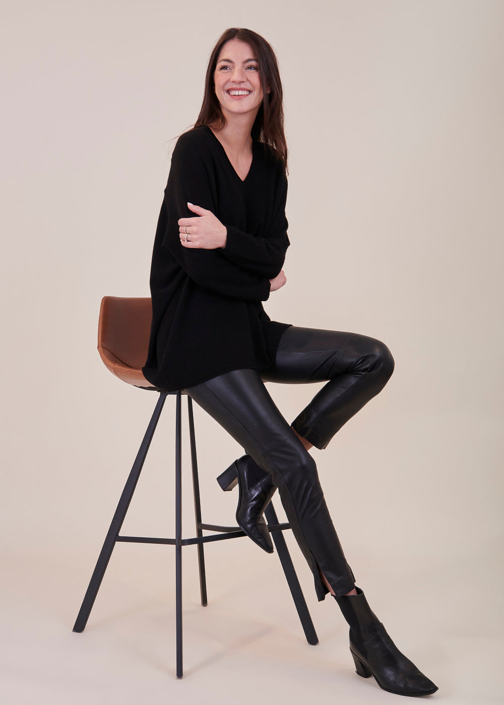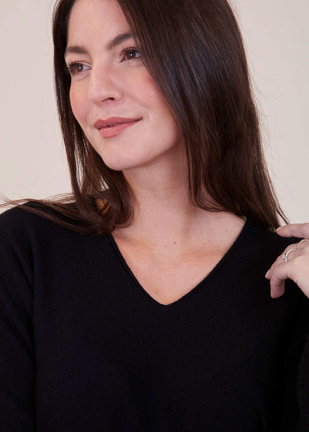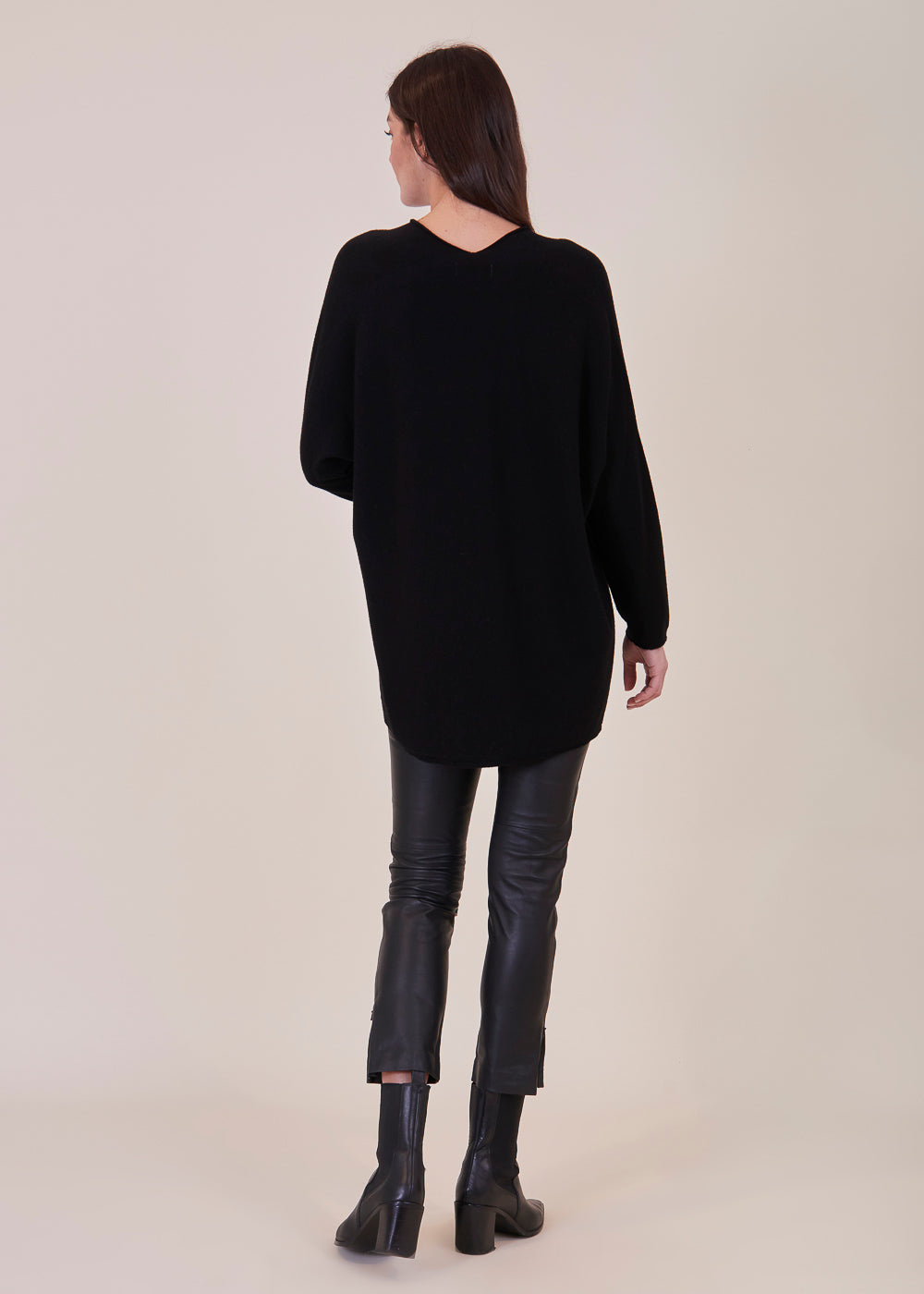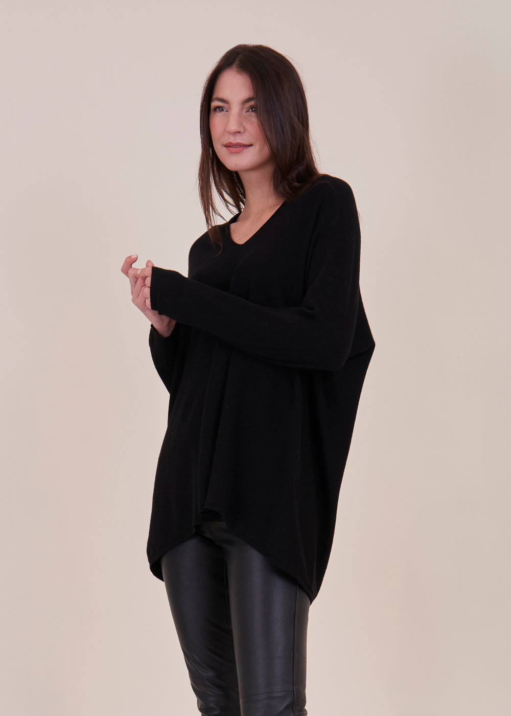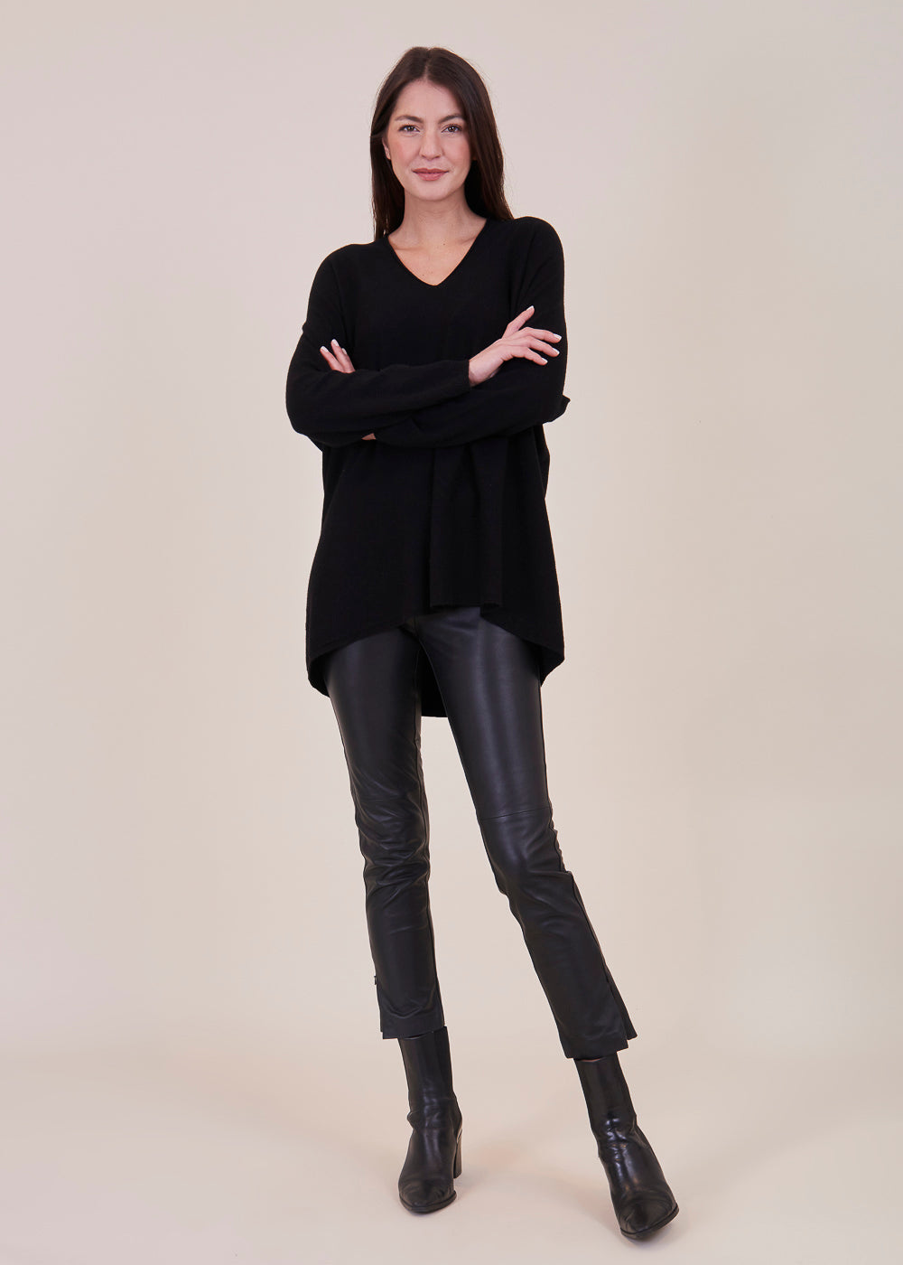 Leichter und gemütlicher Oversizepullover mit V-Ausschnitt. Mit überschnittenen Ärmeln aus unserem Kuschelgarn. Rippenbündchen an den Ärmeln und am Saum. Einfach zum wohlfühlen. Kombiniere diesen Artikel gerne mit einer unserer Please Skinny Jeans.