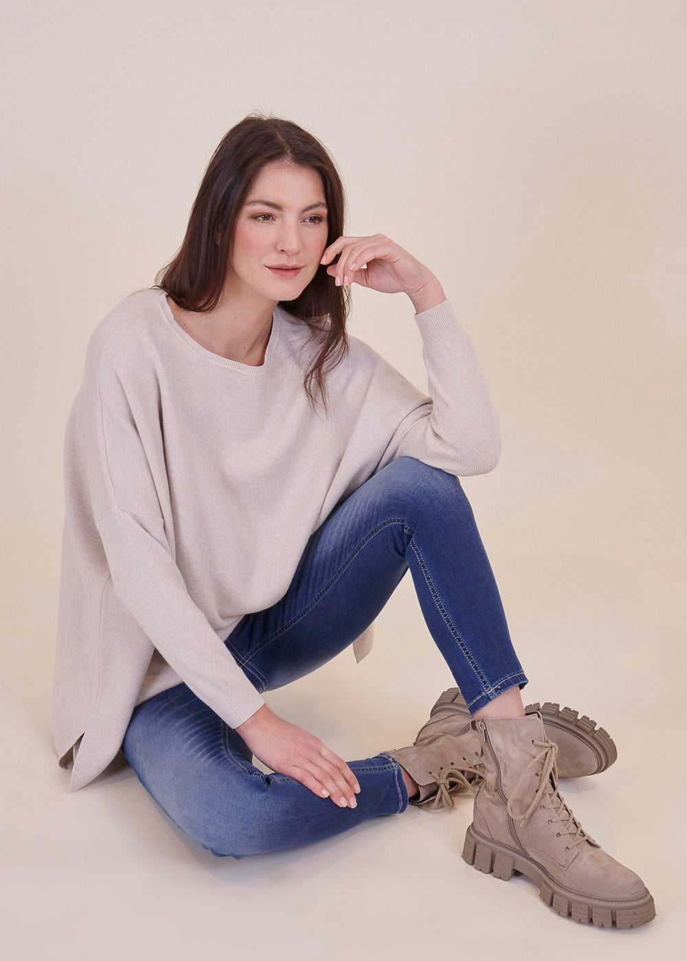 Dieser lässige Pullover gehört schon jetzt in deinen Kleiderschrank. Mit seinem schlichten Uniton ist dieser Feinstrickpullover ein zeitloser und moderner Begleiter. Durch seinen lässige Form gibt er sich besonders schmeichelhaft. Langer Ärmel mit geraden Abschlusses. Gefertigt aus unserem Kuschelgarn. Einfach zauberhaft.