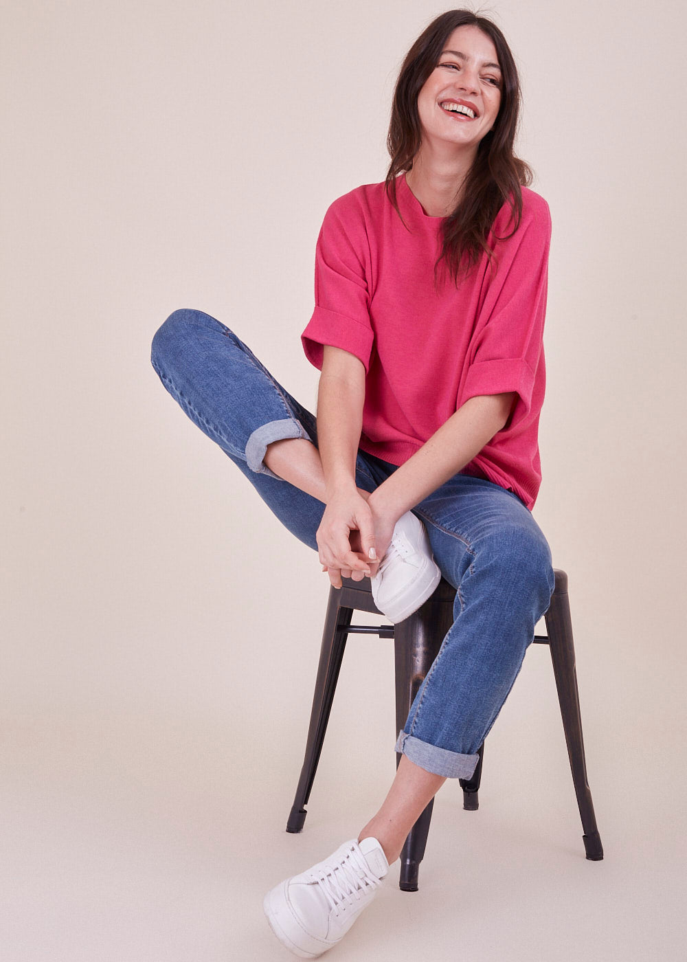 Vervollständigt dein Outfit und darf in keiner Garderobe fehlen: Dank diesem Oversize-Pullover kannst du unterschiedlichste, modische Outfits kreieren. Der Feinstrick ist herrlich weich und trägt sich angenehm auf der Haut. Smarte Design-Details, wie etwa die umgeschlagenen Ärmel und das Metallplättchen, runden den Gesamteindruck ab.