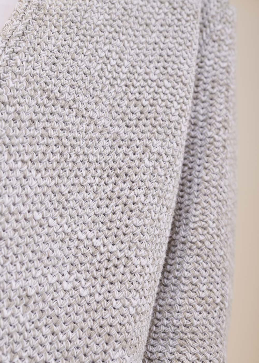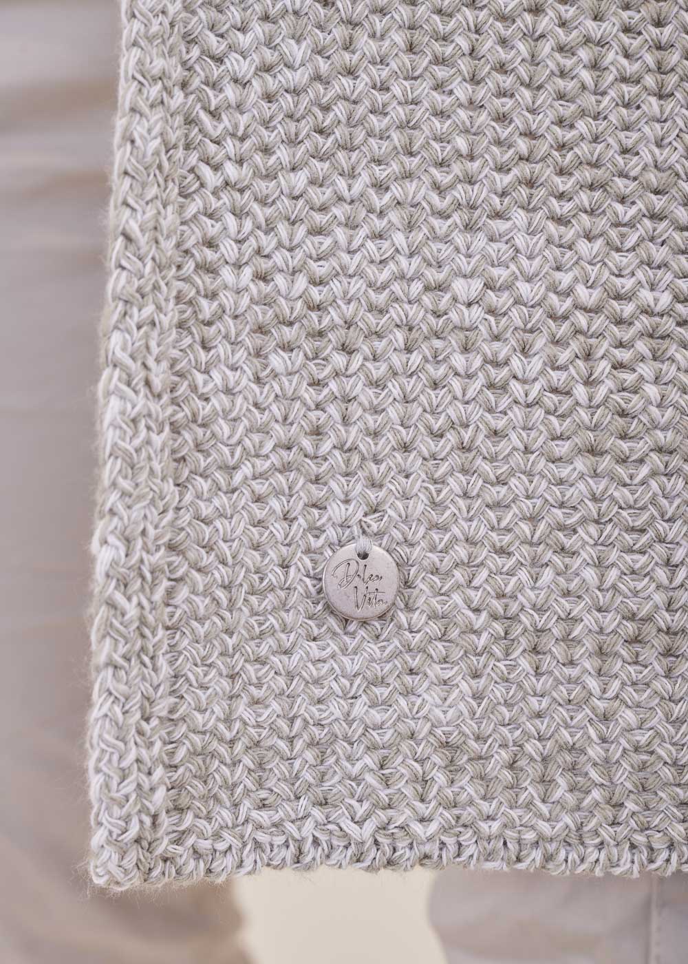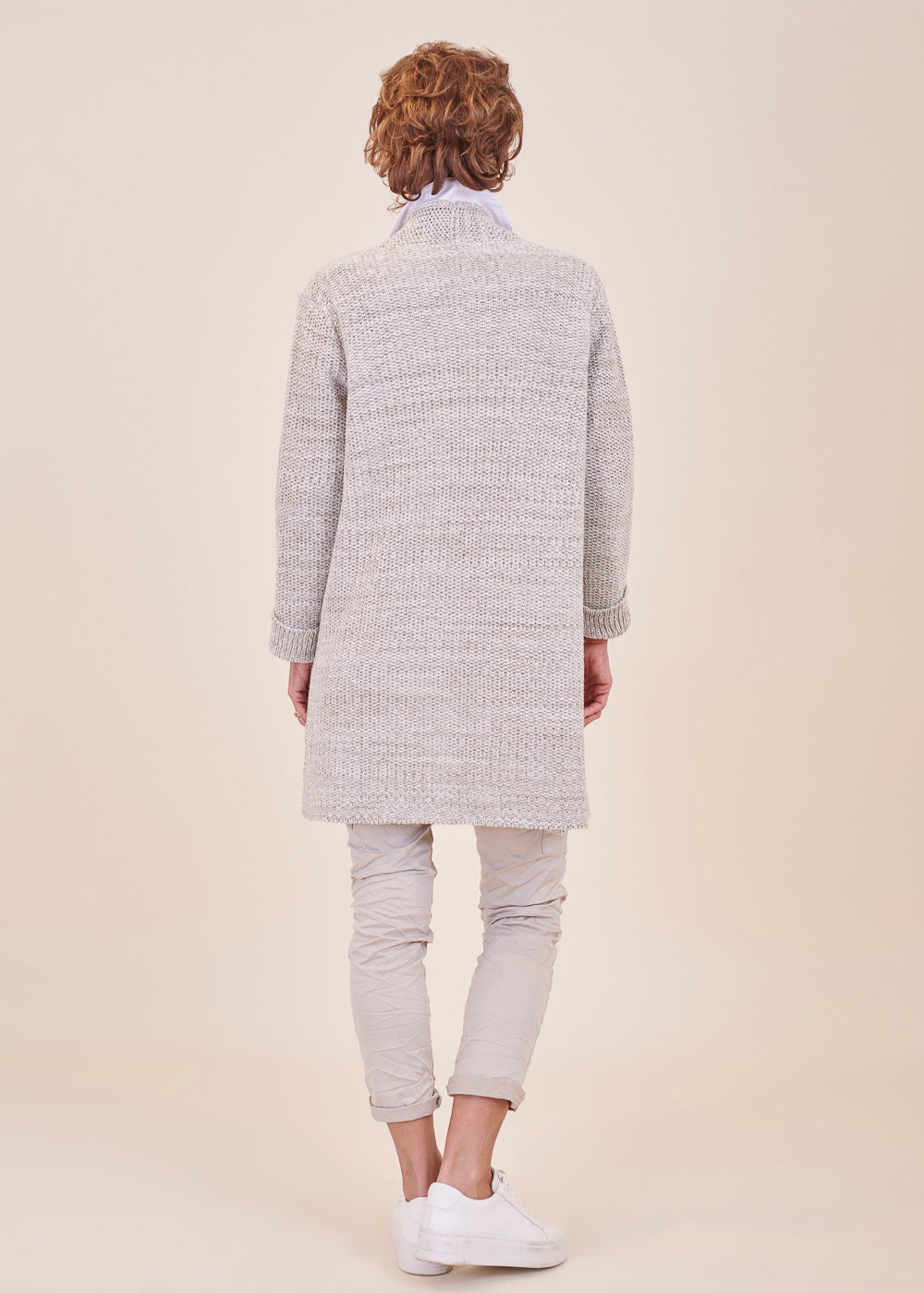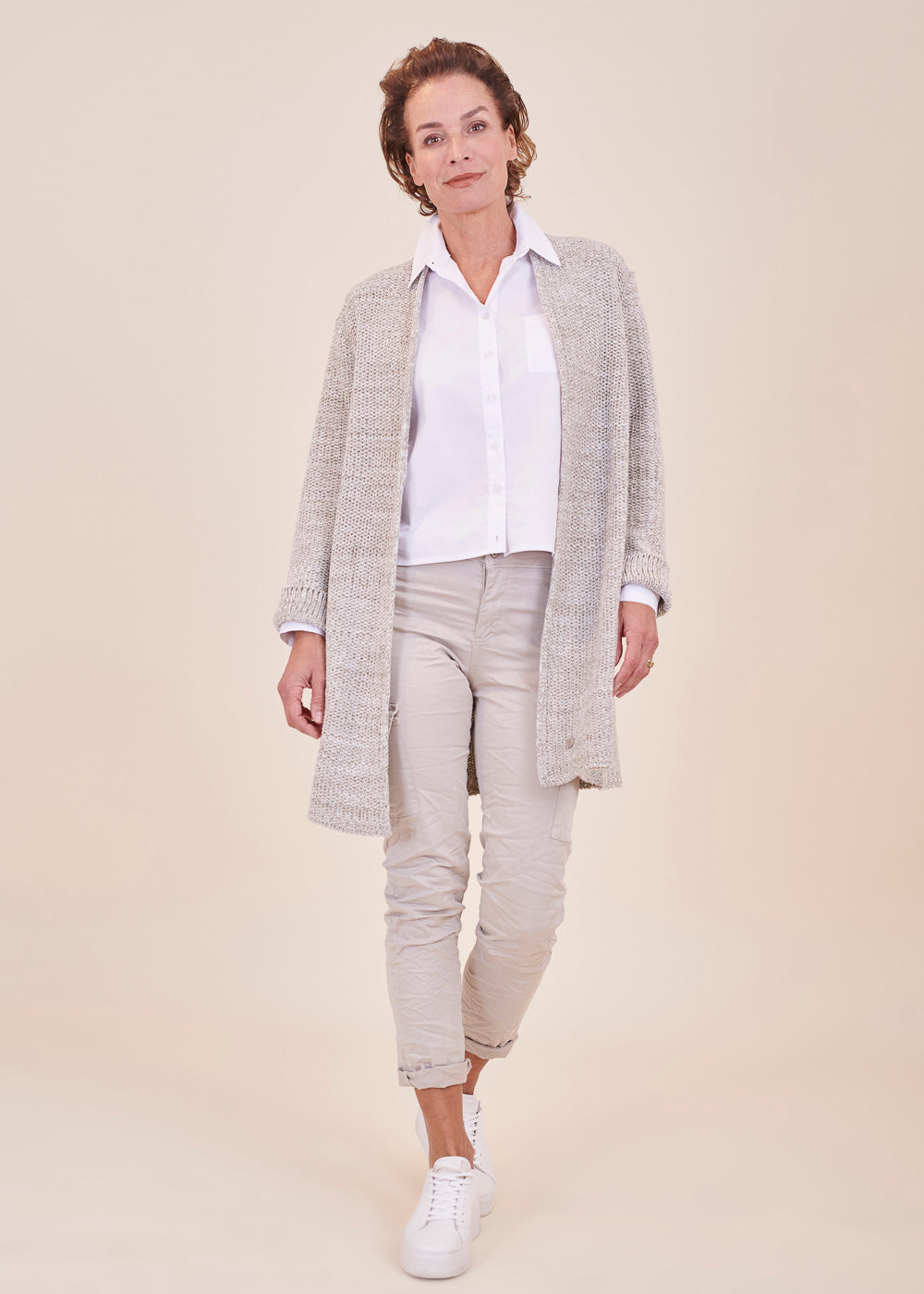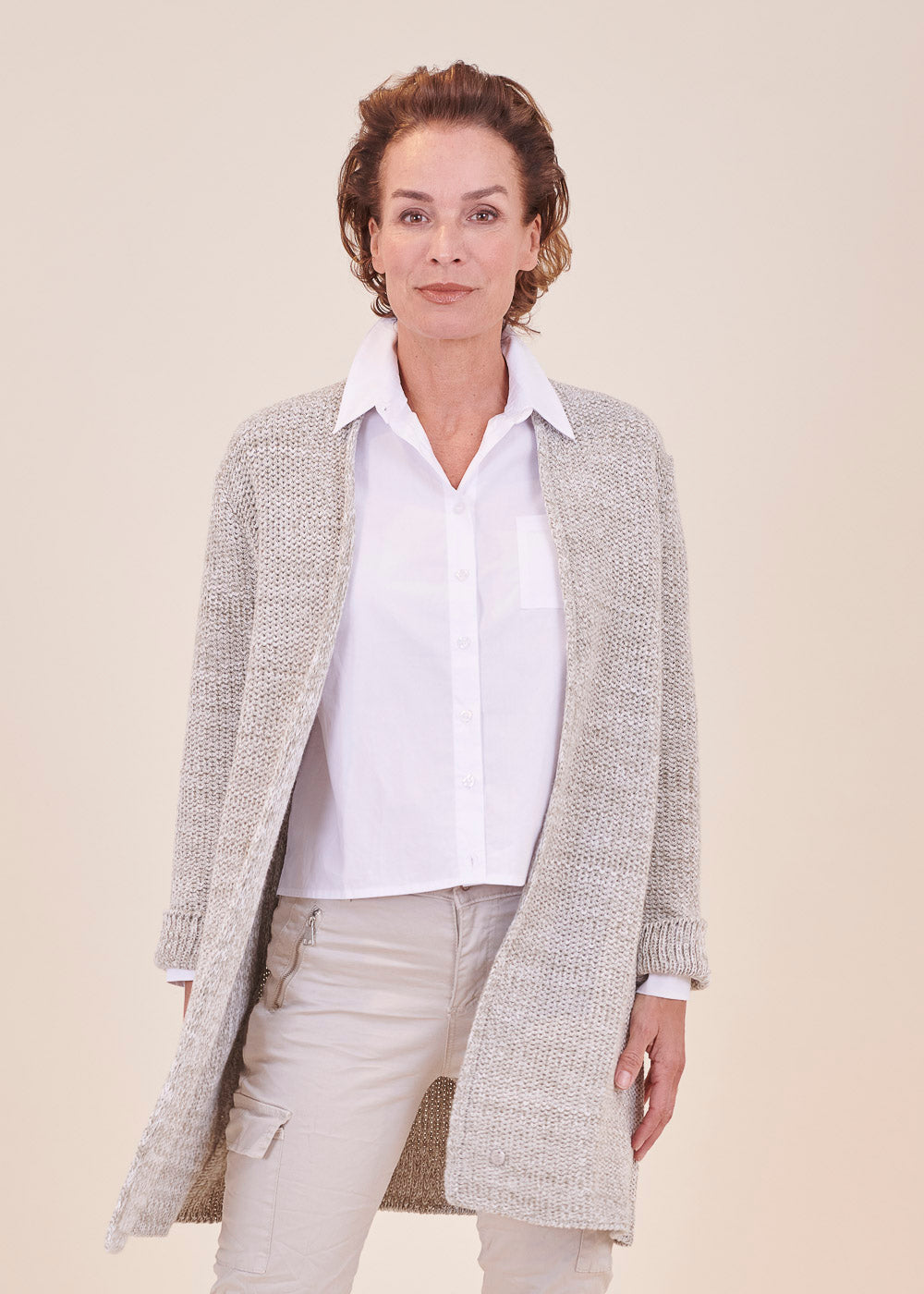 Modisch offen zu tragende Strickjacke im Moulinestyle. Er hat einen geraden und lässigen Schnitt. Das Material schmiegt sich angenehm an deinen Körper an. Mit besonderen Details wie dem Metallplättchen. Einfach besonders und perfekt für den Frühling.