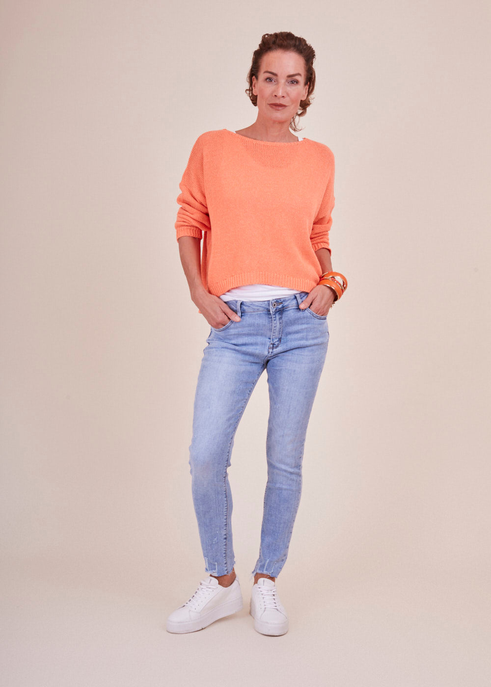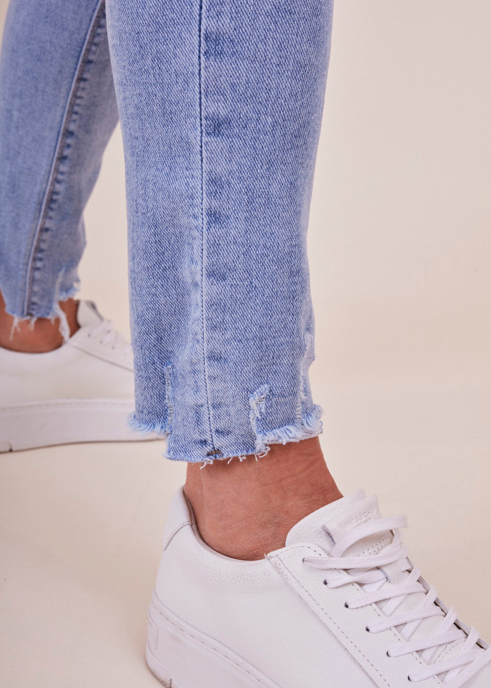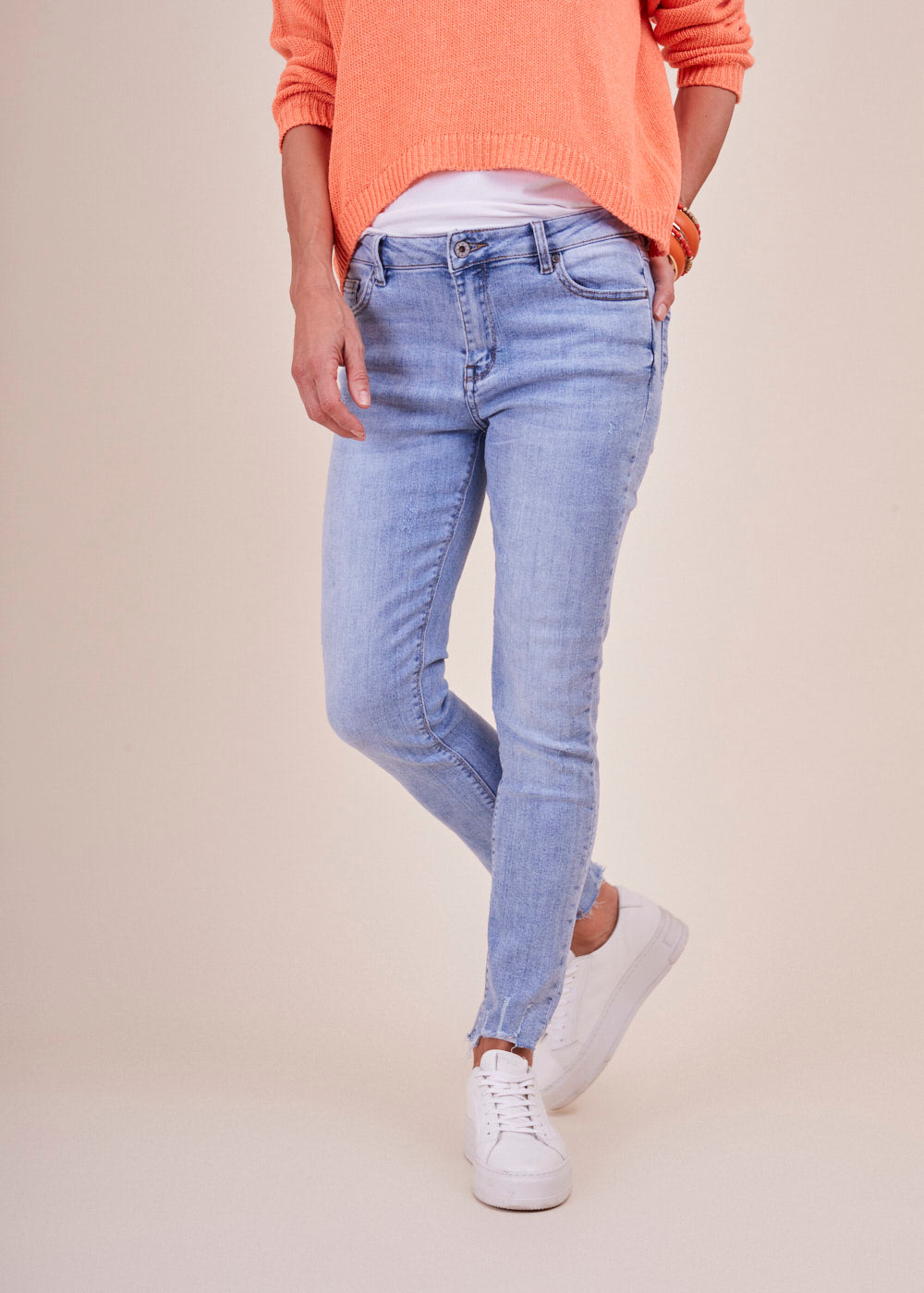 Jeans mit heller Waschung, seitlichen Eingriffstaschen und destroyed Effekten. Die Jeans hat einen engen Schnitt und passt sich durch ihr wundervolles Material optimal an deine Figur an. Mit offenen Saum Details, einfach Perfekt!