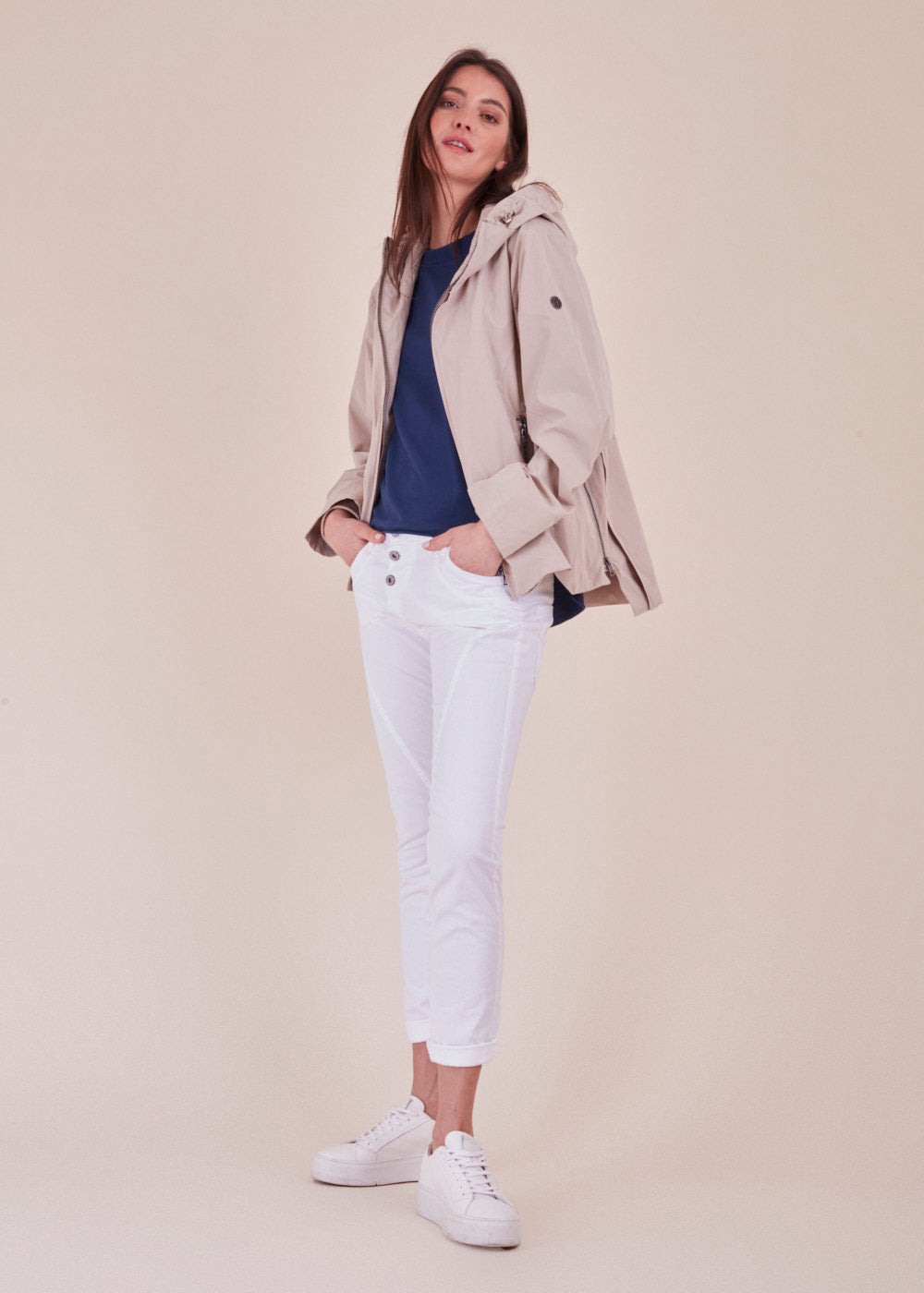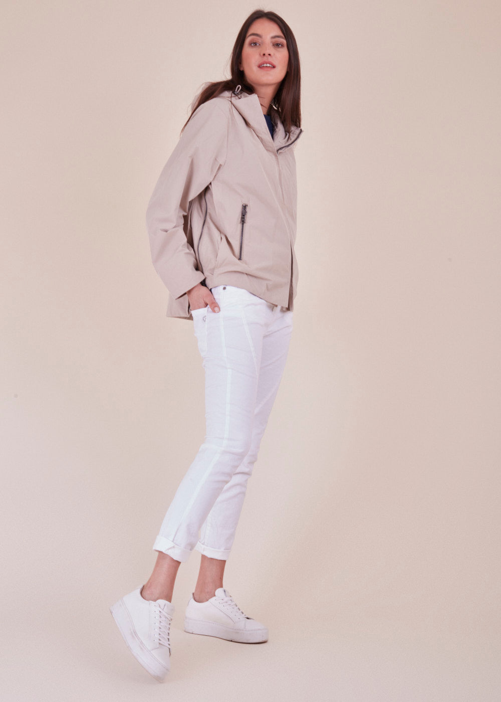 Unsere geliebte lässig geschnittene Fashionjacke kommt aus dem Hause BLONDE NO.8!  Das lässig geschnittene Modell Valentina hat ein leicht verlängertes Rückenteil und eine lässige Kapuze. Mit seitlichen Reißverschlüssen zum einfachen erweitern der Jacke.