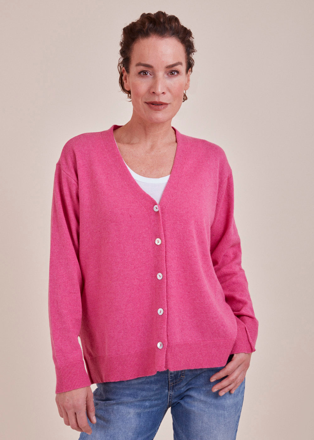 Kurz und kastenförmig geschnittene Strickjacke mit langen Armen. Sie hat ein Rippenbündchen an den Ärmeln und am Saum. Durch die besonderen Frontknöpfe lässt sich diese Jacke wunderbar geschlossen tragen. Zum darunter tragen empfehlen wir dir unsere Basic Tops. Kuschelig weicher Tragekomfort mit absoluter Wohlfühlgarantie.
