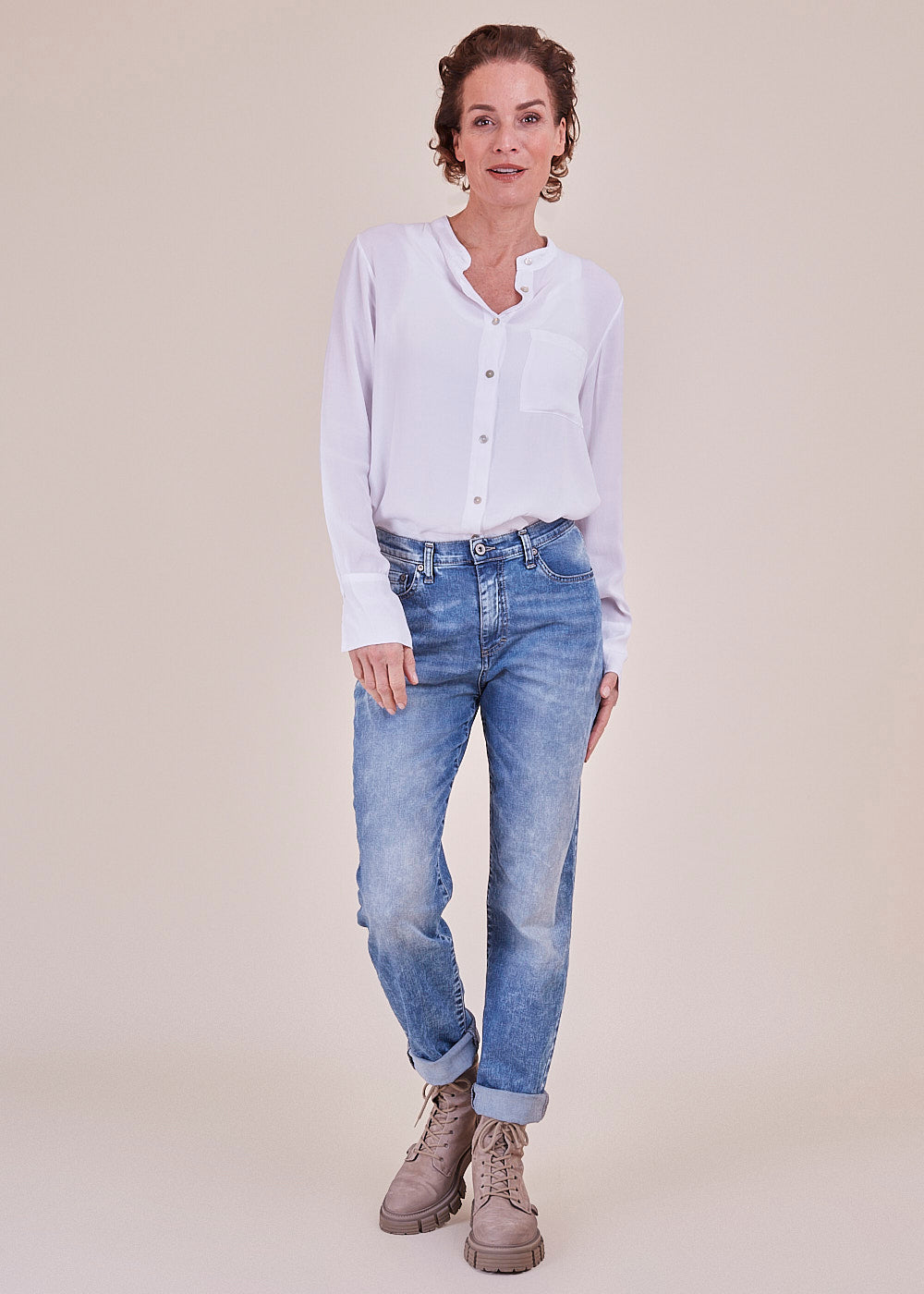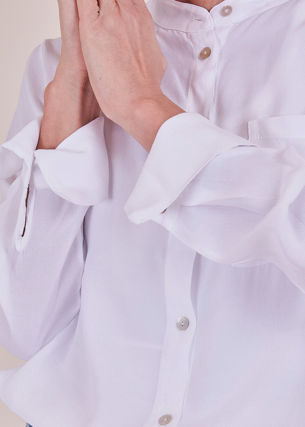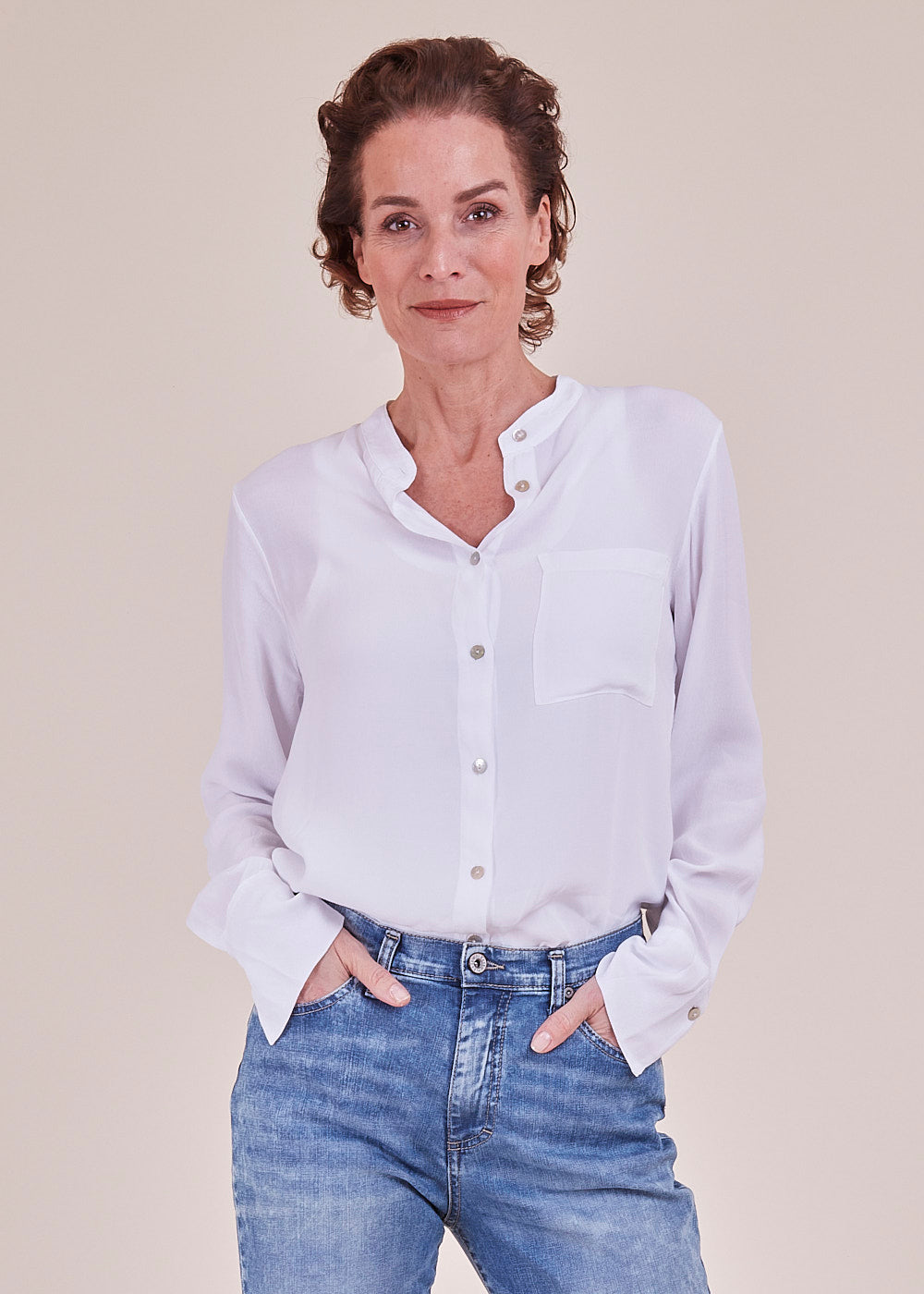 Stehkragen Bluse mit durchgehender Knopfleiste aus einem fließenden Viskosematerial.  Sie lange Arme die in einer Manschette enden. Ein großartiger Kombinationsartikel.