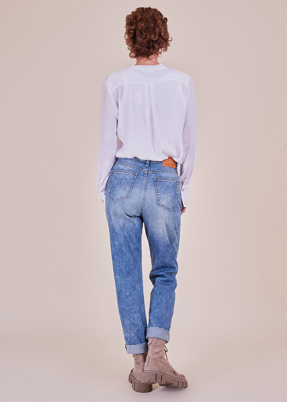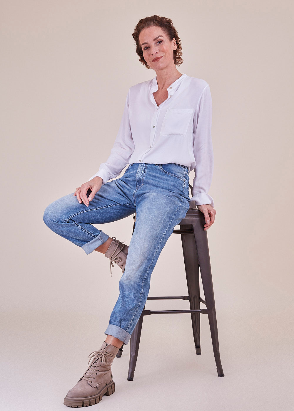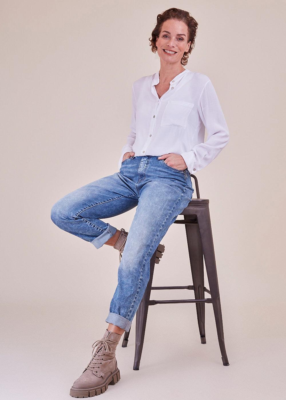 Stehkragen Bluse mit durchgehender Knopfleiste aus einem fließenden Viskosematerial.  Sie lange Arme die in einer Manschette enden. Ein großartiger Kombinationsartikel.