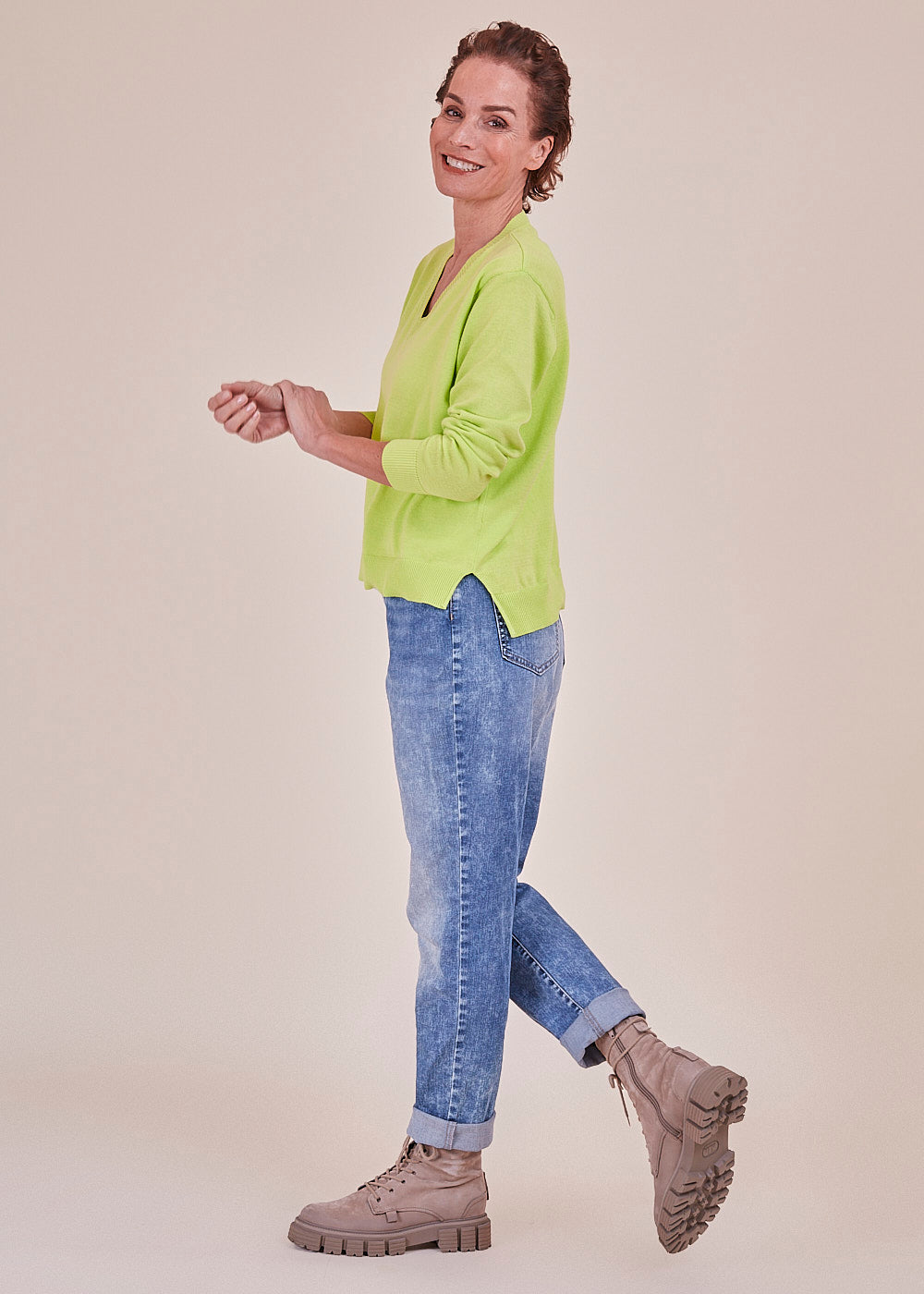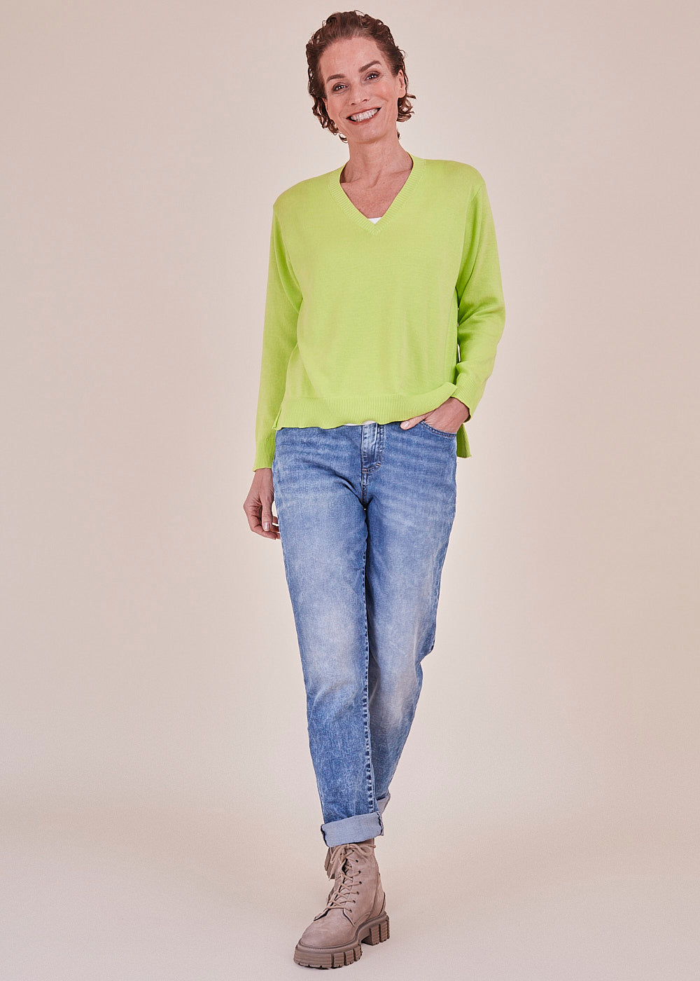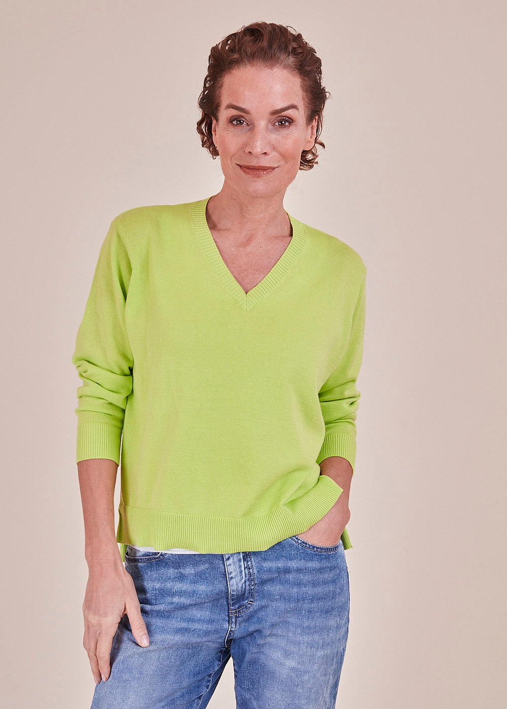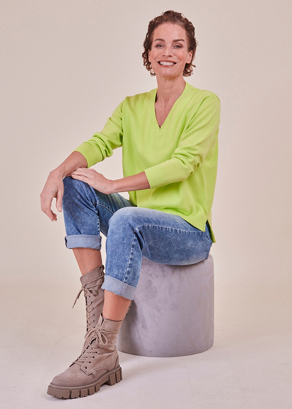 Dieser besondere Pullover, in einem wunderschönen Limonen Ton, kann im Alltag absolut überzeugen. Der V-Pullover besteht aus einer weichen Strickqualität und ist vielseitig kombinierbar. Klassische Elemente wie der V-Ausschnitt, die langen Ärmel und der gerade Saum machen den Strickpulli zu einem Basic-Allrounder. Mit besonderen Rippendetails am Ausschnitt, Saum und an den Ärmeln.