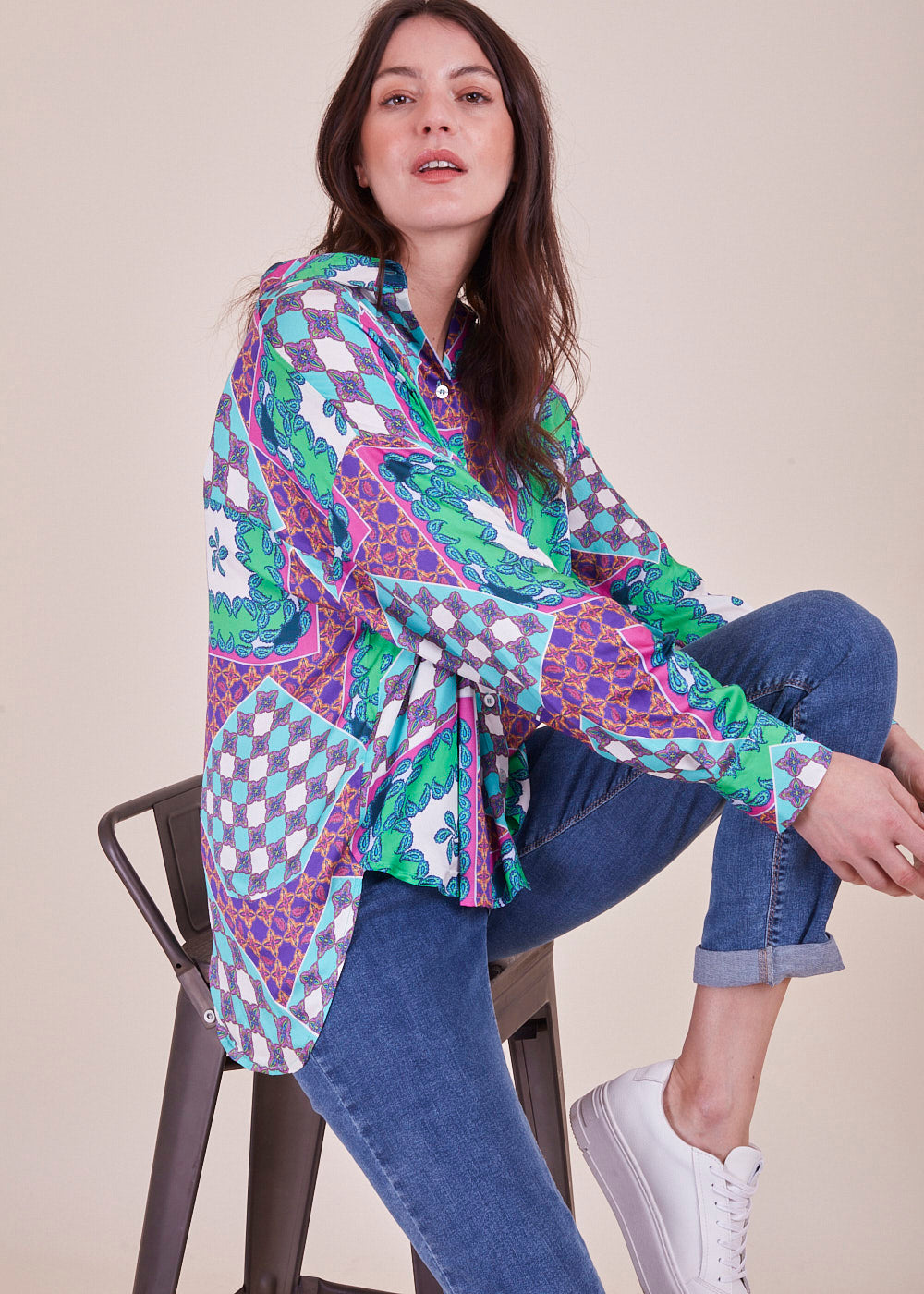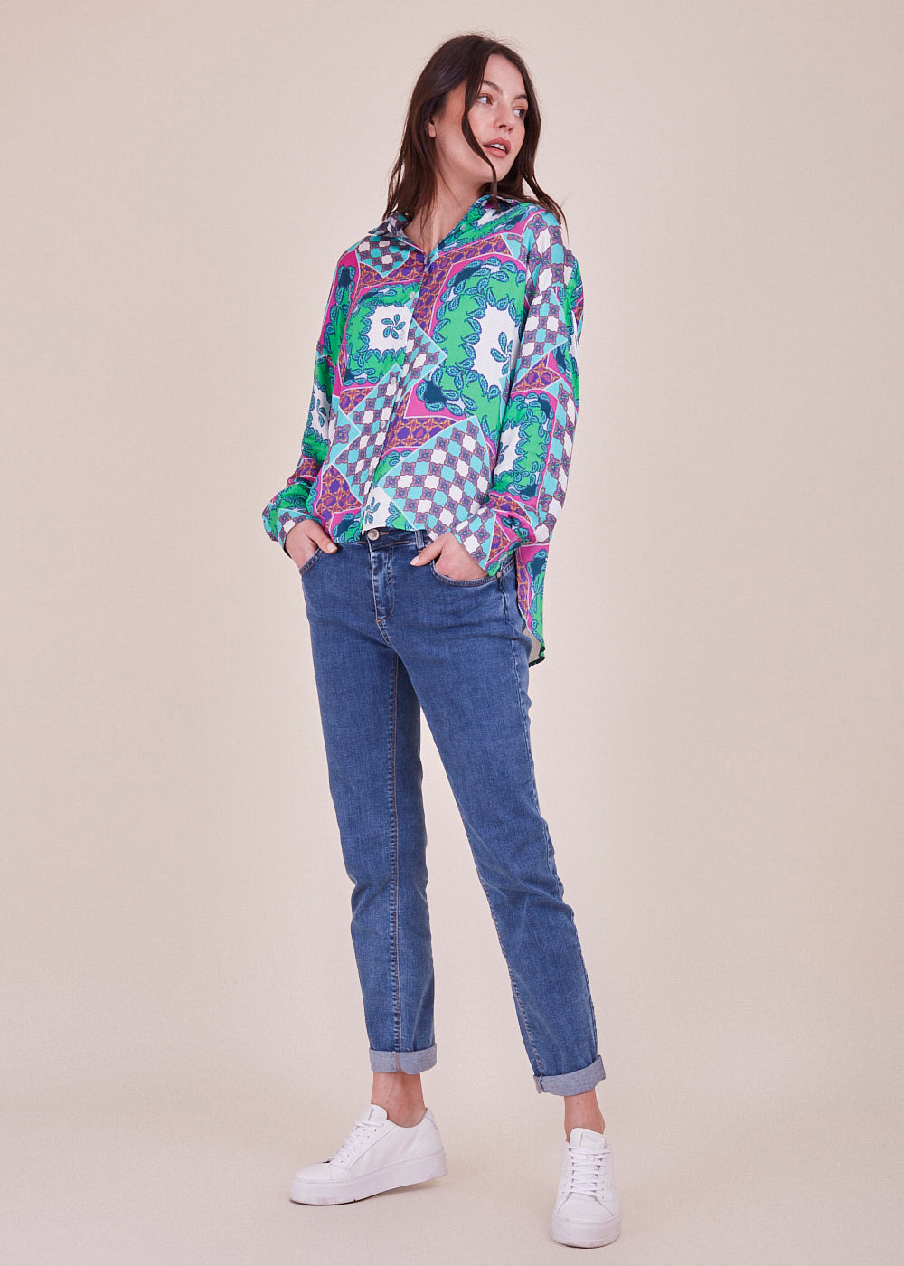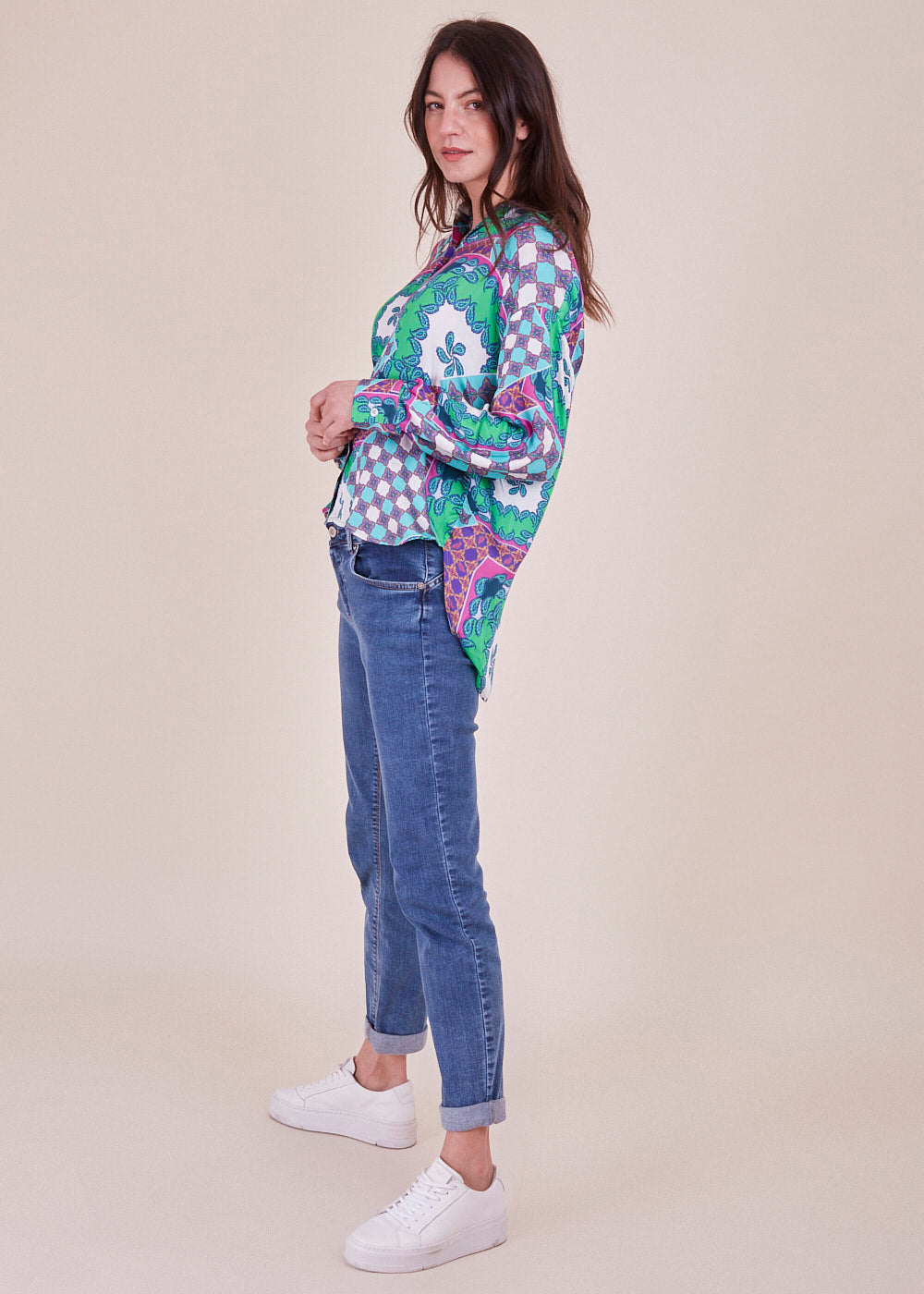Wir lieben Druck! Diese lässig fließende und lang geschnittene Viskosebluse in den neuen Trendfarben hat lange Ärmel mit überschnittenen Schultern. Durch ihr leichtes Viskosematerial hat sie einen angenehmen Tragekomfort. Sie hat eine durchgehende Knopfleiste. Du kannst diese länger geschnittene Bluse wunderbar mit einer Skinny Jeans und Sneakern kombinieren.