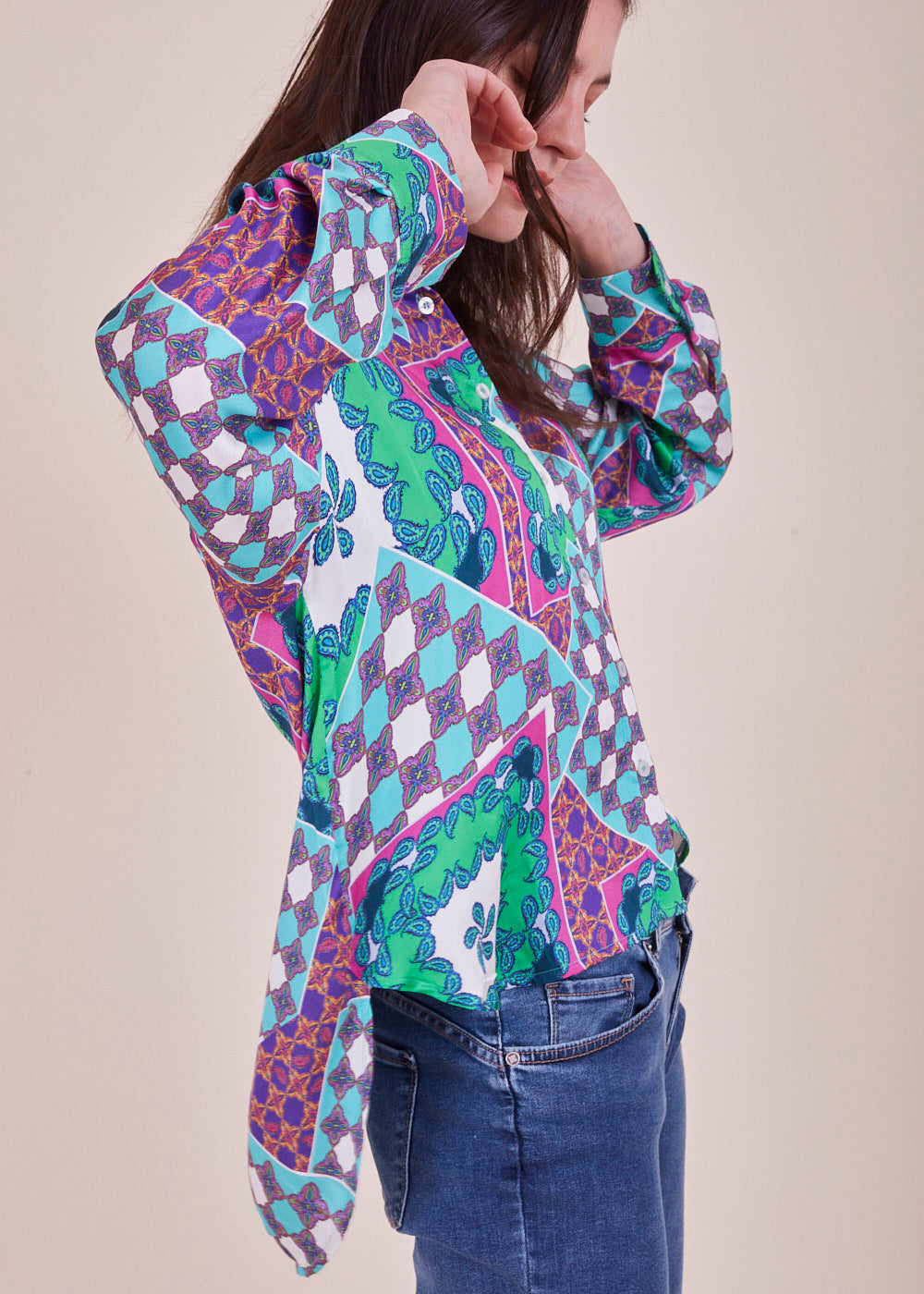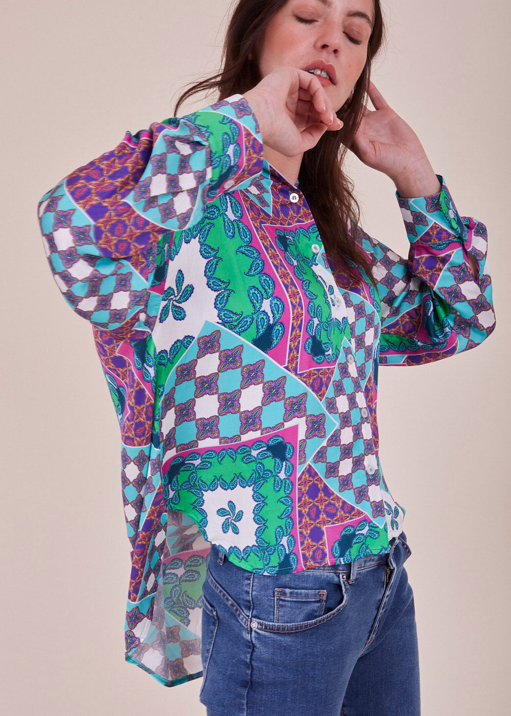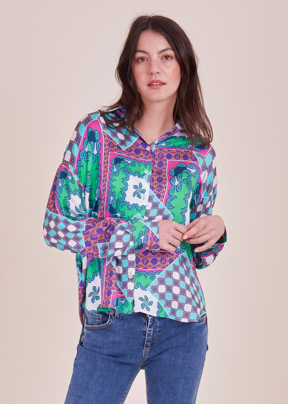 Wir lieben Druck! Diese lässig fließende und lang geschnittene Viskosebluse in den neuen Trendfarben hat lange Ärmel mit überschnittenen Schultern. Durch ihr leichtes Viskosematerial hat sie einen angenehmen Tragekomfort. Sie hat eine durchgehende Knopfleiste. Du kannst diese länger geschnittene Bluse wunderbar mit einer Skinny Jeans und Sneakern kombinieren.
