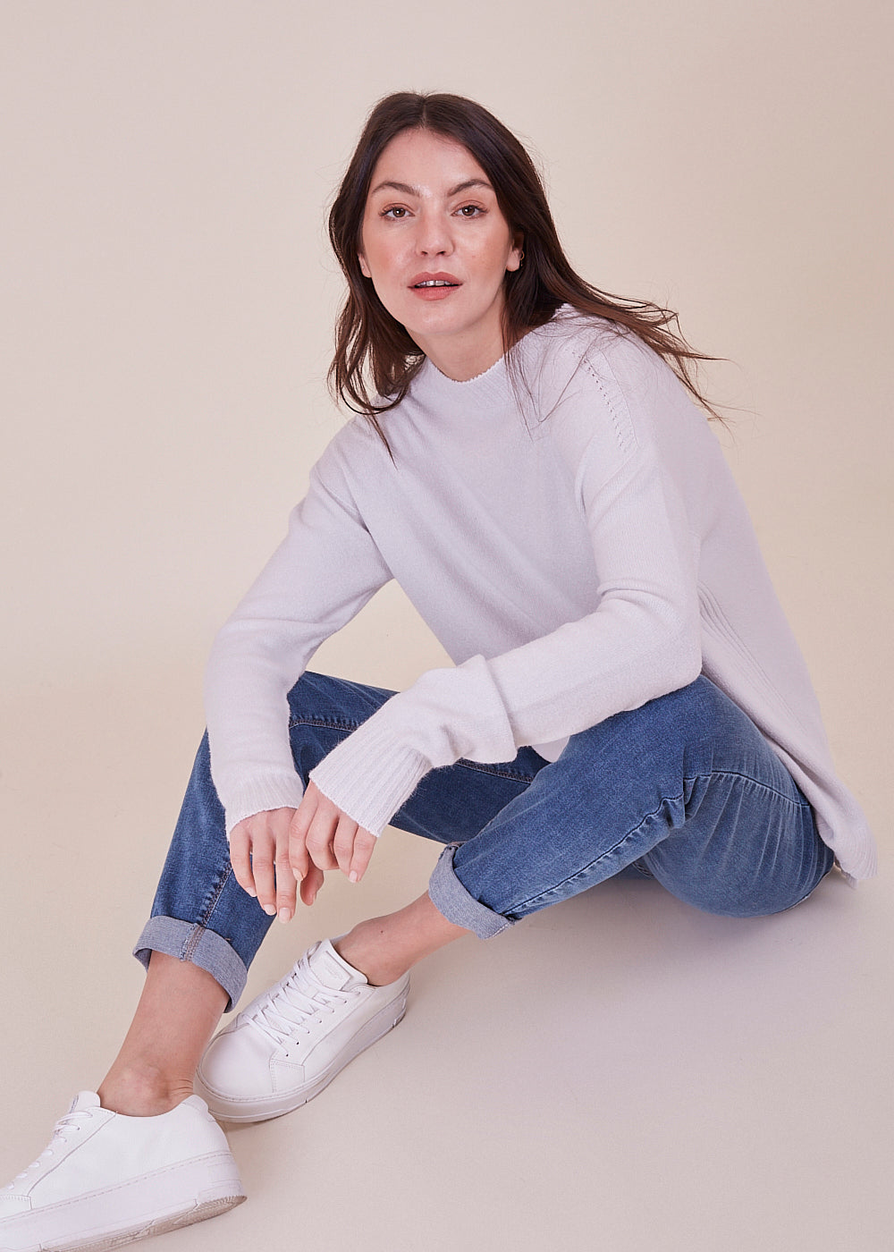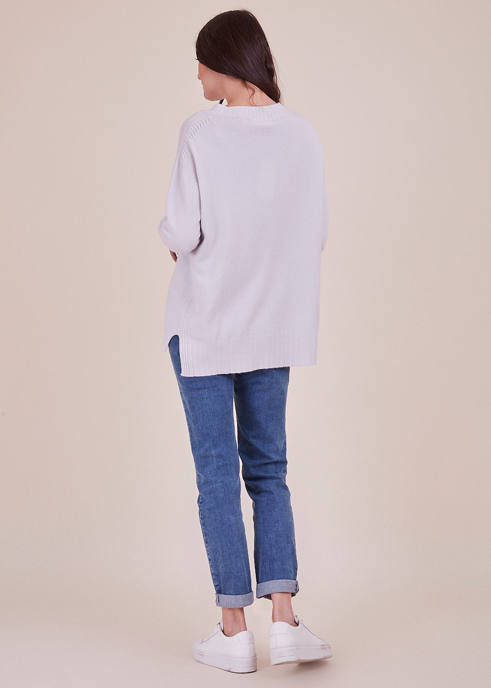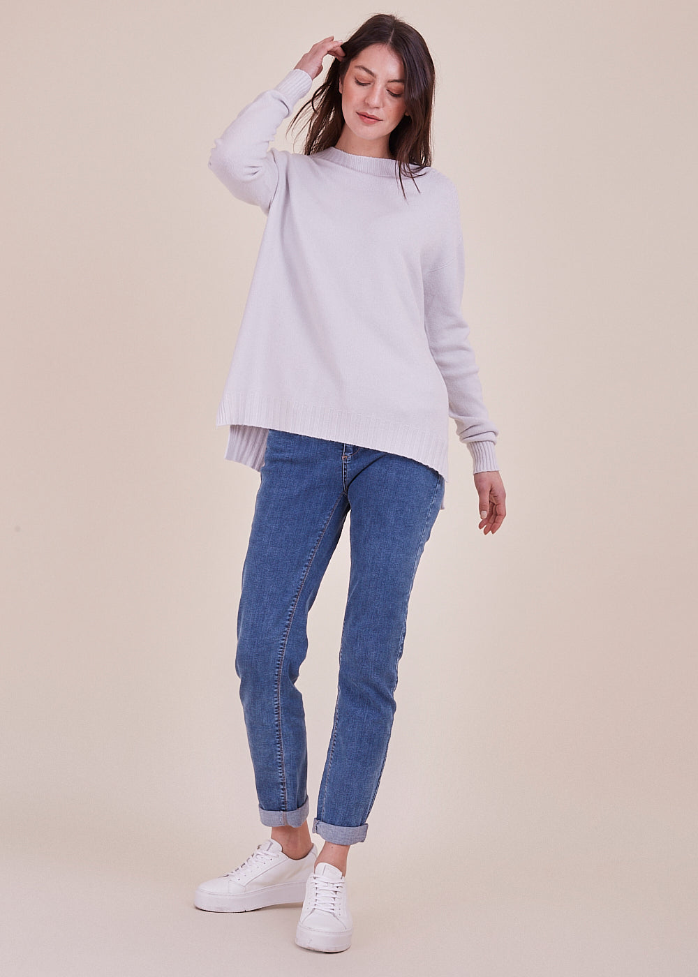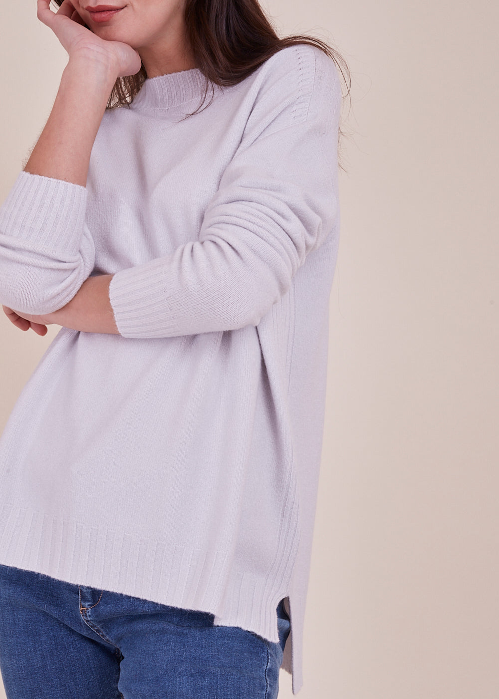 Kuscheliger Pullover mit Rundhalsschnitt und lässigen Schnitt. Der wundervolle, helle Ton verleiht jedem Frische. Mit breitem Rippenbündchen am Ausschnitt, Ärmel und Saum. Seitliche Schlitze. Mit einem leicht verlängerten Rückenstück.