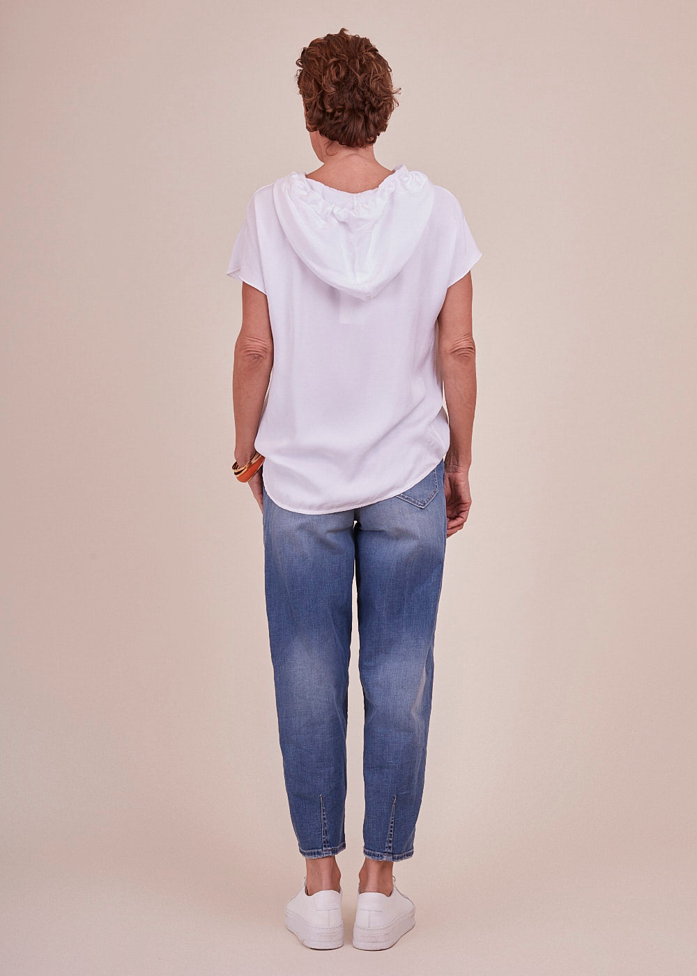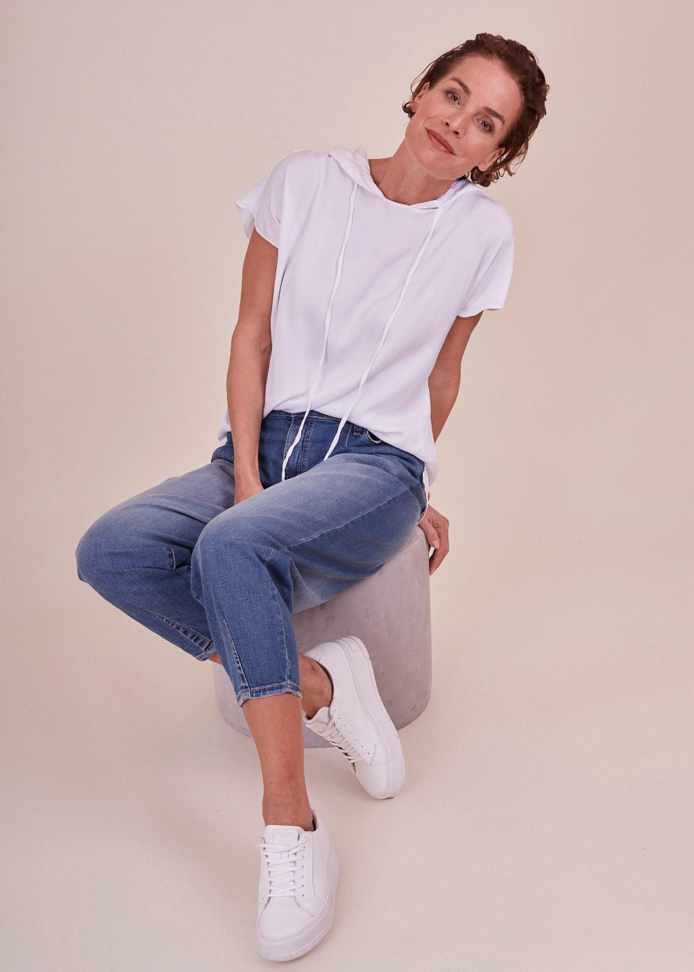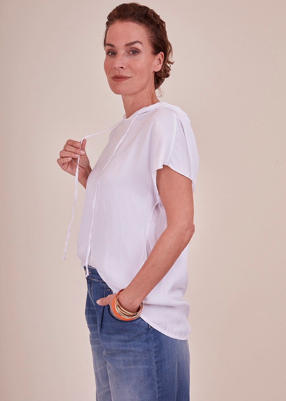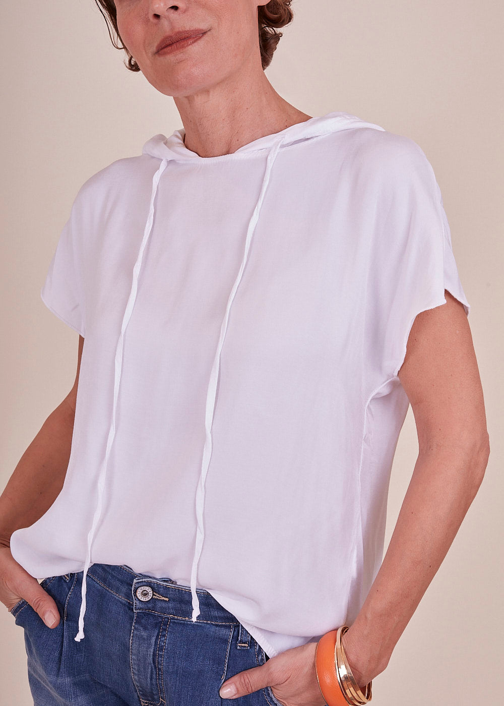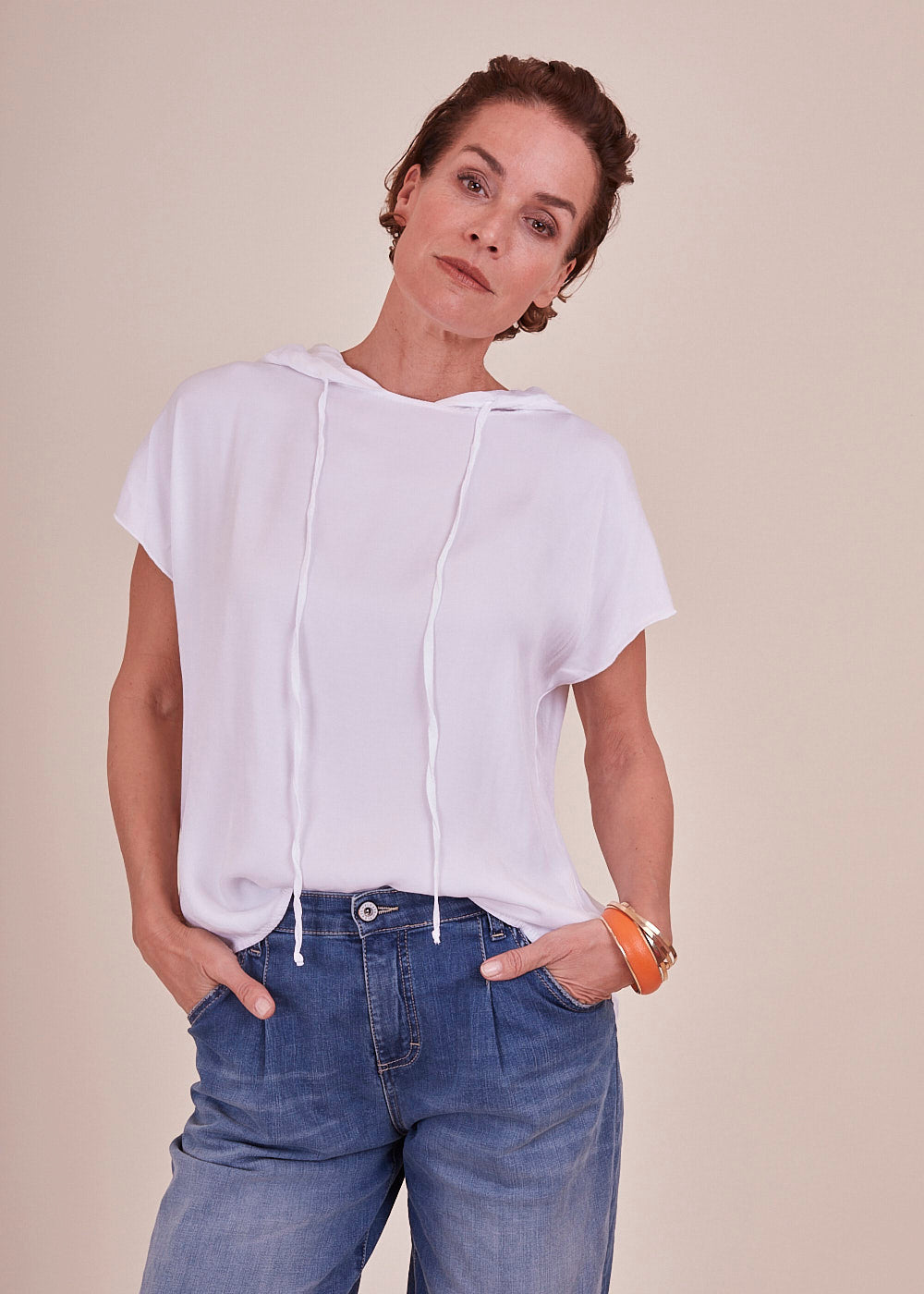 Locker geschnittene Bluse aus einem schönen Viskosemixmaterial. Im sportlichen Hoodie Style überrascht sie mit ihrer Kapuze. Mit kurz geschnittenen Armen und Banddetails.