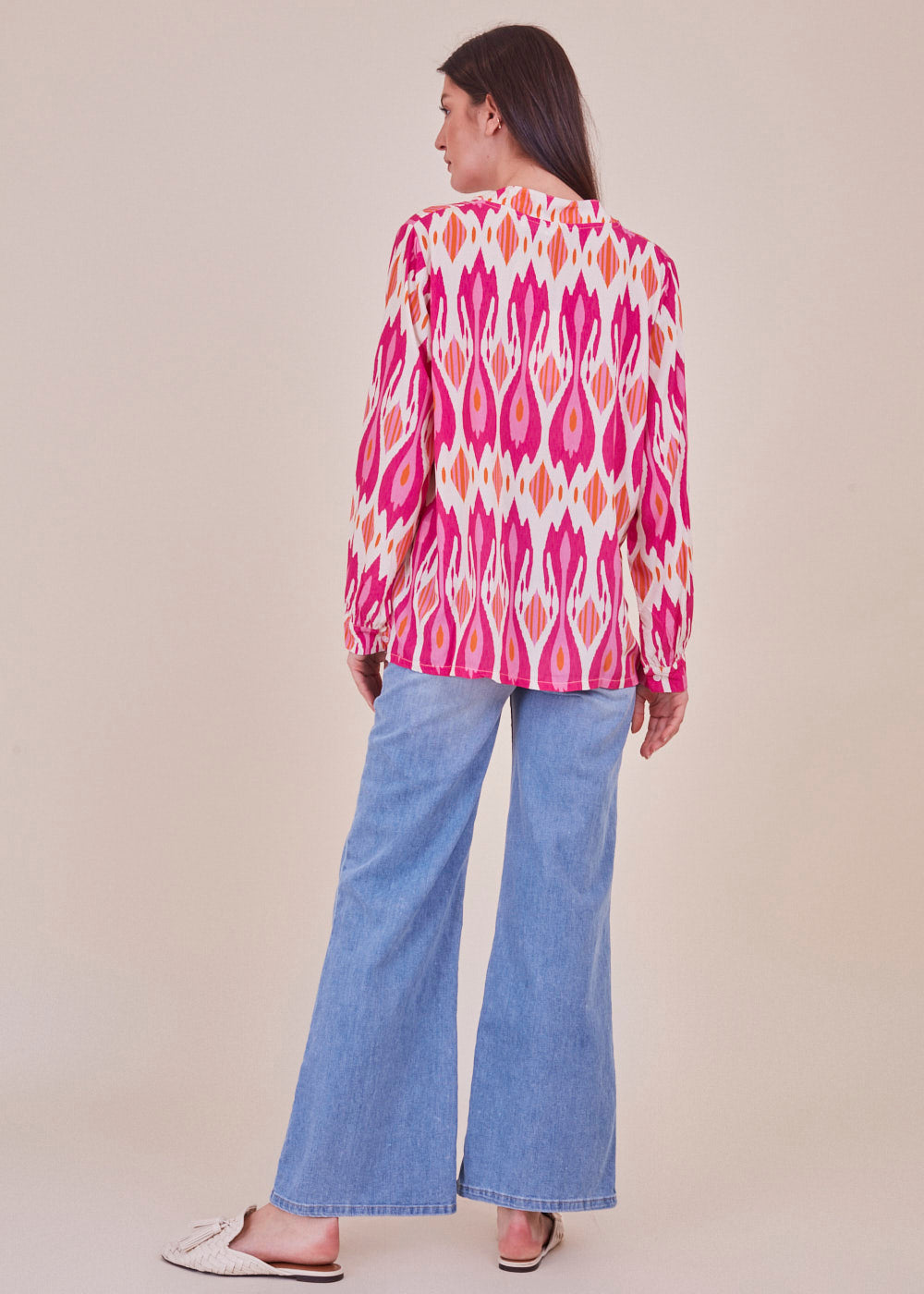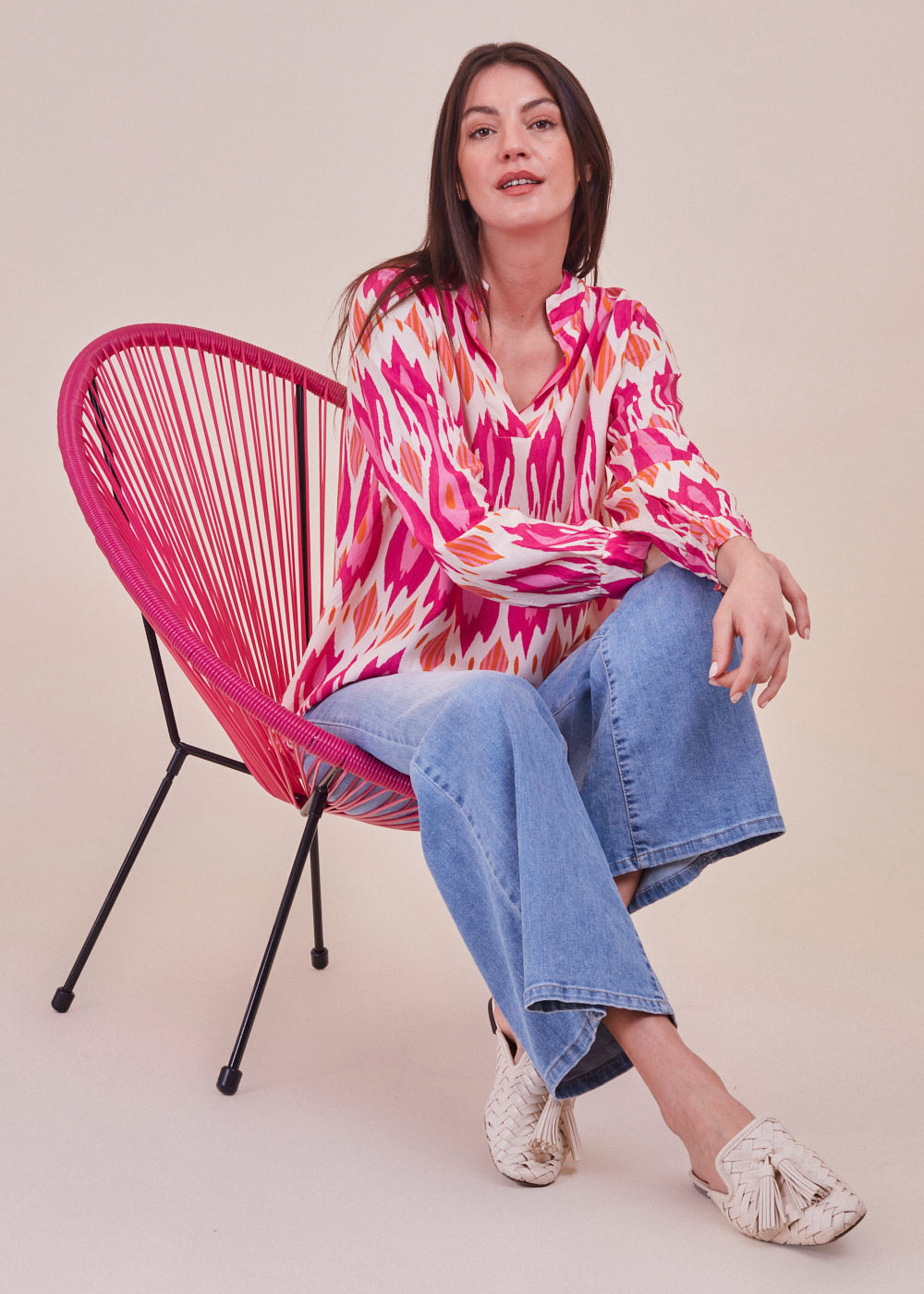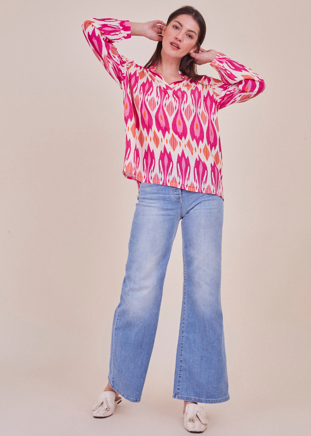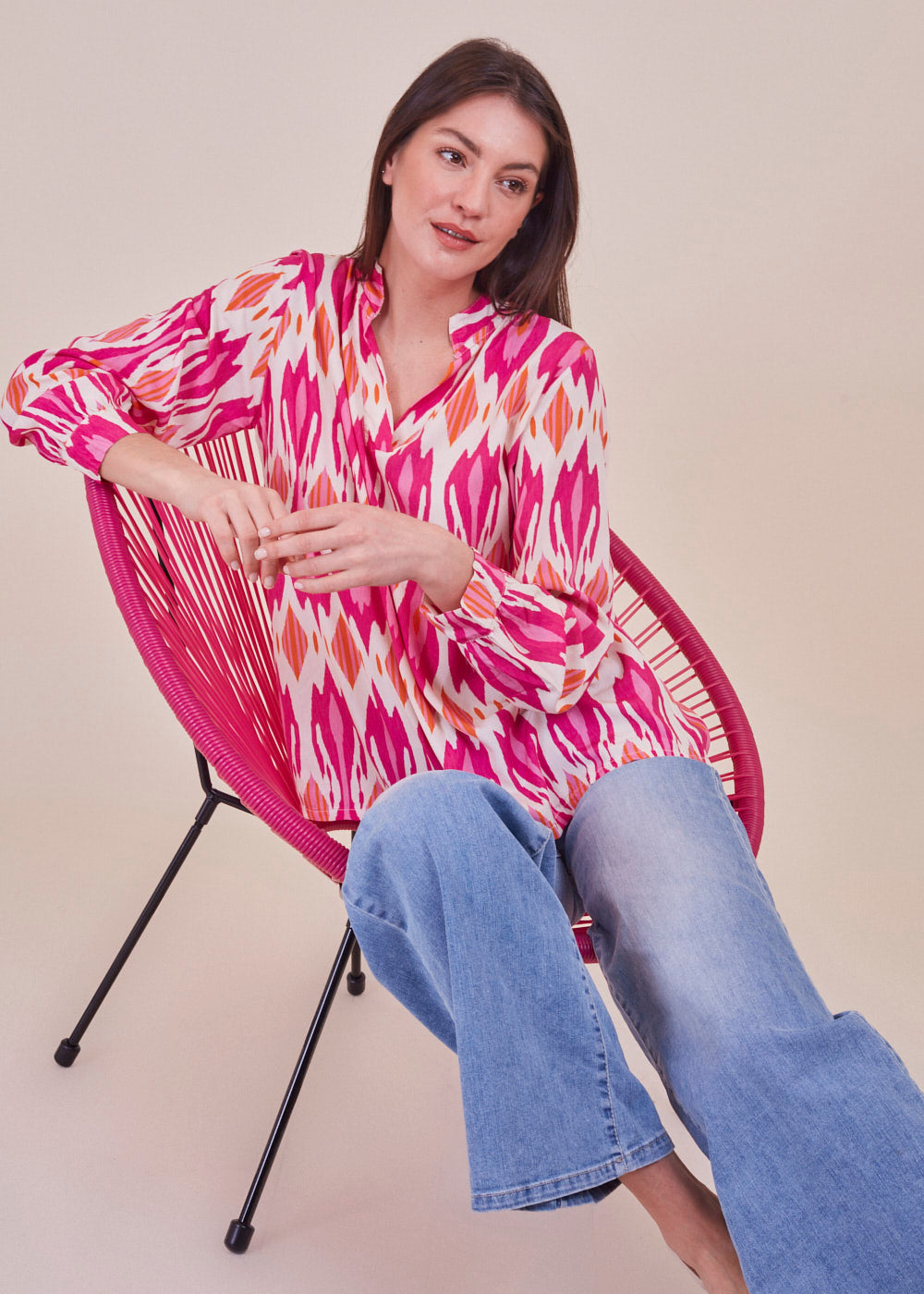 Wir lieben Print! Diese lässig fließende Viskosebluse in den neuen Trendfarben hat lange Ärmel mit überschnittenen Schultern. Durch ihr leichtes Viskosematerial hat sie einen angenehmen Tragekomfort. Sie hat durchgehende Knopfleiste. Ein absoluter Hingucker.