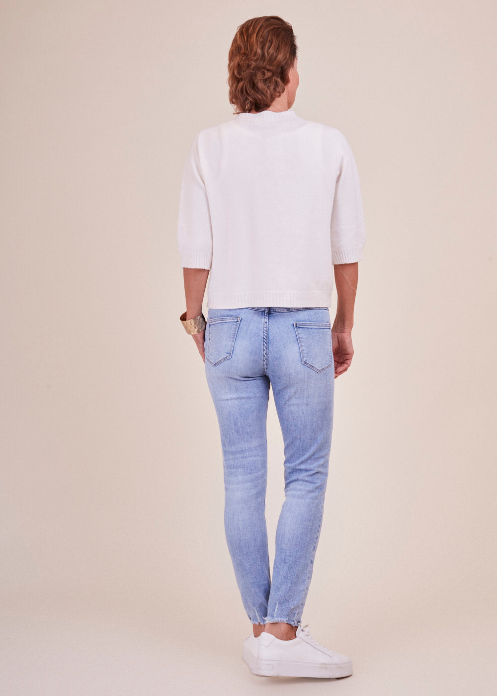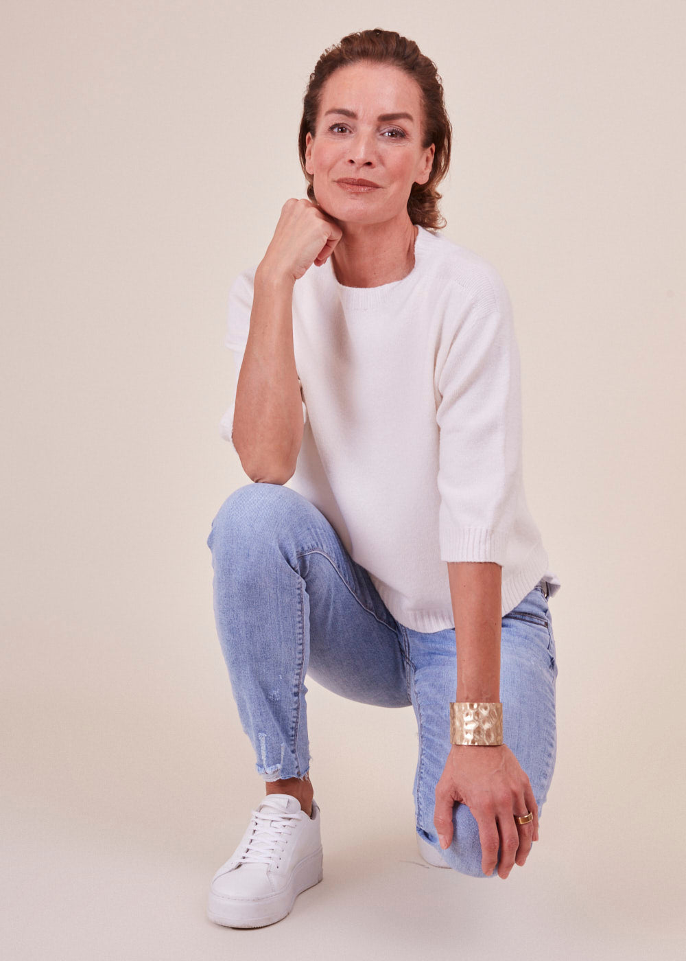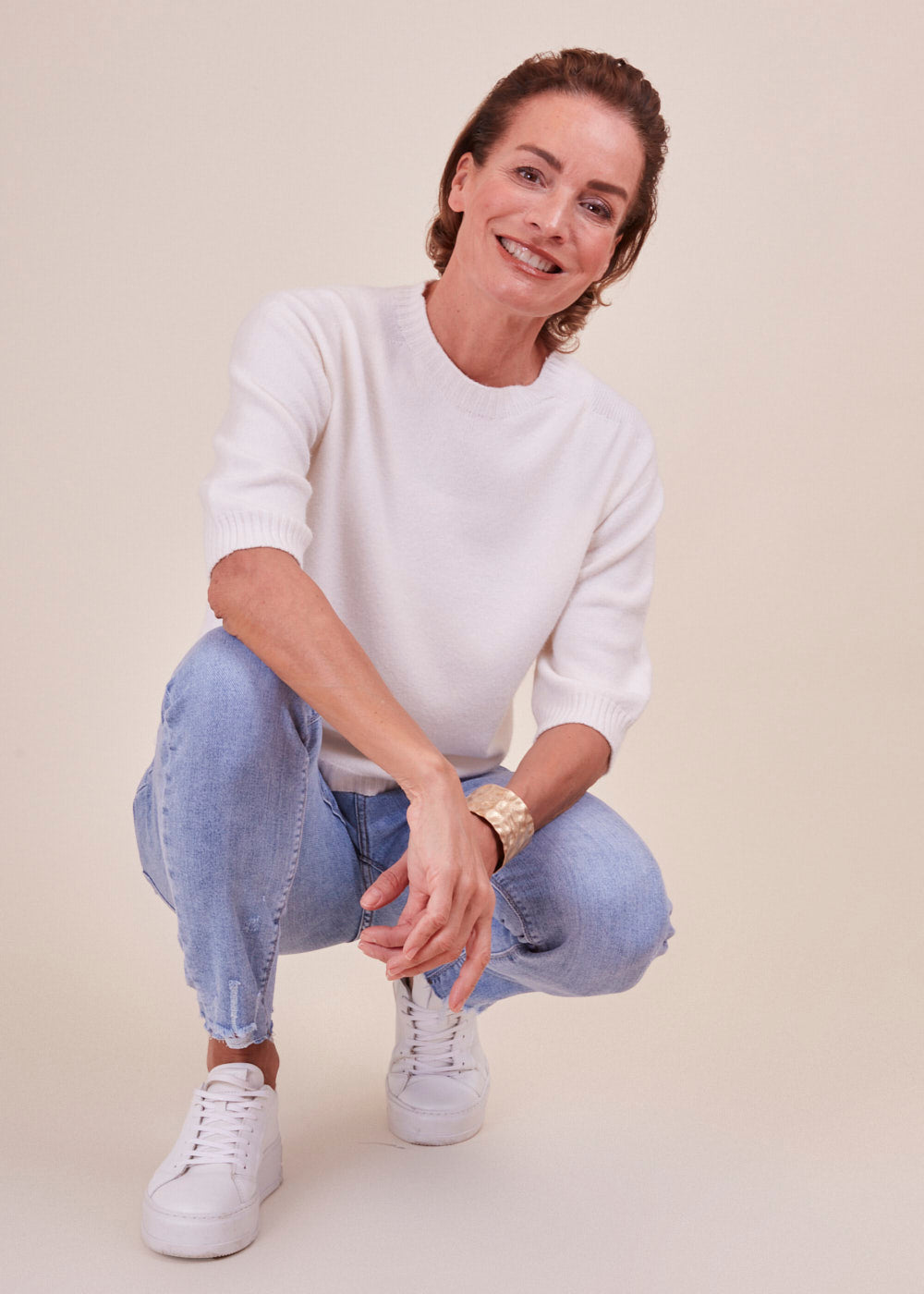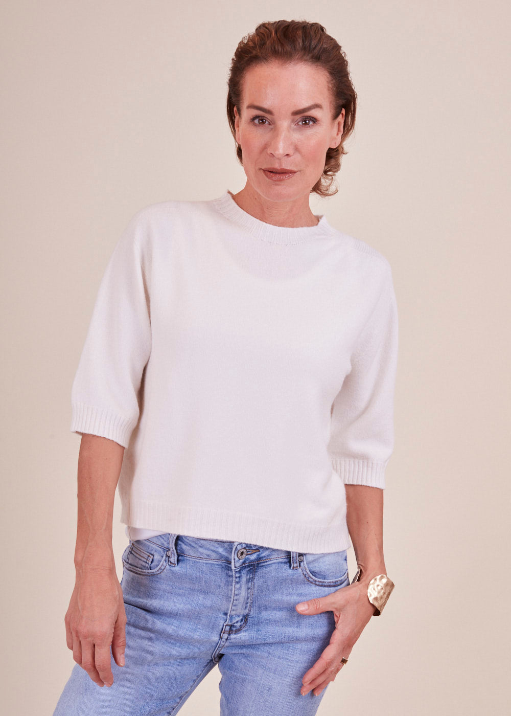 Kurz geschnittener Strickpullover mit Stehkragen aus unserem Kuschelgarn. Er hat ein Rippenbündchen am Kragen und an den Ärmeln. Mit kurz geschnittenen Armen.