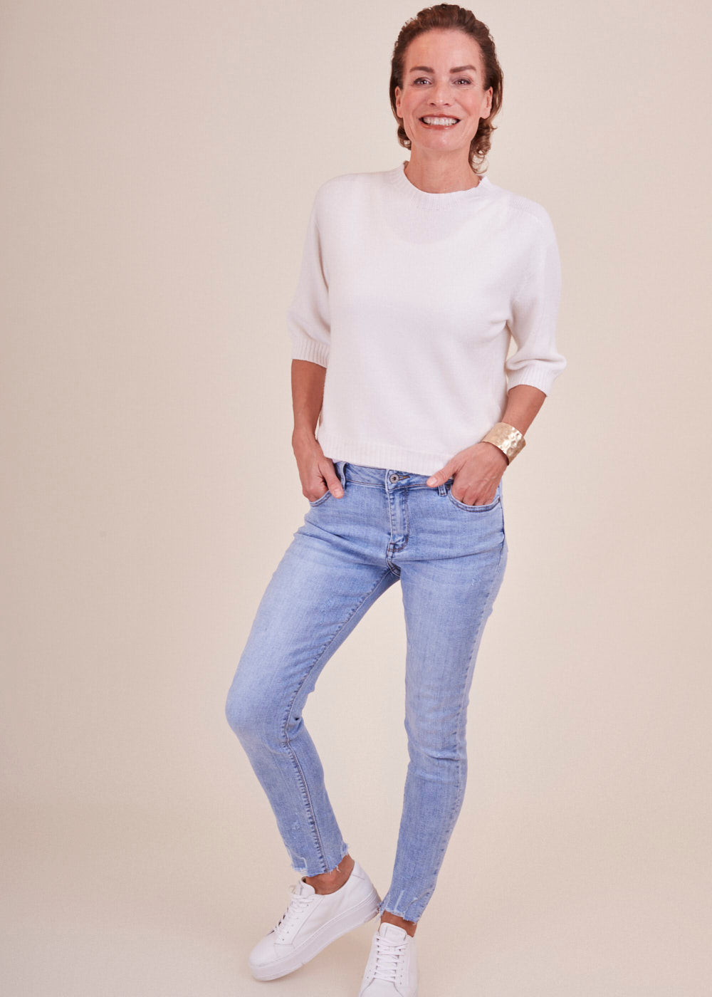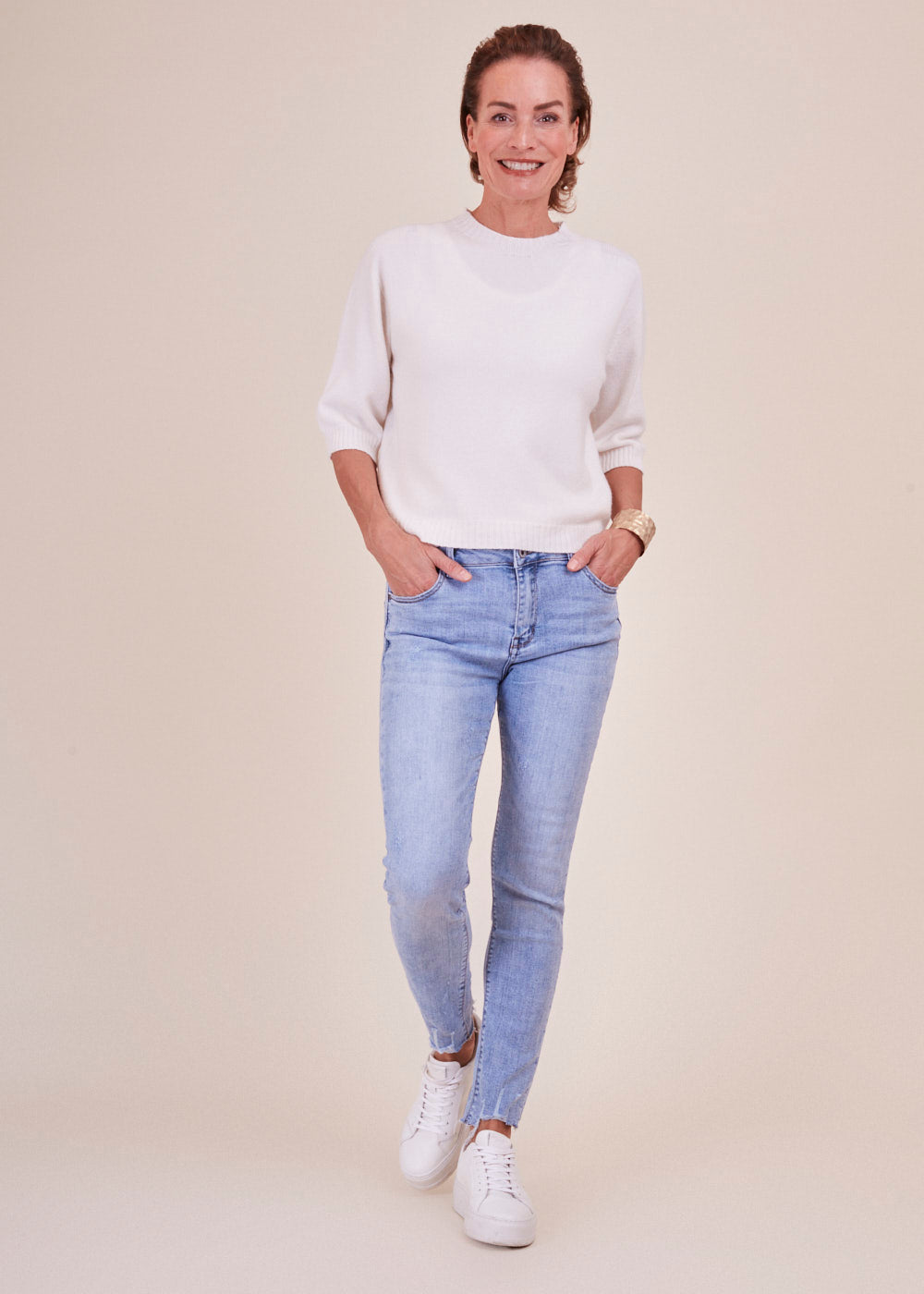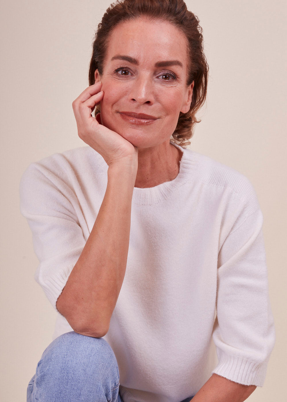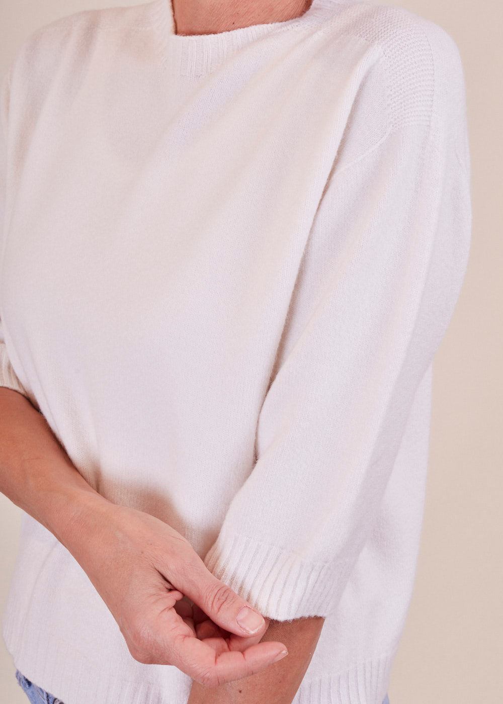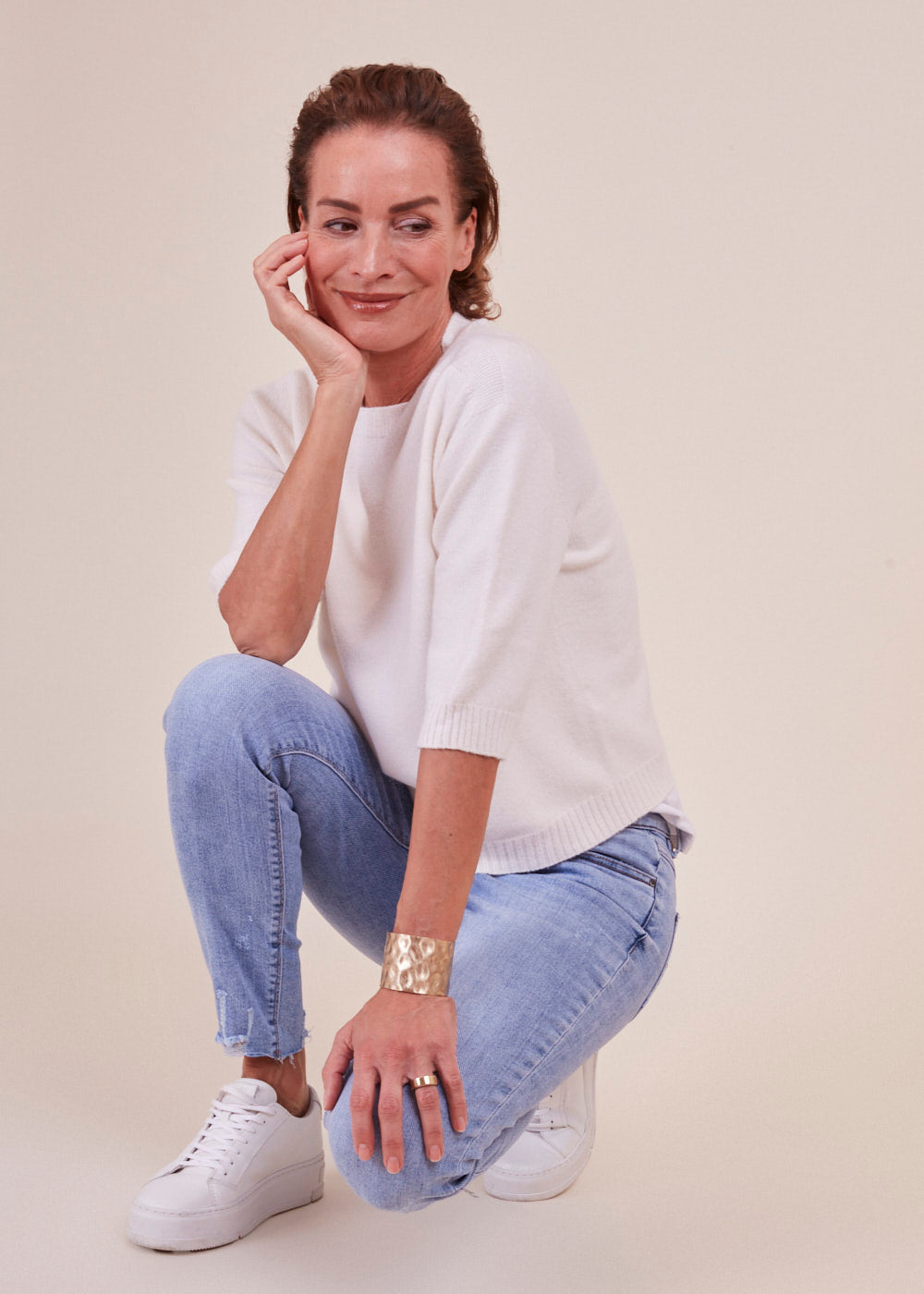 Kurz geschnittener Strickpullover mit Stehkragen aus unserem Kuschelgarn. Er hat ein Rippenbündchen am Kragen und an den Ärmeln. Mit kurz geschnittenen Armen.