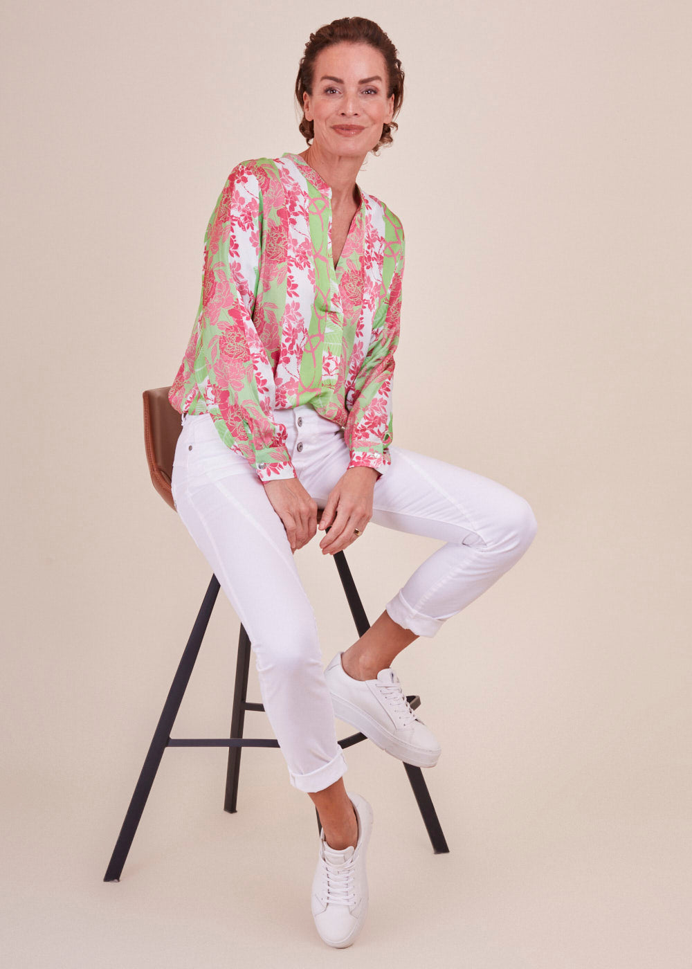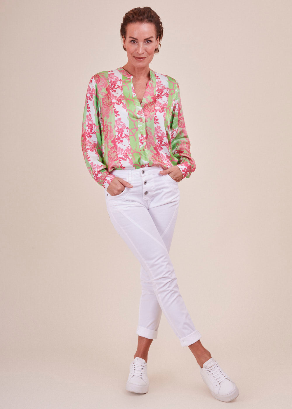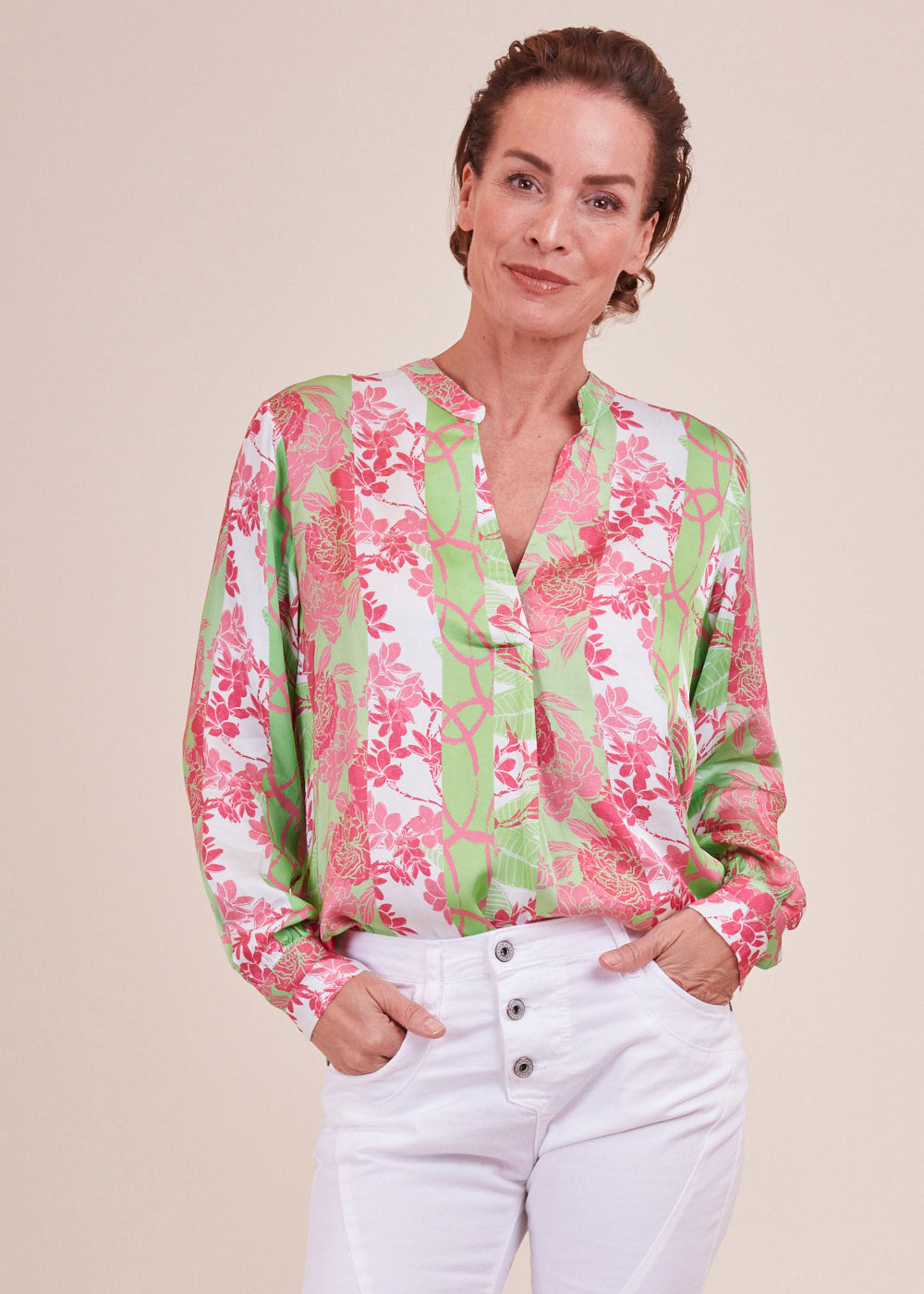 Zieht alle Blicke auf sich - diese Bluse mit Graphischen Druck in einer sensationellen Farbkombination. V-Ausschnitt mit angedeuteten Stehkragen. Lange Ärmel mit 1-Knopfmanschette. Figurumspielende Schlupfbluse mit einem verlängerten Rückenteil. Aus einem weich fließenden Seidenmix.