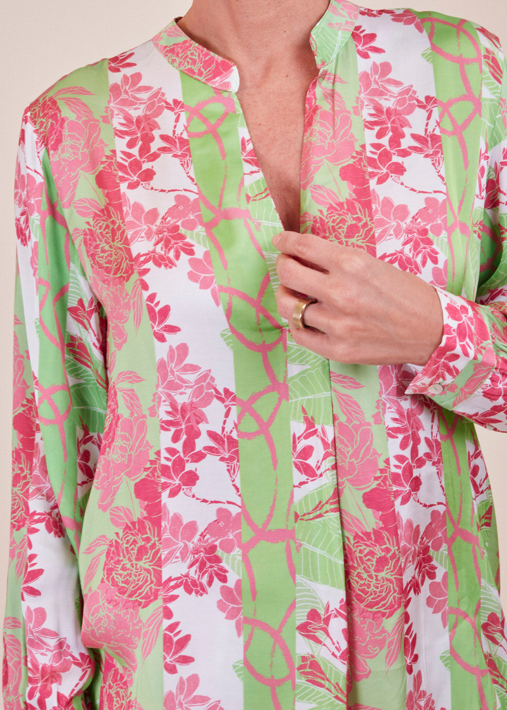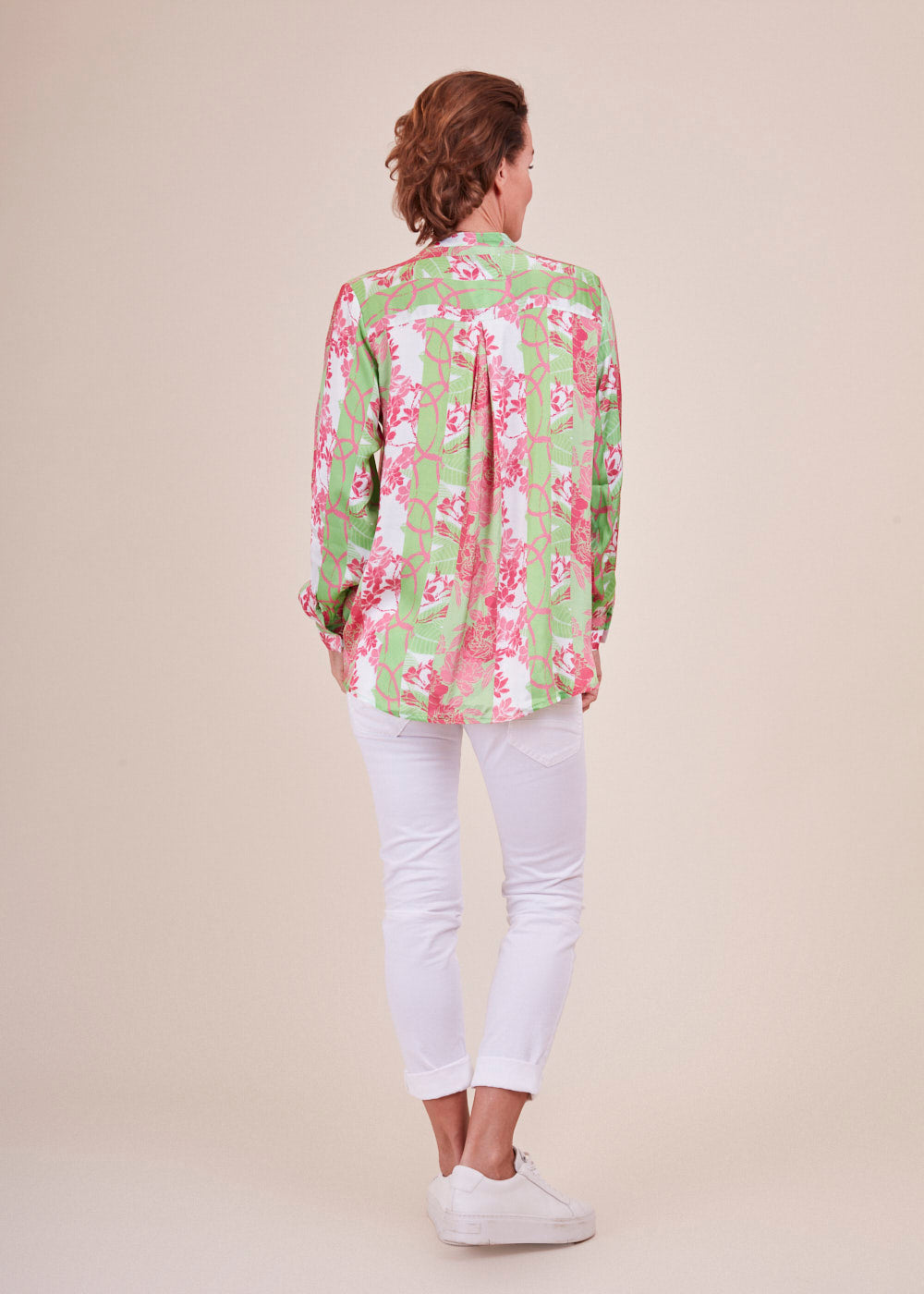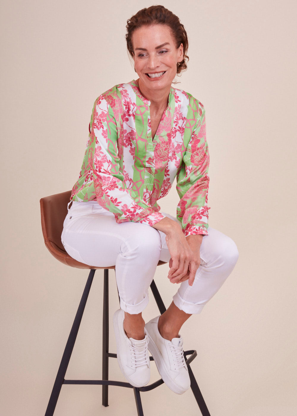 Zieht alle Blicke auf sich - diese Bluse mit Graphischen Druck in einer sensationellen Farbkombination. V-Ausschnitt mit angedeuteten Stehkragen. Lange Ärmel mit 1-Knopfmanschette. Figurumspielende Schlupfbluse mit einem verlängerten Rückenteil. Aus einem weich fließenden Seidenmix.