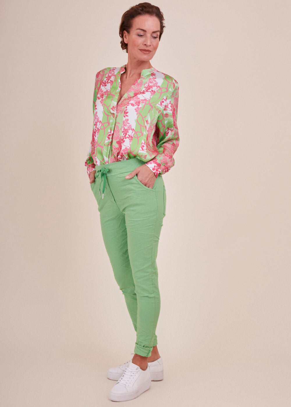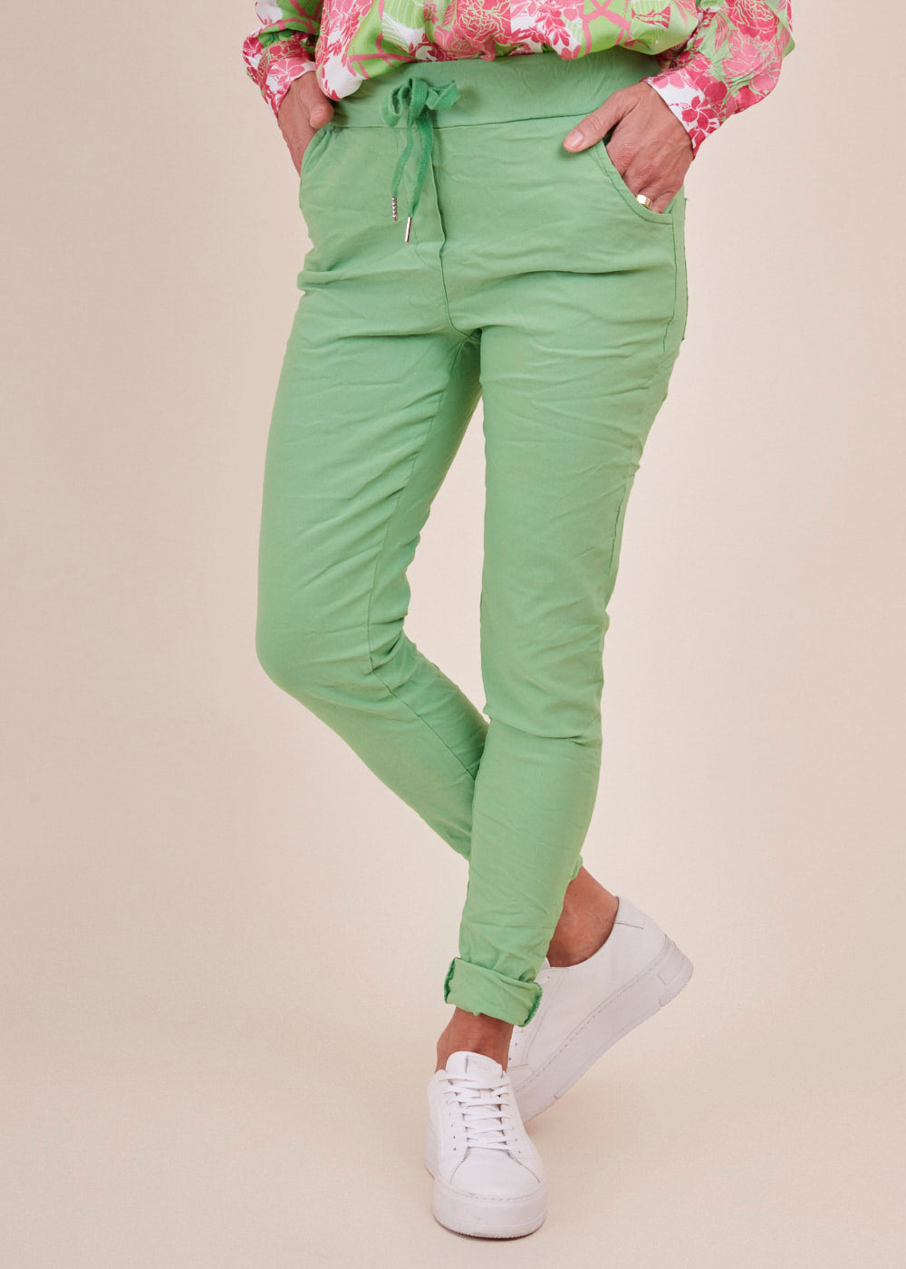 Wir haben Lust auf Farbe! Unser Bestseller! Hose aus Viskose und Elasthan-Anteil. Dadurch sitzt sie super bequem und lässt sich prima zu Allem kombinieren. Gummizug im Bund, Tunnelzug mit Band und seitliche Eingriffstaschen.