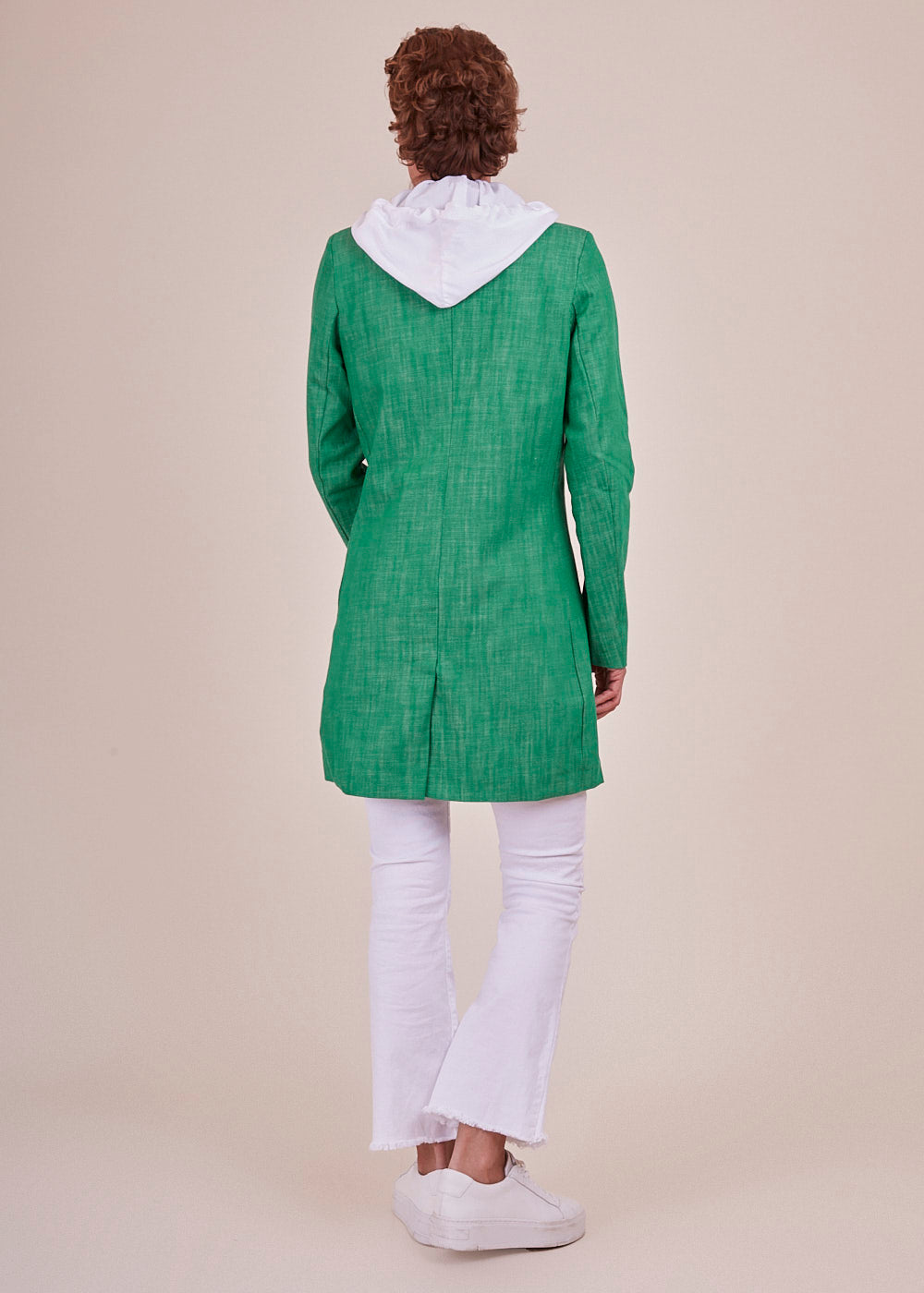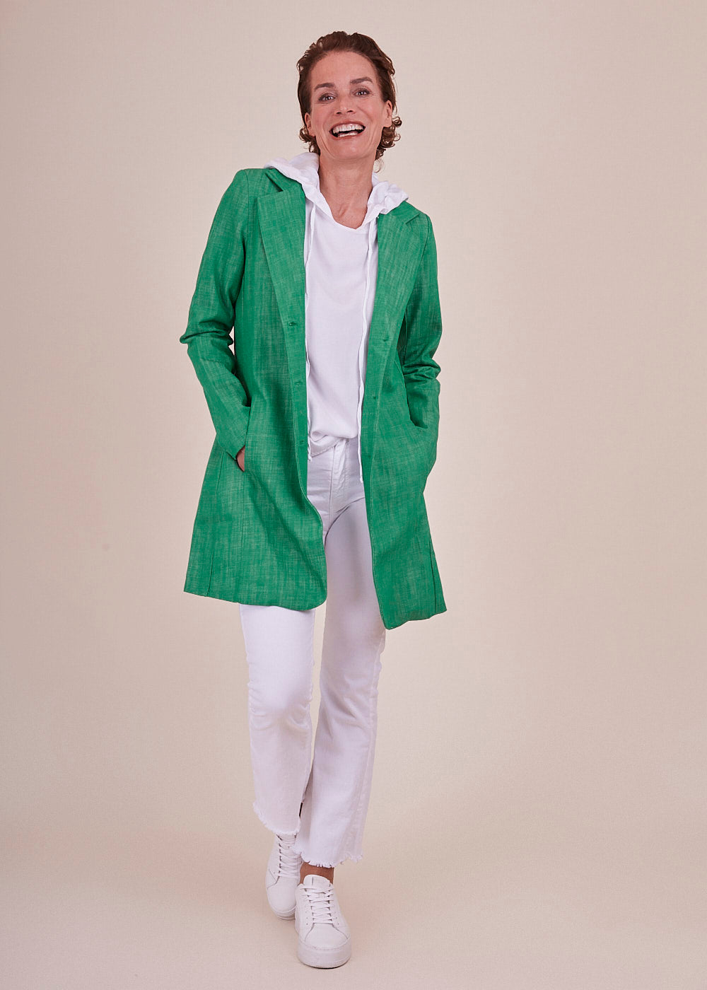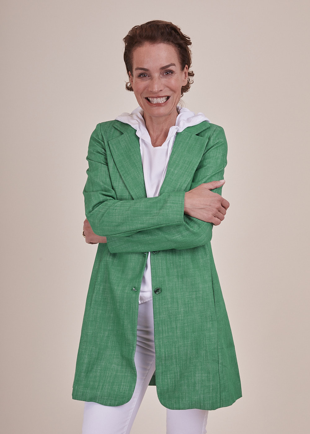 Länger geschnittener Blazer in einem großartigen Design. Er hat seitliche Eingriffstaschen und eine Knopfleiste. Die gekonnte Schnittführung zaubert eine feminine Silhouette. Wer es etwas legerer mag, kann ein lässiges Outfit aus Jeans und Shirt mit der stylischen Jacke aufpeppen. Stilvoller und zeitloser Begleiter.