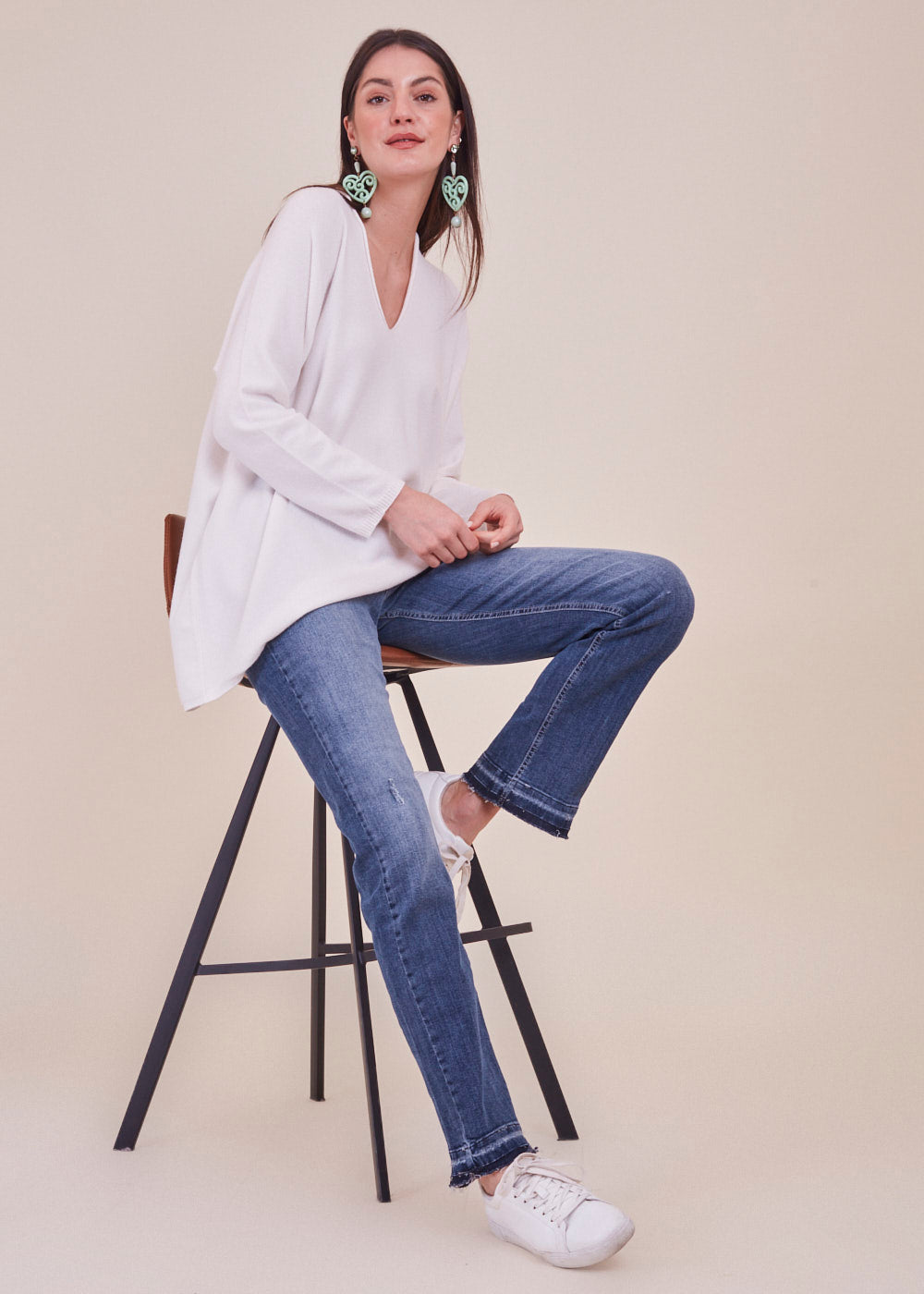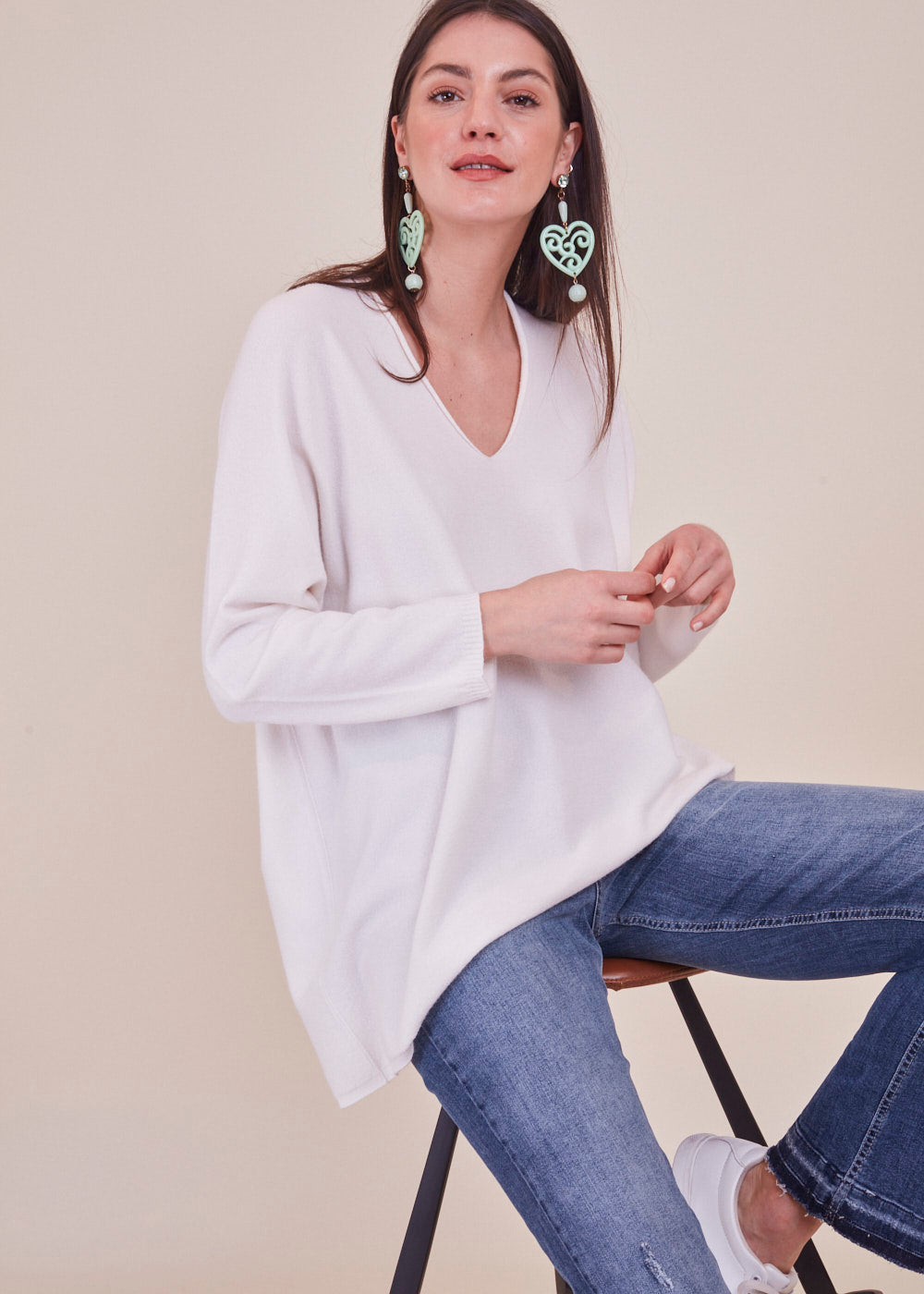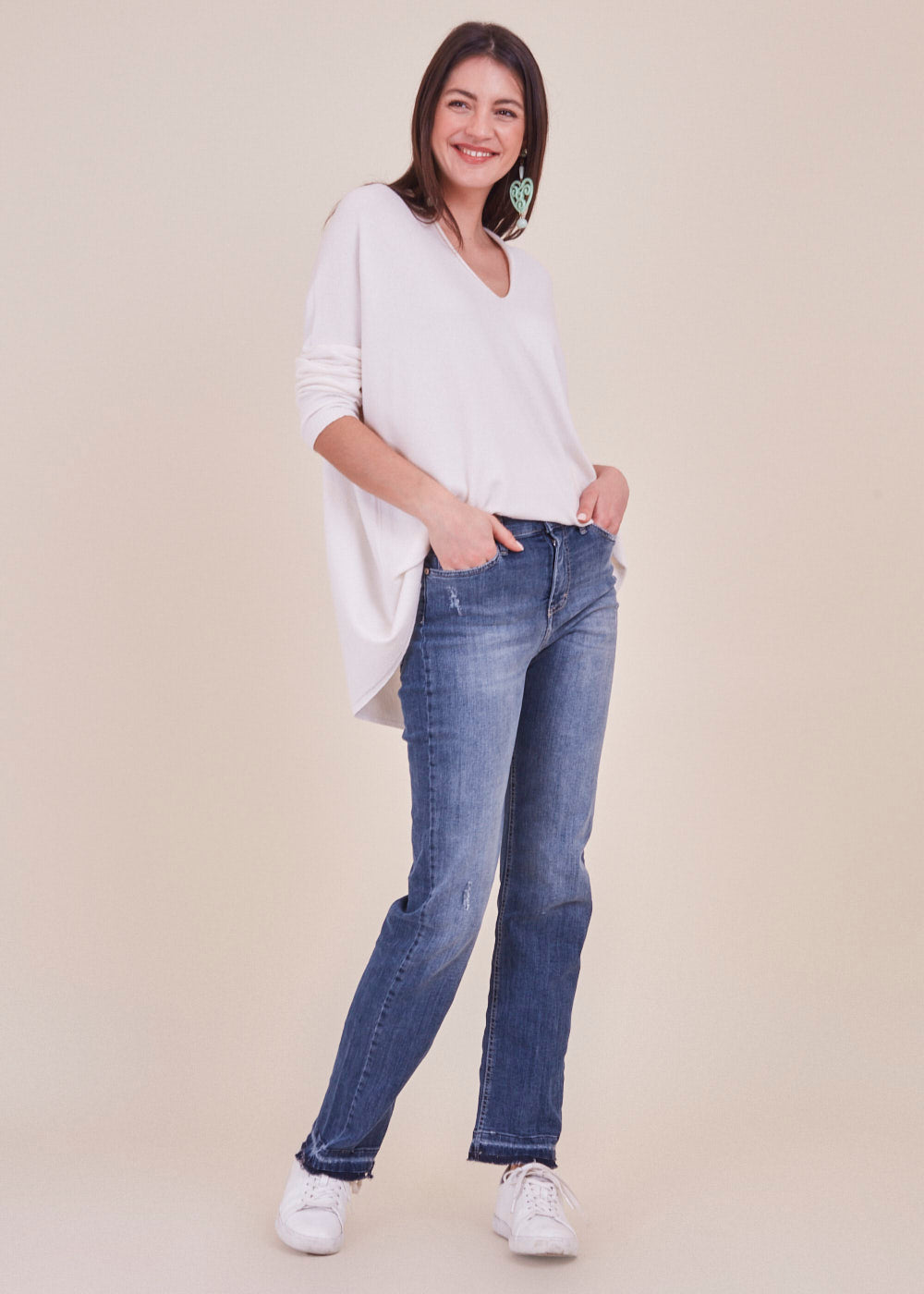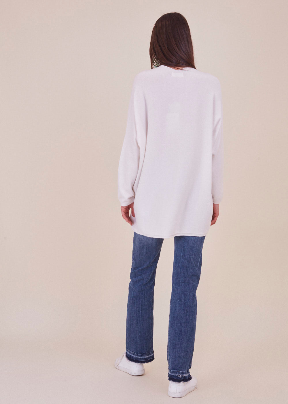 Leichter und gemütlicher Oversizepullover mit V-Ausschnitt. Mit überschnittenen Ärmeln aus unserem Kuschelgarn. Rippenbündchen an den Ärmeln und Schlitzen an den Seiten. Einfach zum Wohlfühlen. Kombiniere diesen Artikel gerne mit einer unserer Please Skinny Jeans.