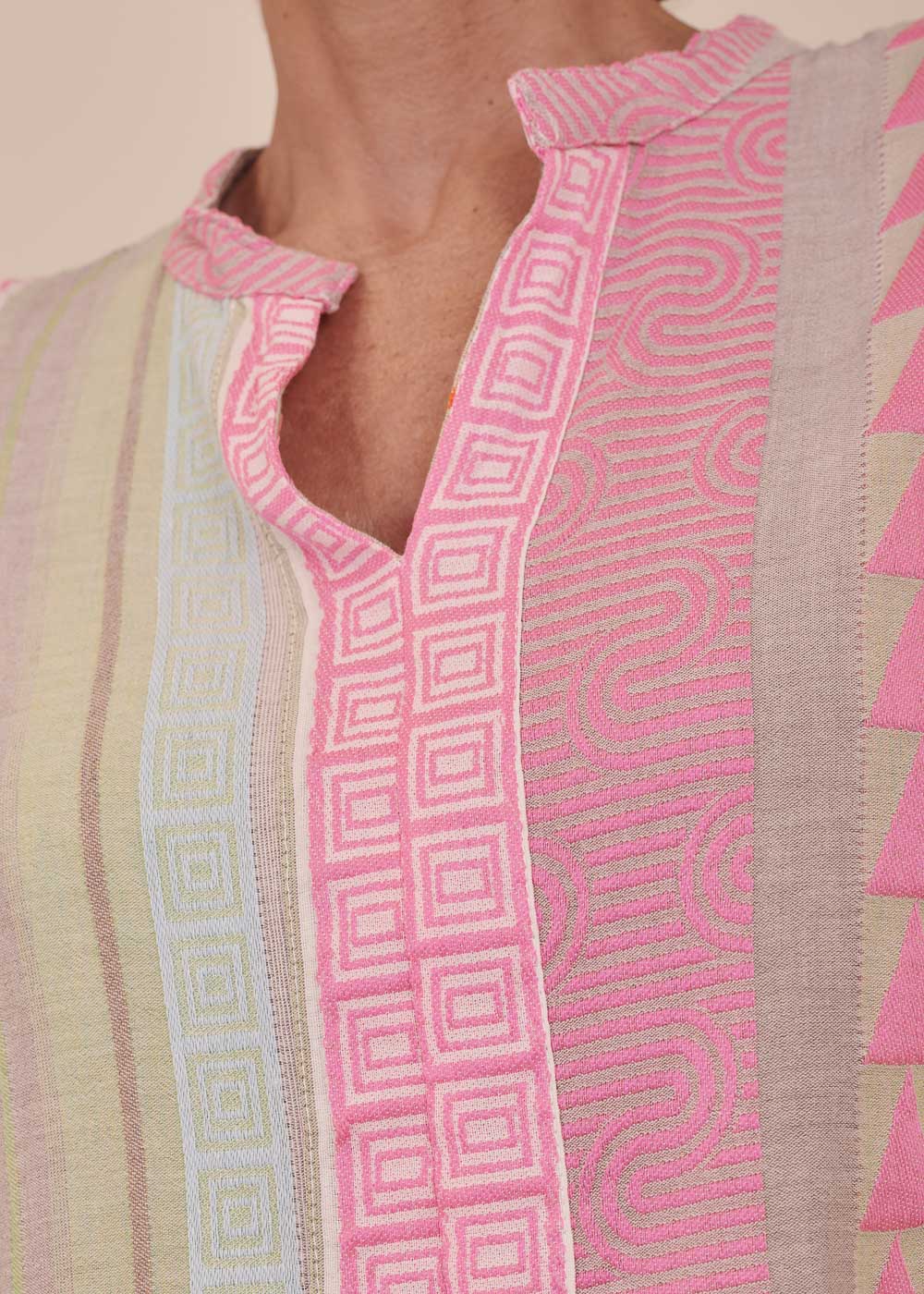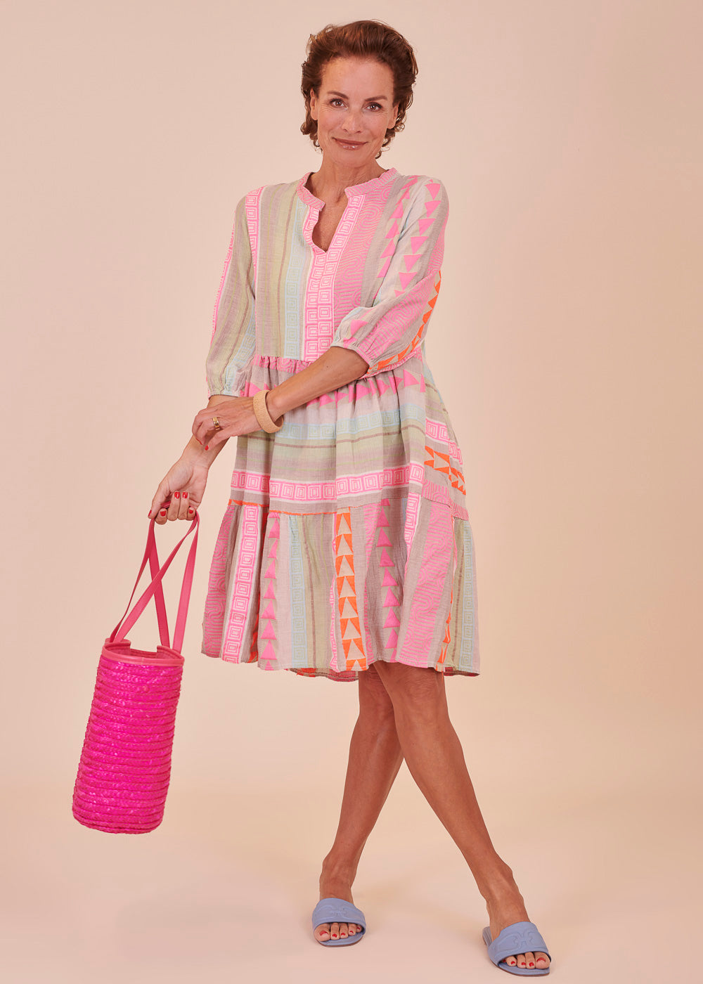 Das Must-Have der Saison. Unser Jaquardkleid in der kurzen Version! Der wunderschöne und farbenfrohe Print des Kleides lässt sich hervorragend mit einem kleinen Absatzschuh kombinieren. Durch seinen besonders lässigen Schnitt sitzt dieses Kleid besonders gemütlich und engt dich in deinem Alltag nicht ein. Auf der nächsten Gartenparty deiner Freundin, wirst du mit dieser besonderen Kleid, zum absoluten Blickfang.