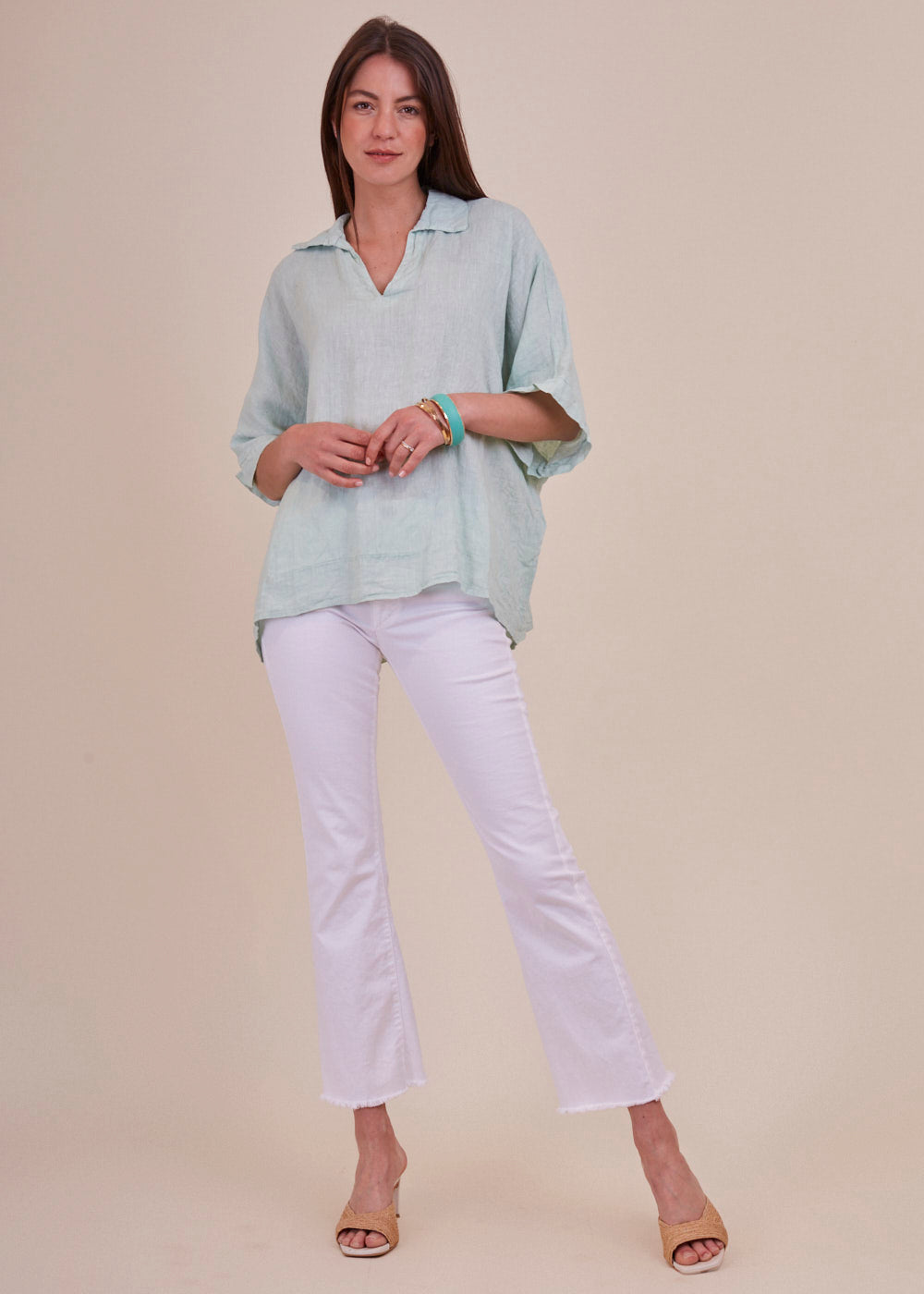 Locker leichte Leinenbluse mit kurzem Arm und besonderen Ausschnitt. Die sommerliche Tunika aus 100% kühlendem Leinen ist der ideale Begleiter für deinen nächsten Urlaub oder einen gemütlichen Stadtbummel mit der besten Freundin.