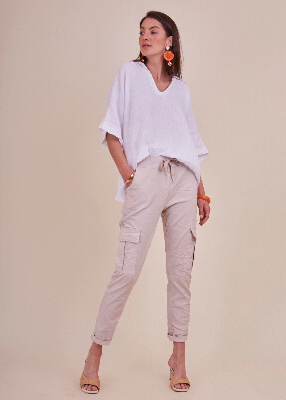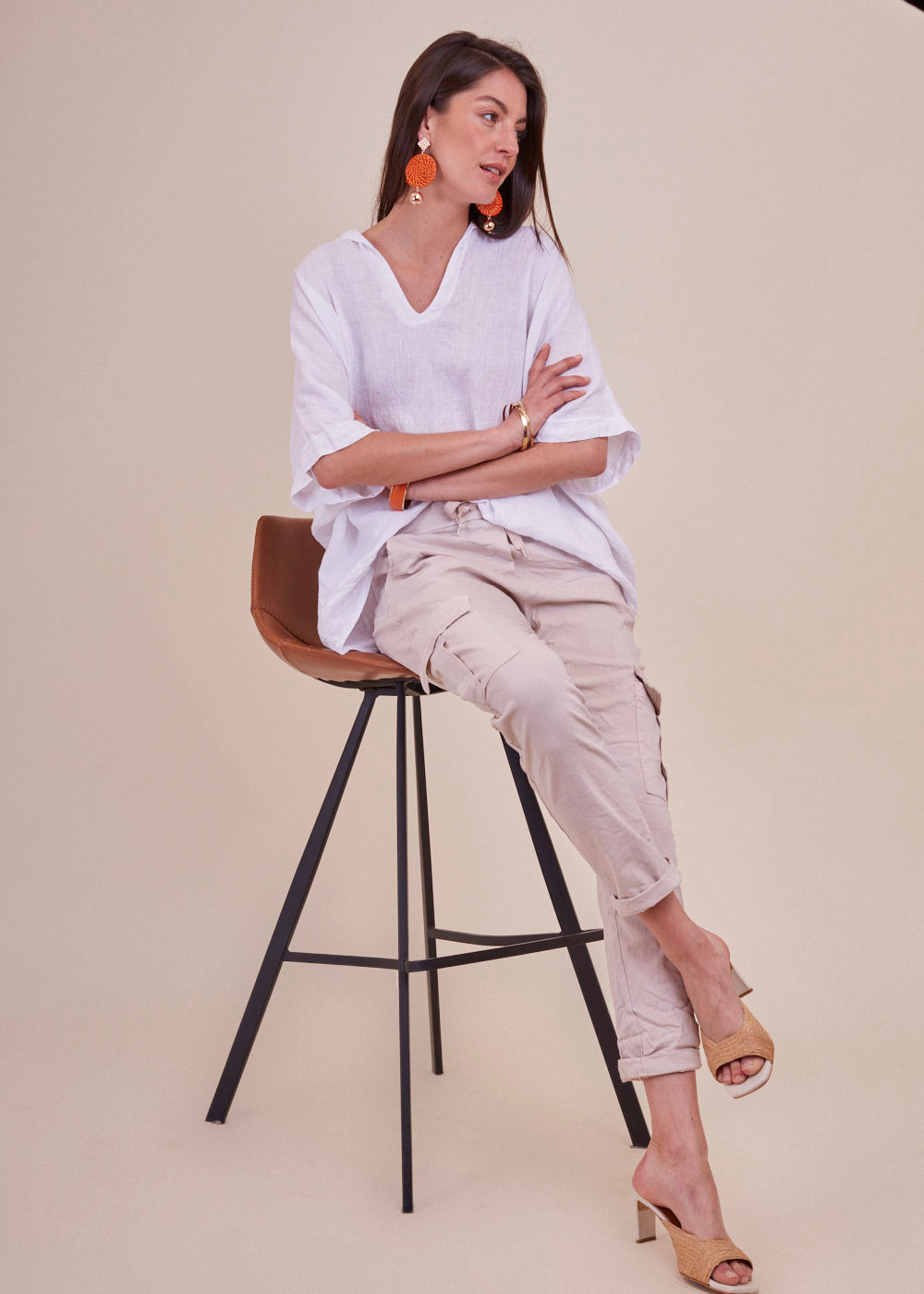 Locker leichte Leinenbluse mit kurzem Arm und besonderen Ausschnitt. Die sommerliche Tunika aus 100% kühlendem Leinen ist der ideale Begleiter für deinen nächsten Urlaub oder einen gemütlichen Stadtbummel mit der besten Freundin.