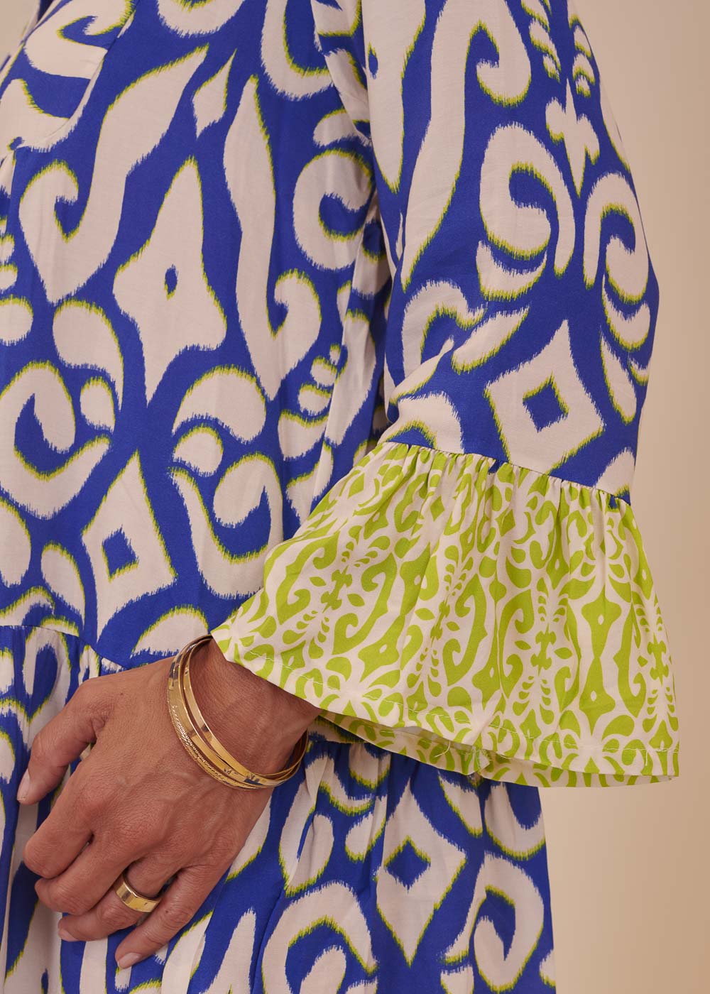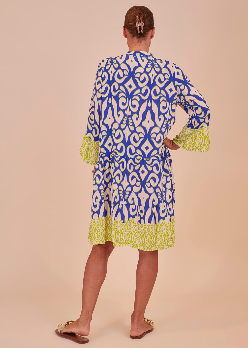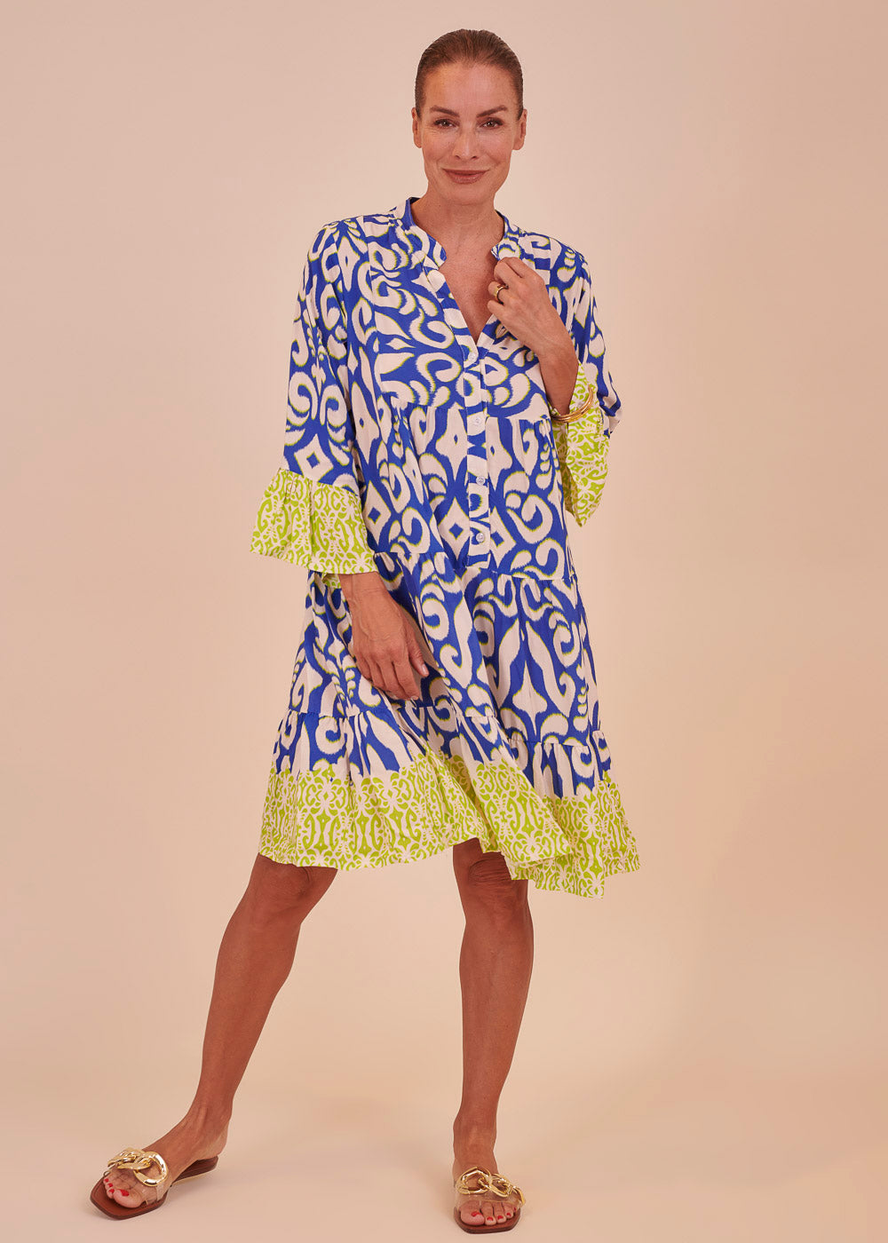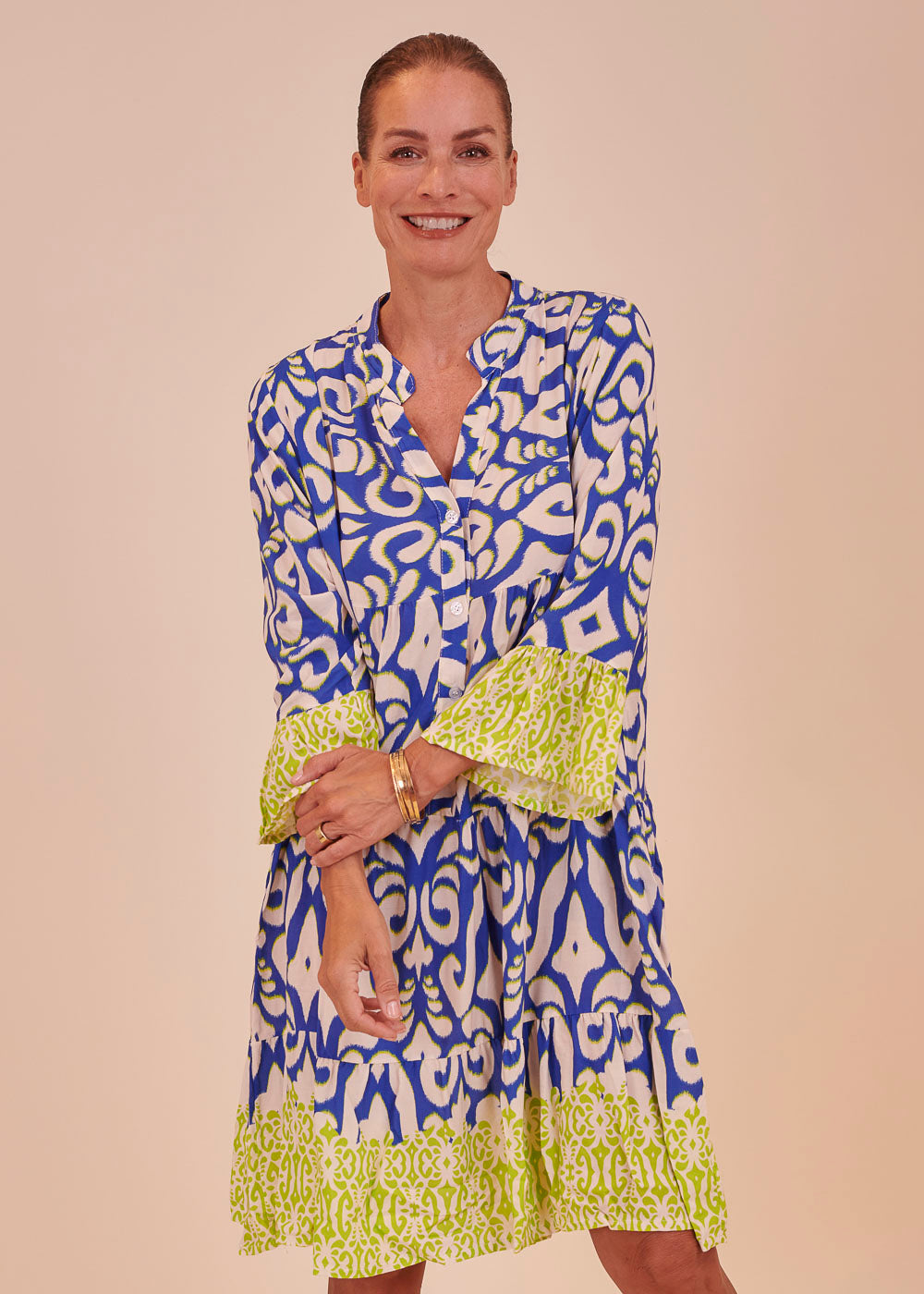 Dieses Kleid erstrahlt in frischen Print. Der Volant-Rock sorgt für ein luftig-leichtes Tragegefühl. Das Kleid besitzt einen V-Ausschnitt und einen angedeuteten Kragen mit einer Knopfleiste. Ein absoluter Hingucker.