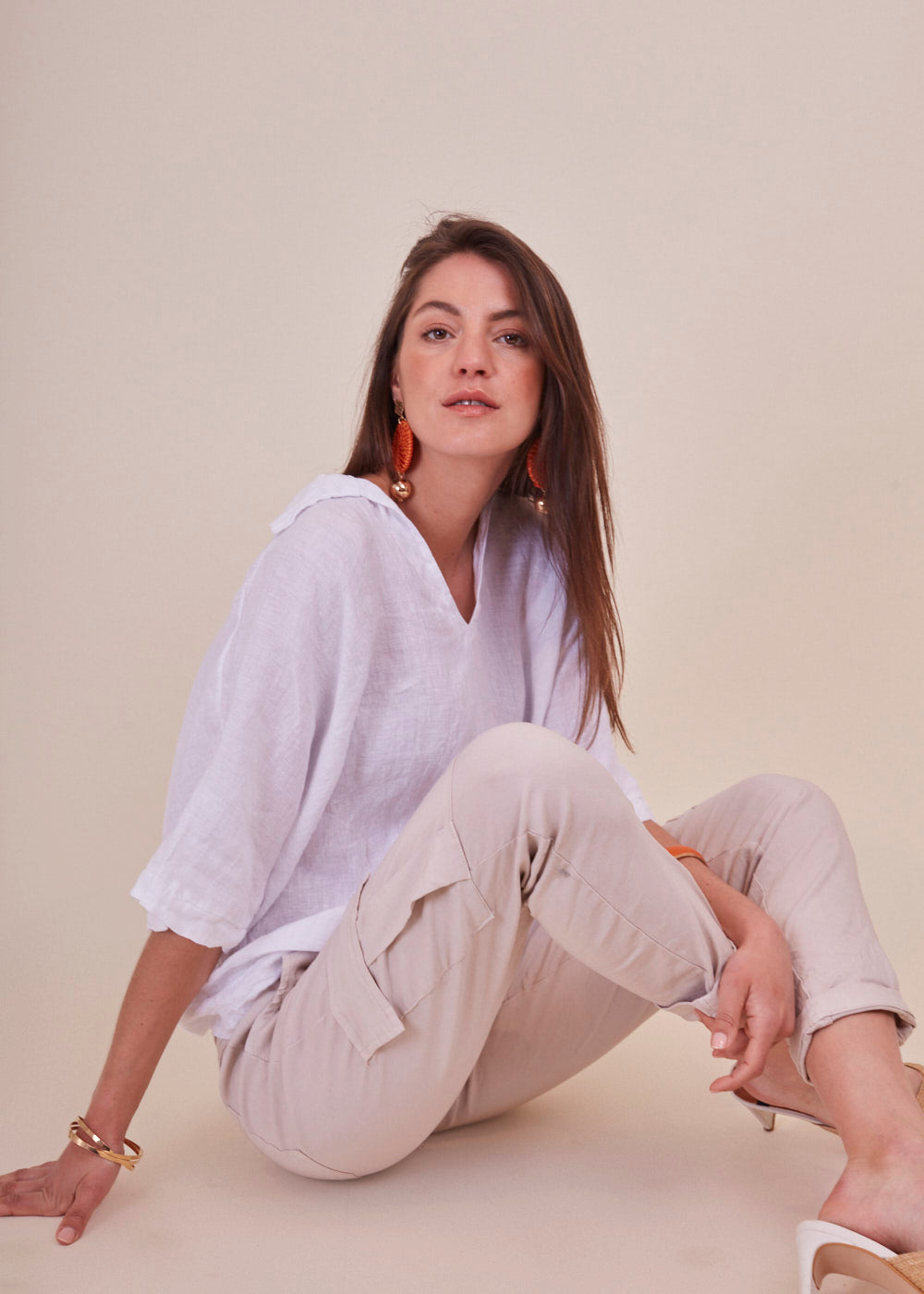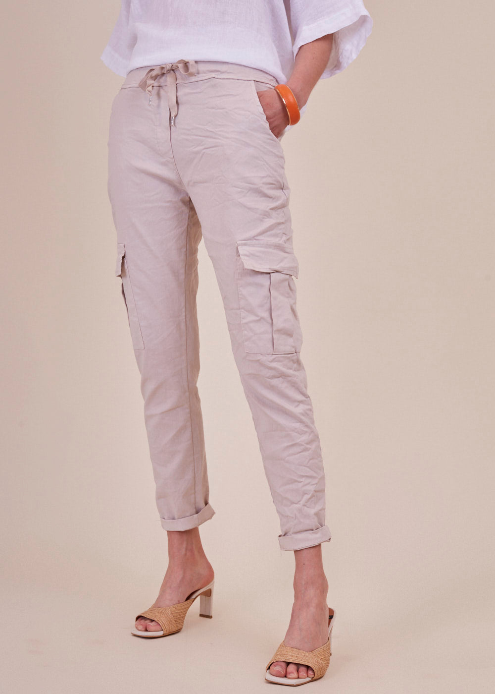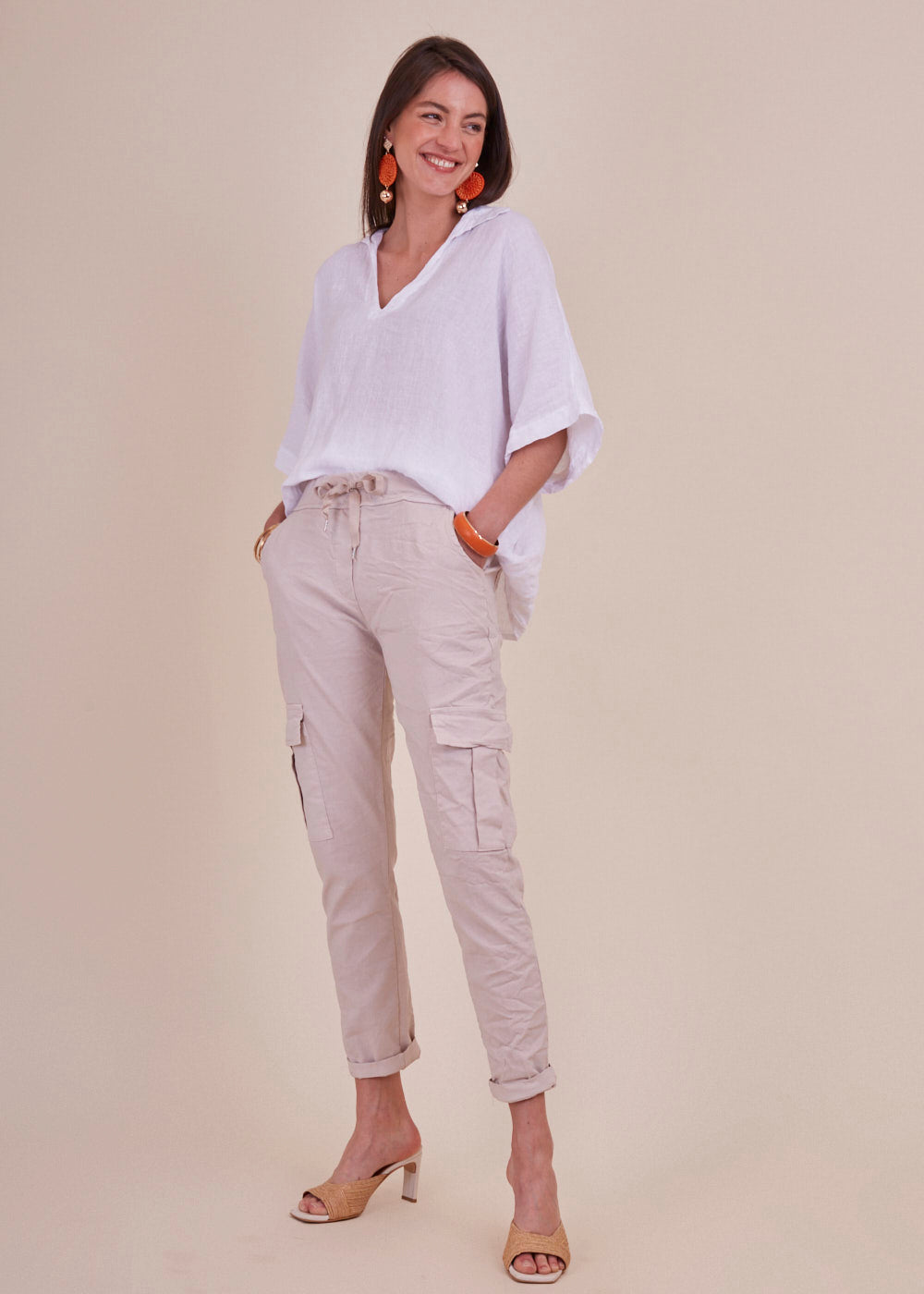 Unser Bestseller in der neuen Trendform mit seitlichen Eingriffstaschen. Hose aus Viskose und Elasthan-Anteil. Dadurch sitzt sie super bequem und lässt sich prima zu Allem kombinieren. Gummizug im Bund, Tunnelzug mit Band und seitliche Eingriffstaschen.