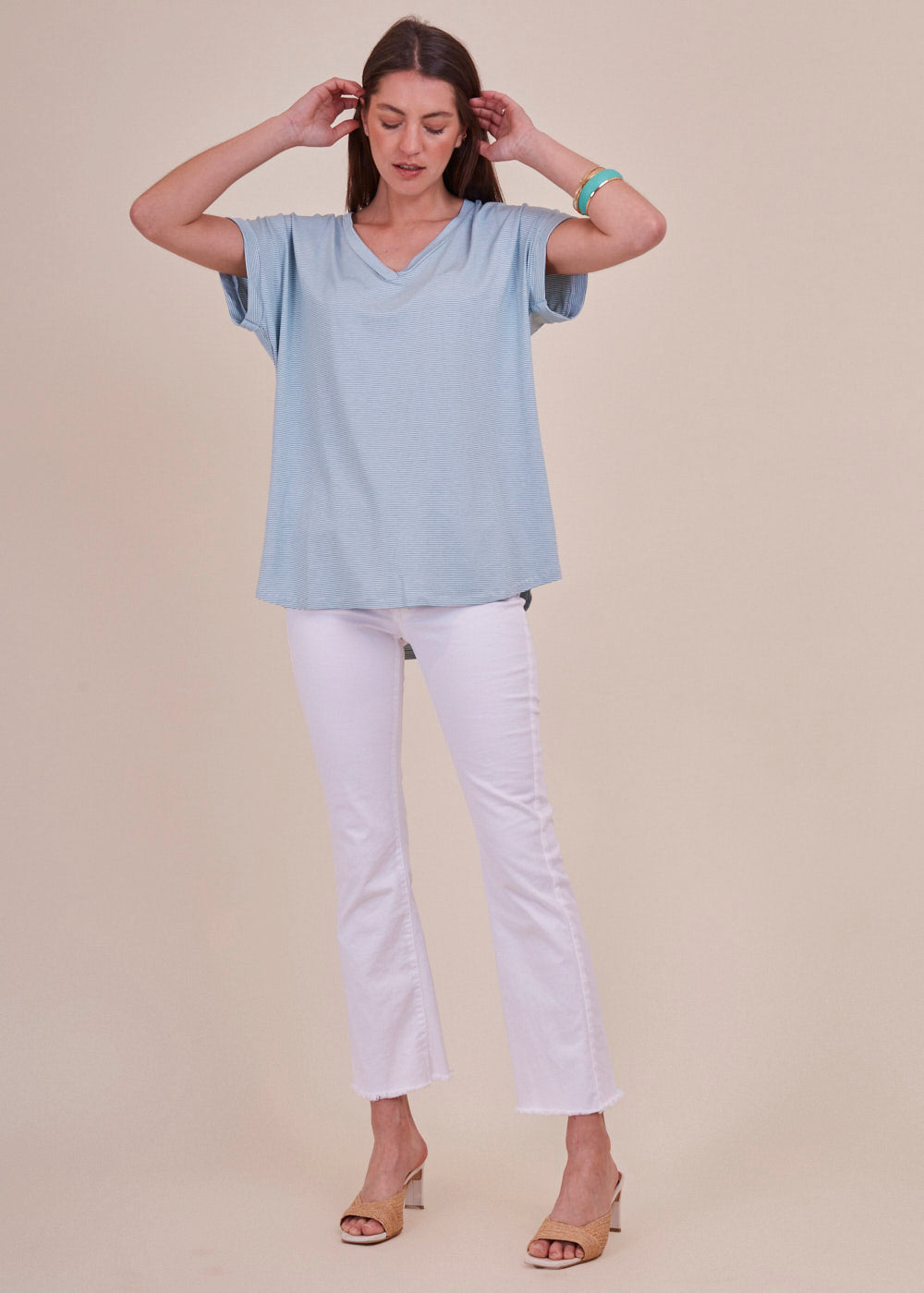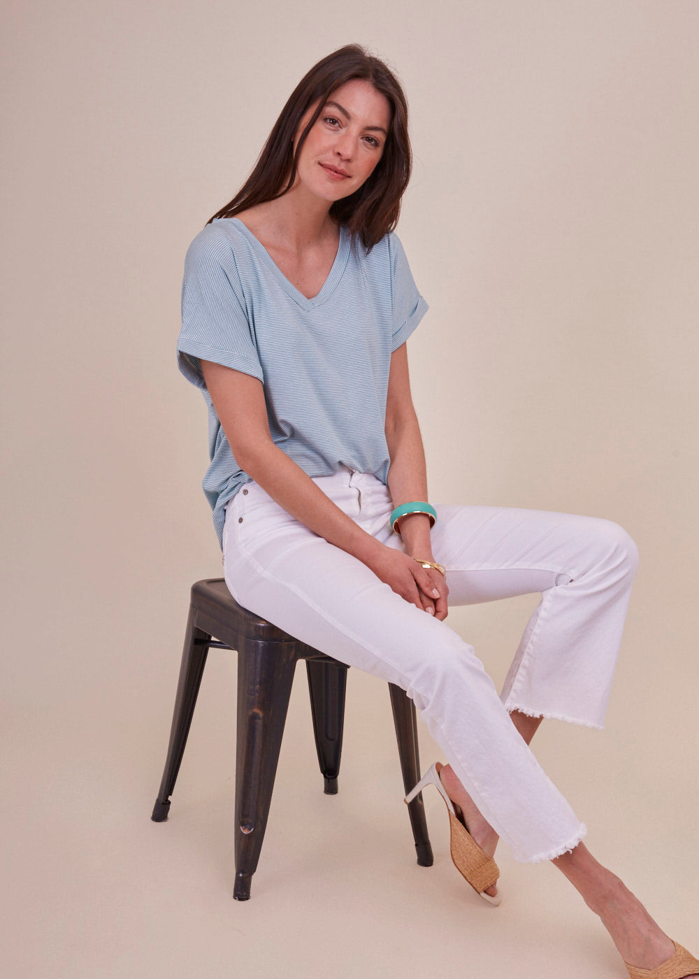 Ein maritimer und wunderbar zeitloser Klassiker ist das Streifenshirt! Schön gerade geschnitten setzt das T-Shirt auf Komfort und liegt dank seines Materials besonders angenehm auf der Haut. Ein schöner V-Ausschnitt und umgeschlagene kurze Arme, runden dieses besondere Shirt, perfekt ab!