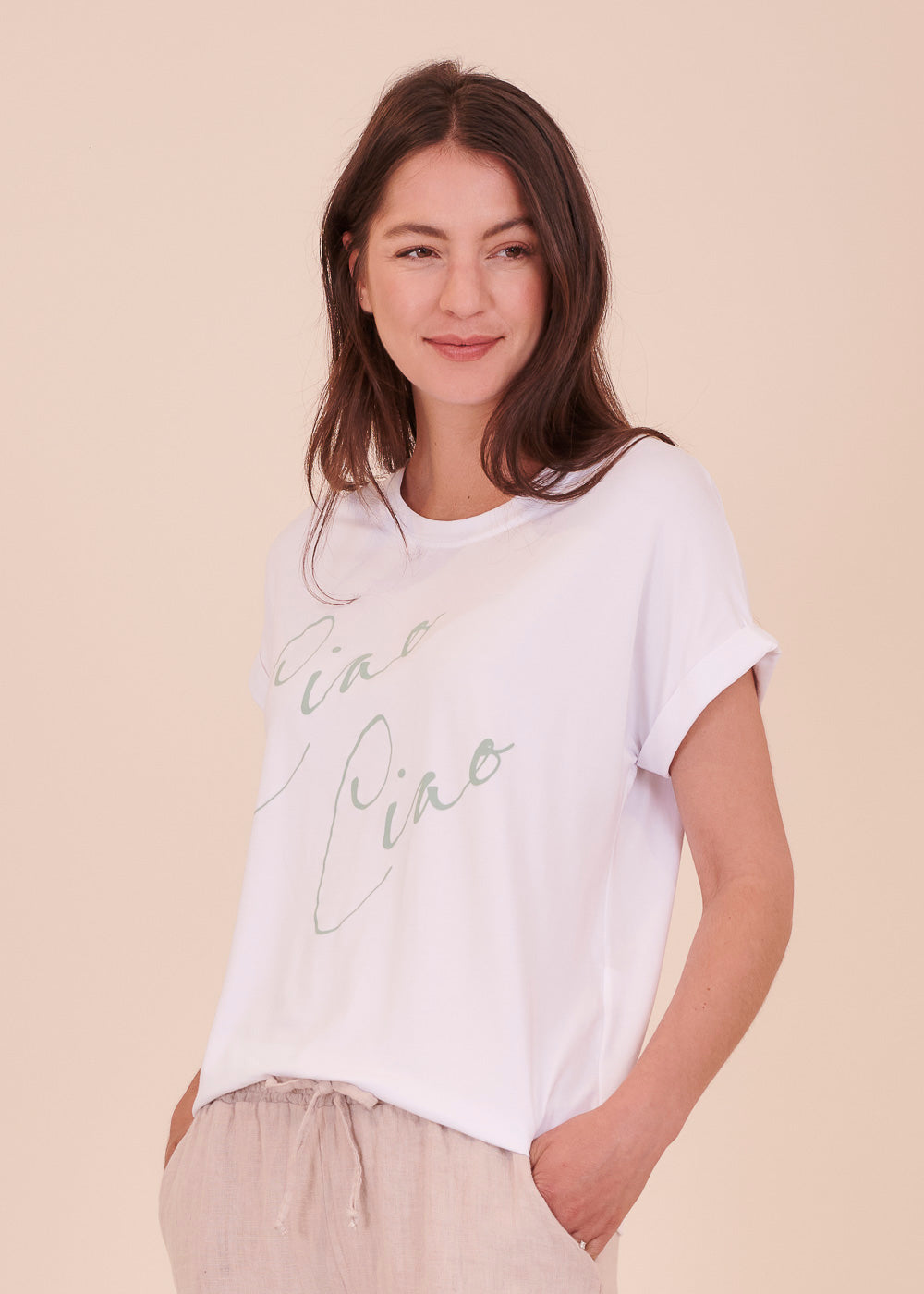 Ciao Ciao! T-Shirt aus weicher Baumwolle mit Frontdruck, Rundausschnitt mit Rippenblende und überschnittenen Schultern und umgekrempelten Ärmeln.