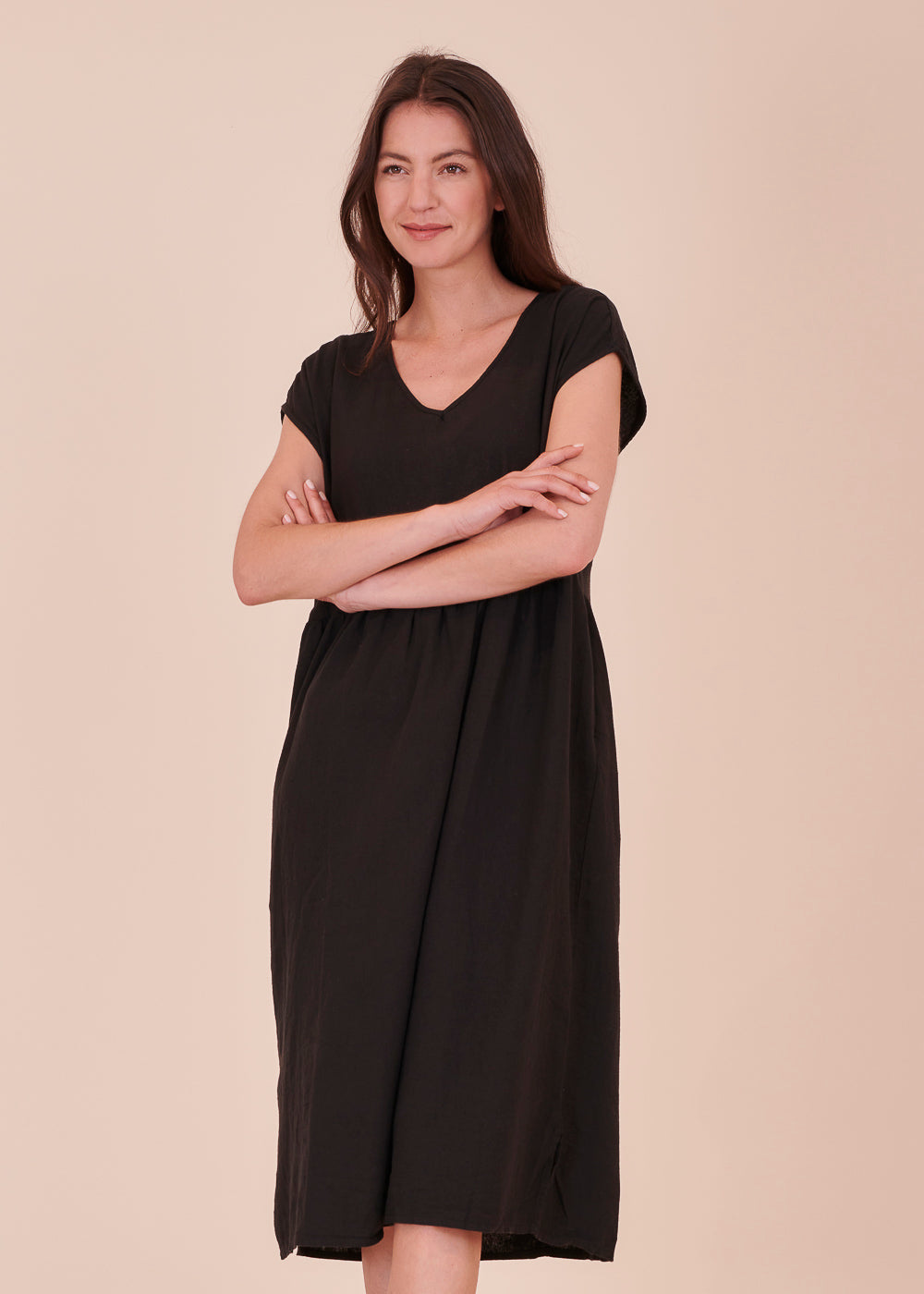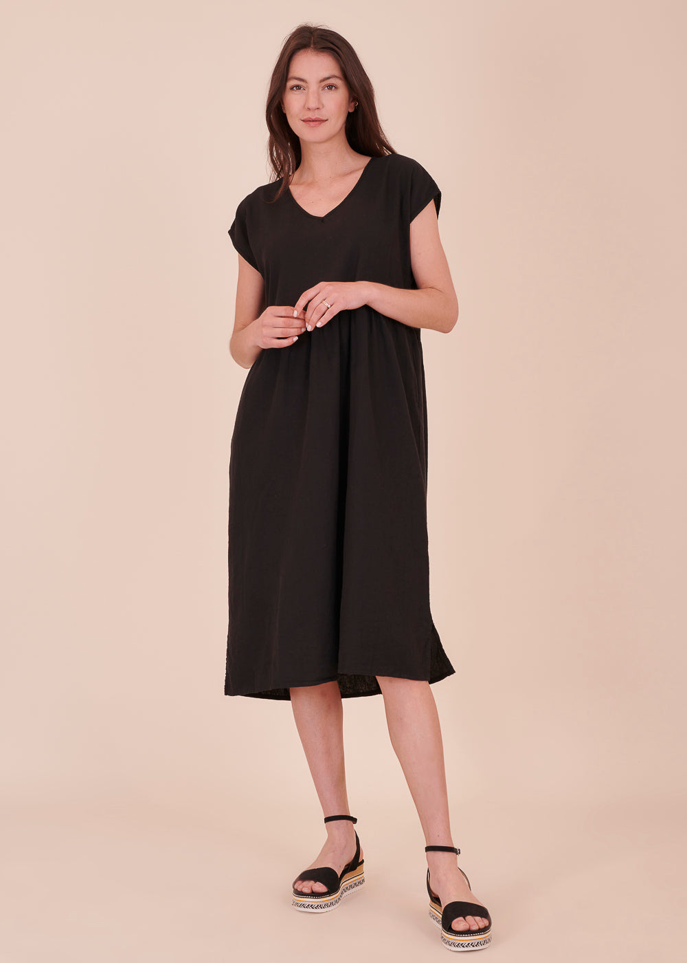 Dieses lässig geschnittene Leinenkleid schreit förmlich nach dem Sommer! Der luftig leichte Schnitt des Kleides trägt sich, auch noch an den heißesten Tagen, wunderbar. Der V-Ausschnitt und die seitlichen Eingriffstaschen geben dem ganzen eine gewisse Lässigkeit. Einfach perfekt für die nächste Shoppingtour mit deiner besten Freundin.