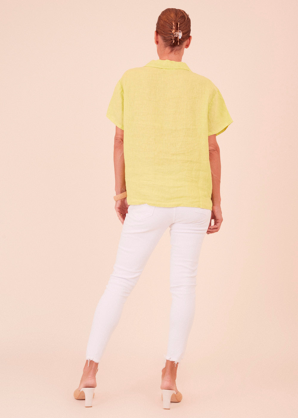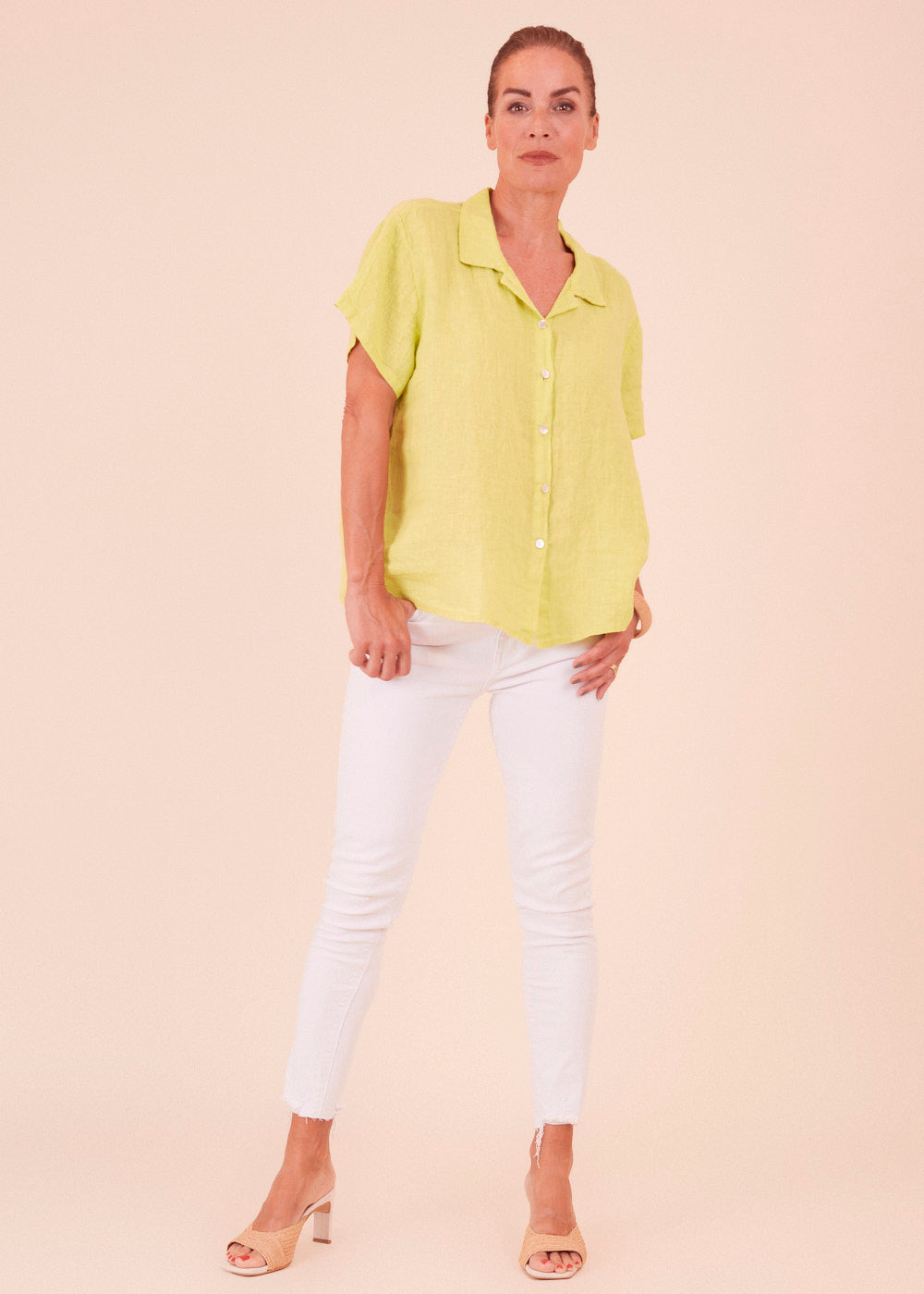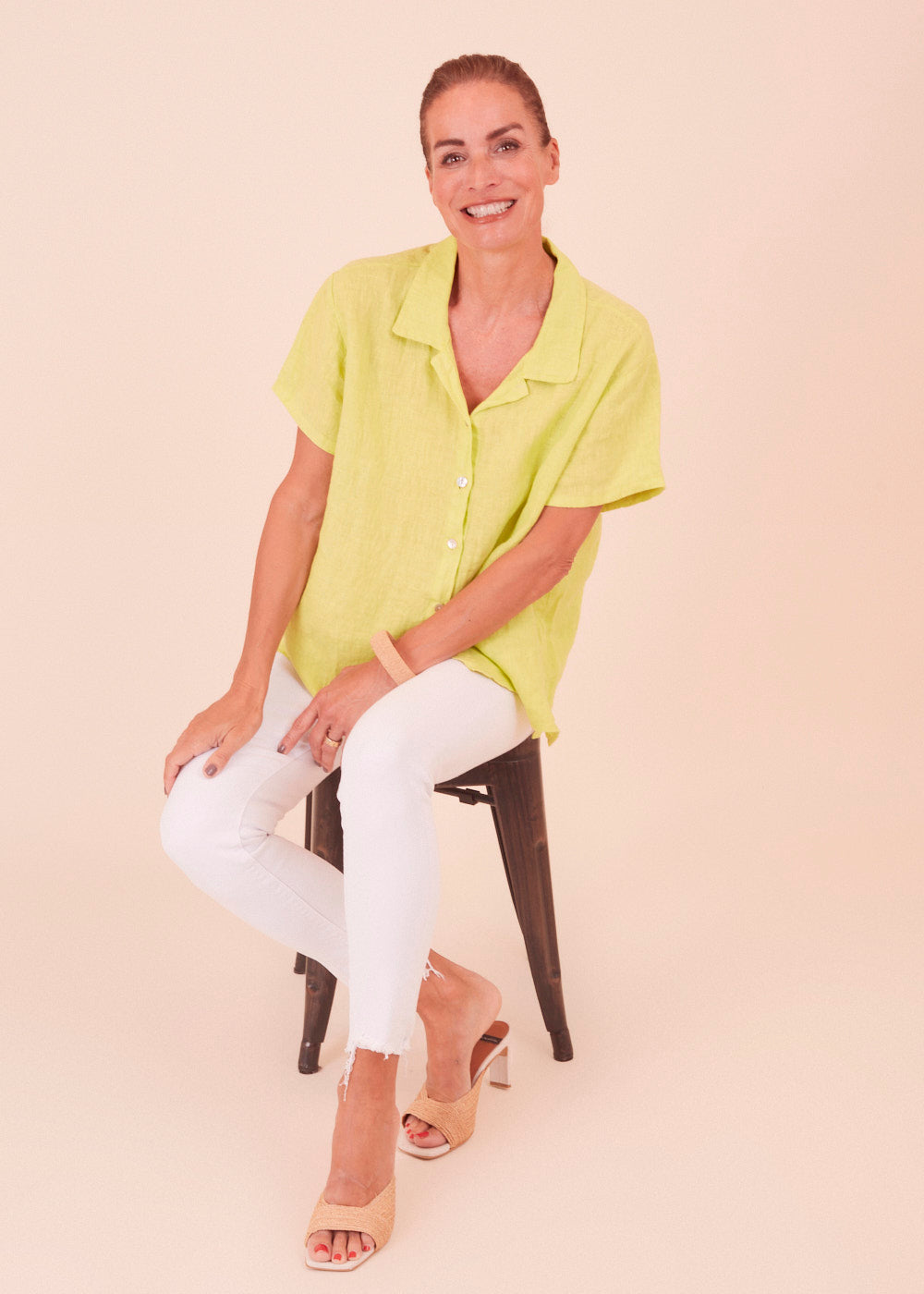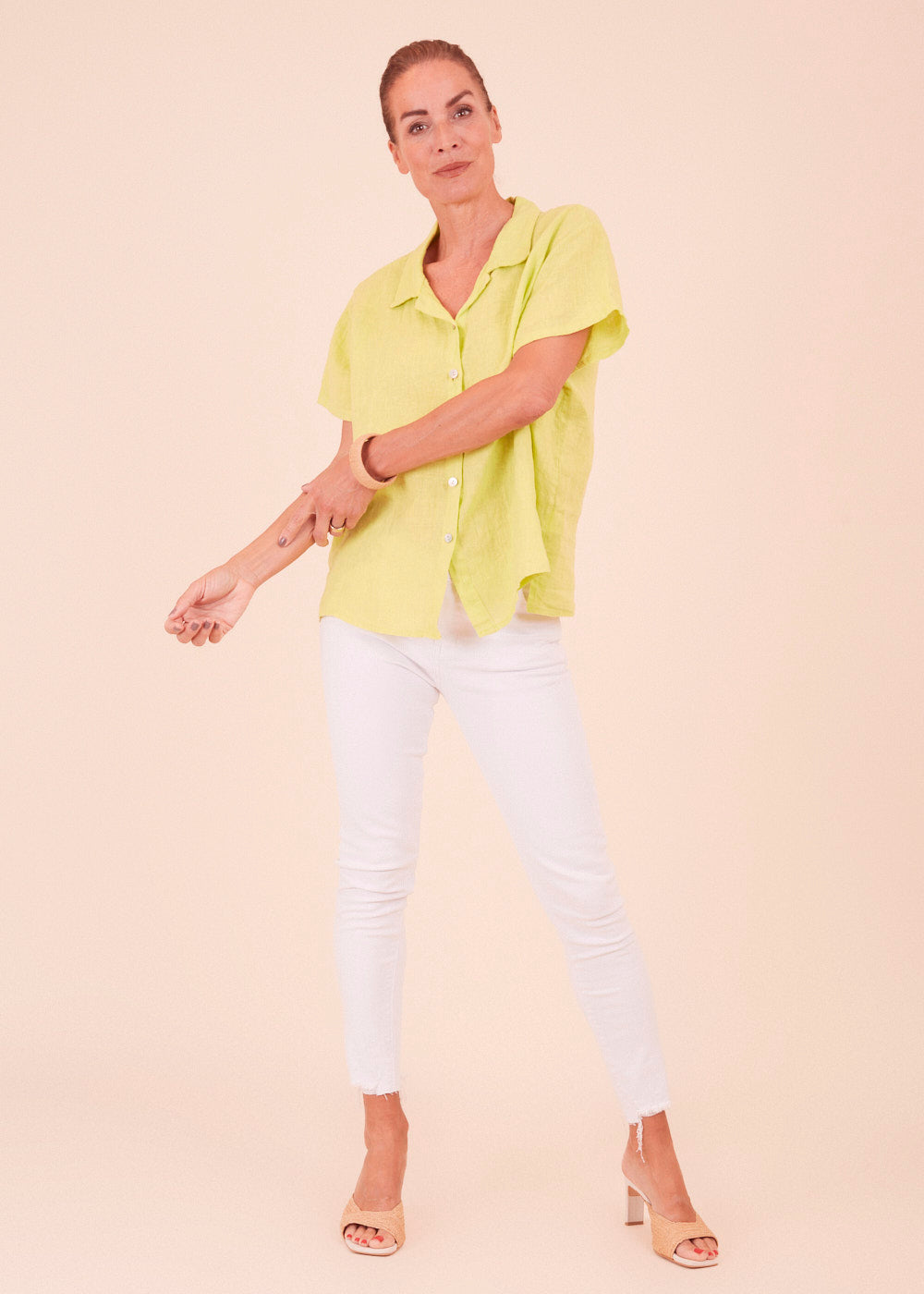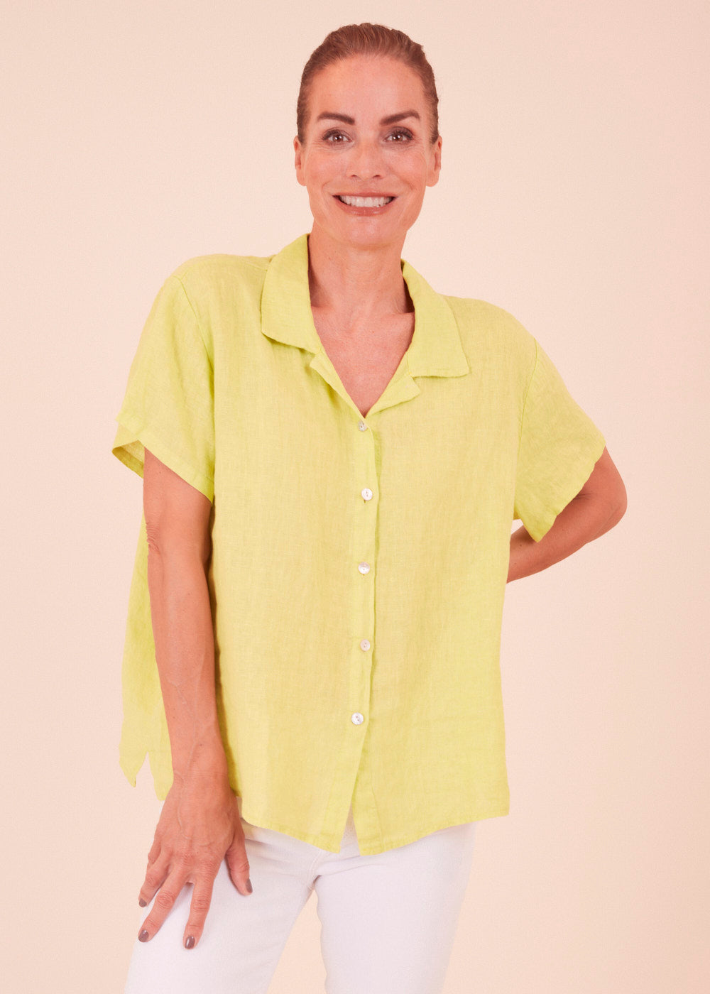 Kurze kastenförmig geschnittene Bluse aus reinem Leinen mit Kragen, Knopfleiste, überschnittenen Schultern und kurzem Arm. Einfach frisch und sommerlich.
