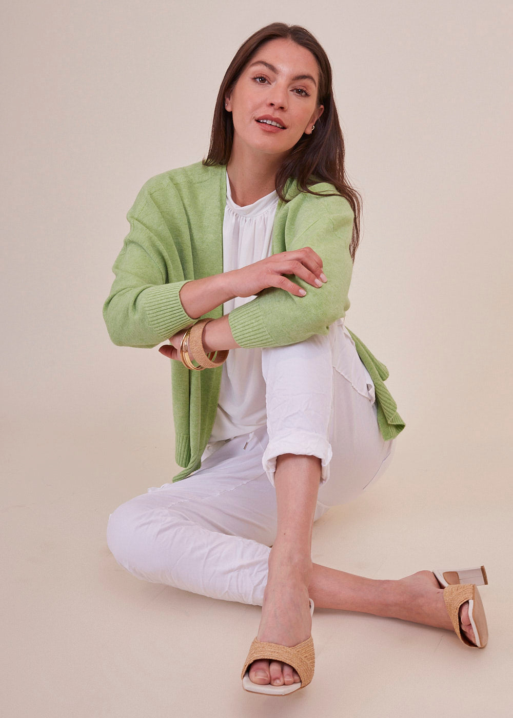 Kurz und kastenförmig geschnittene Strickjacke mit langen Armen aus unserem Bestseller Garn. Sie hat ein Rippenbündchen an den Ärmeln und am Saum. Kuschelig weicher Tragekomfort mit absoluter Wohlfühlgarantie. Perfekt in der Kombination mit einem Maxikleid oder wunderbar für die kühleren Sommernächte.