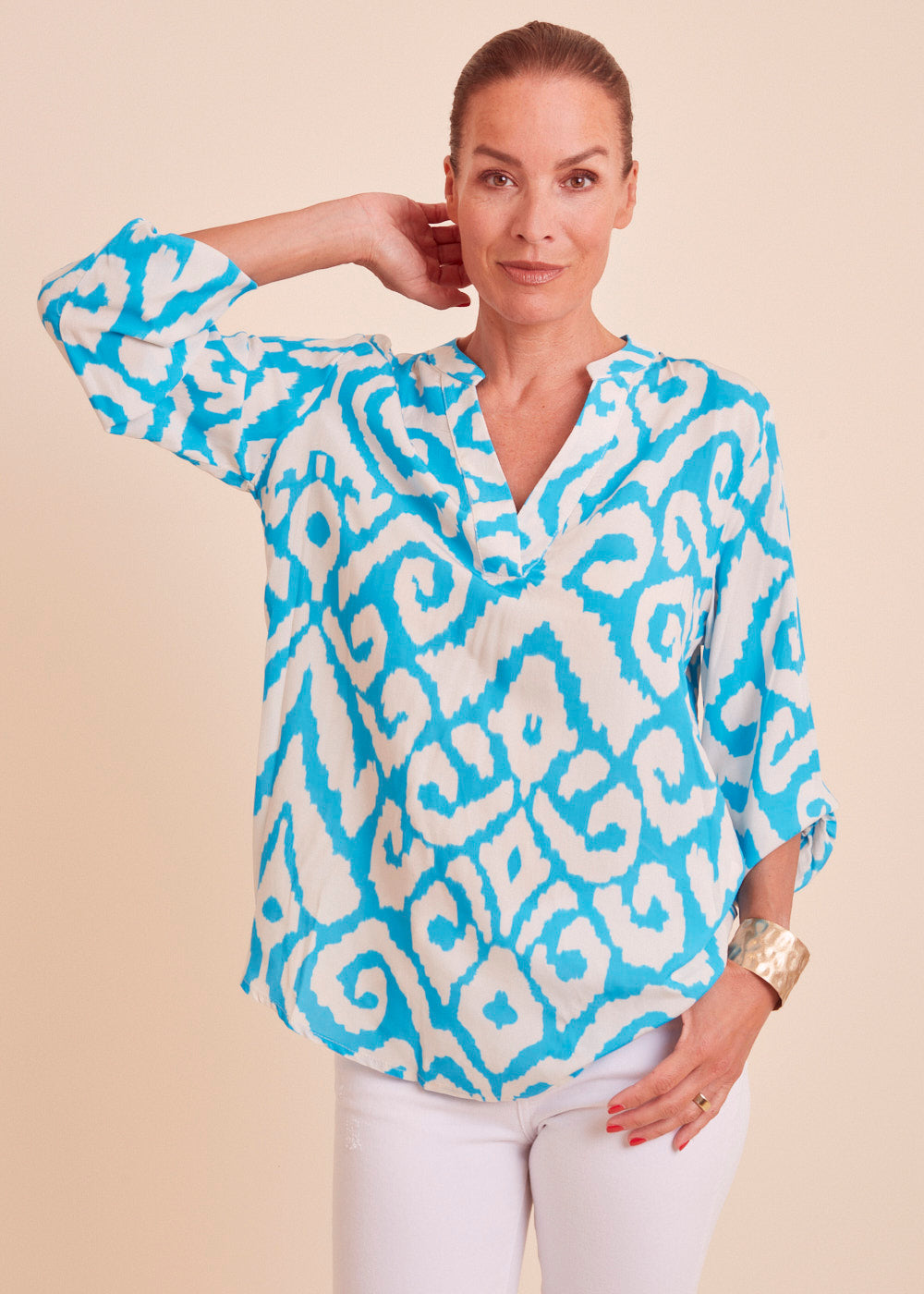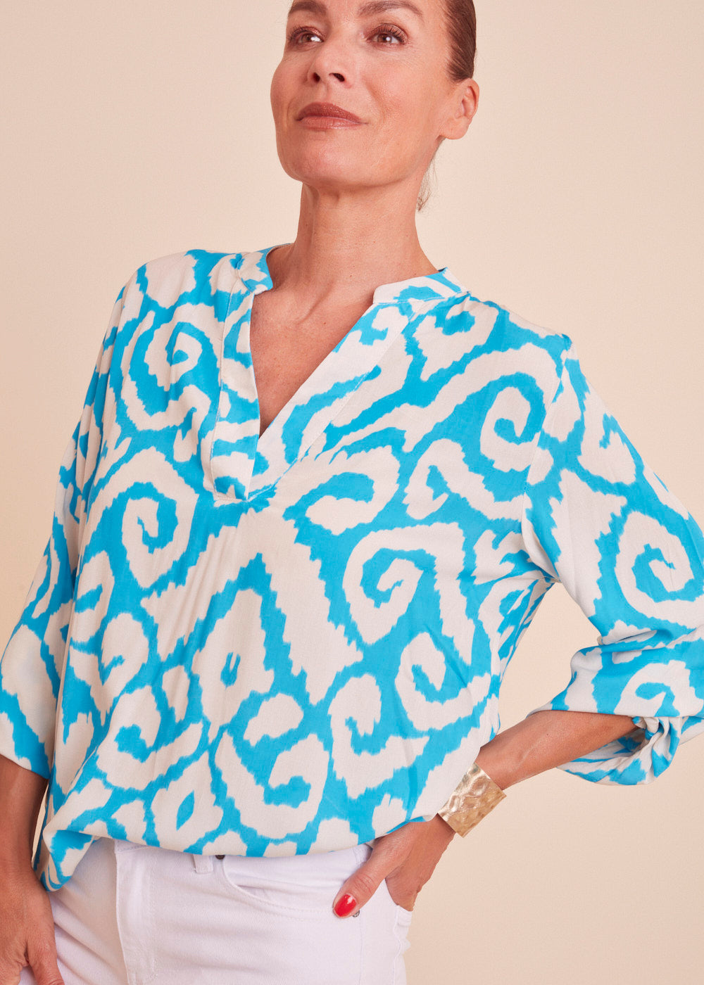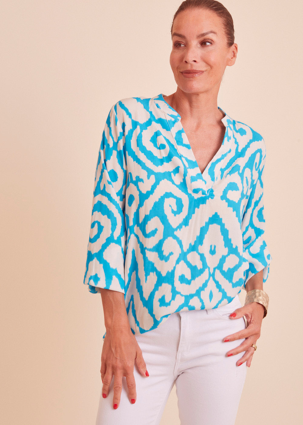 Zauber dir die Sonne in deinen Kleiderschrank. Durch diese fließende leichte Viskosebluse in einem zauberhaften Aqua Ton, zauberst du dir ein Strahlen ins Gesicht. Diese gemusterte Bluse im Stehkragen Stil ist lässig geschnitten. Die frischen Farben verleihen deinem Look die perfekte Frische. Einfach besonders!