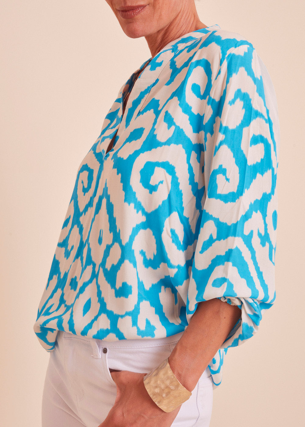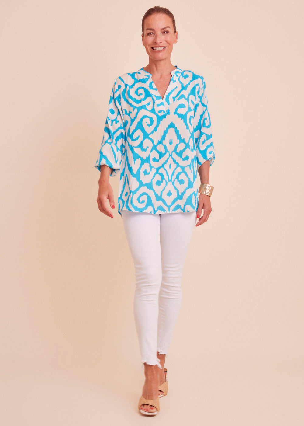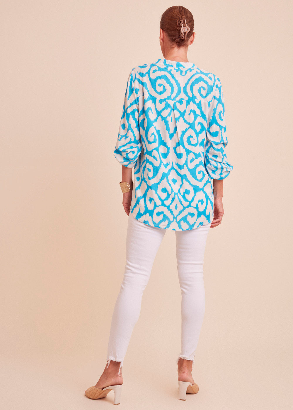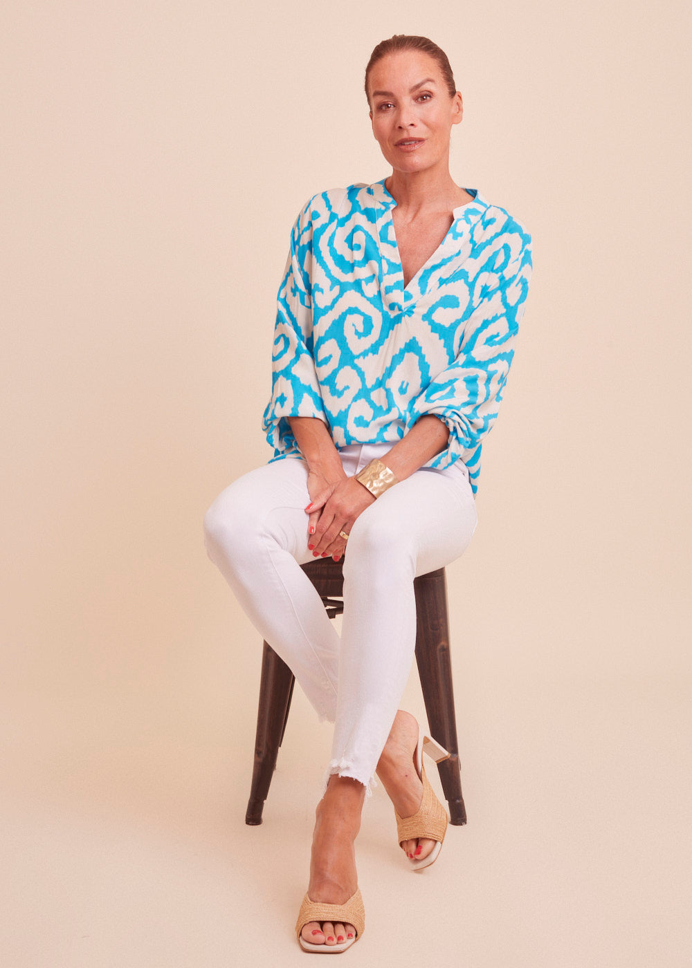 Zauber dir die Sonne in deinen Kleiderschrank. Durch diese fließende leichte Viskosebluse in einem zauberhaften Aqua Ton, zauberst du dir ein Strahlen ins Gesicht. Diese gemusterte Bluse im Stehkragen Stil ist lässig geschnitten. Die frischen Farben verleihen deinem Look die perfekte Frische. Einfach besonders!