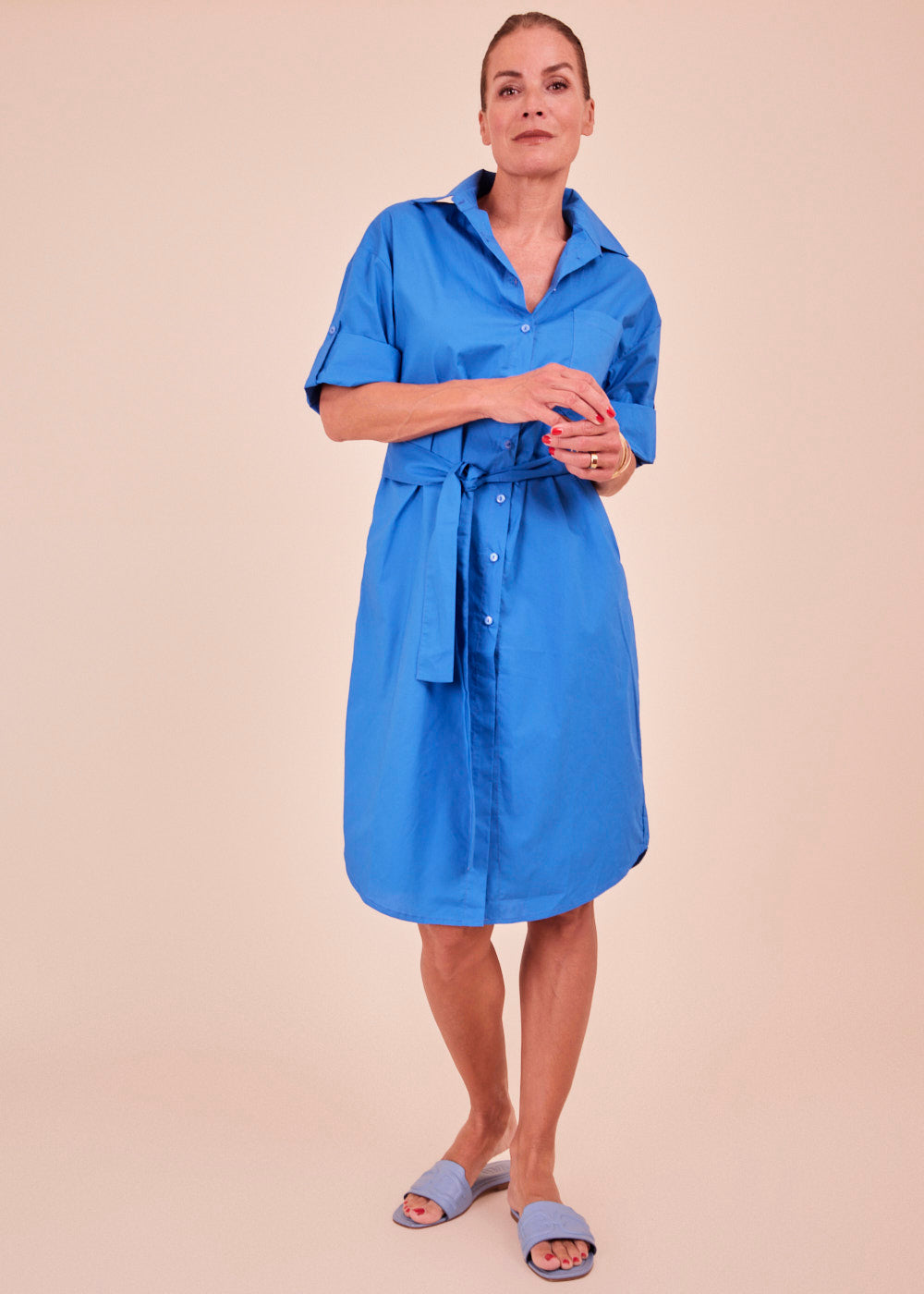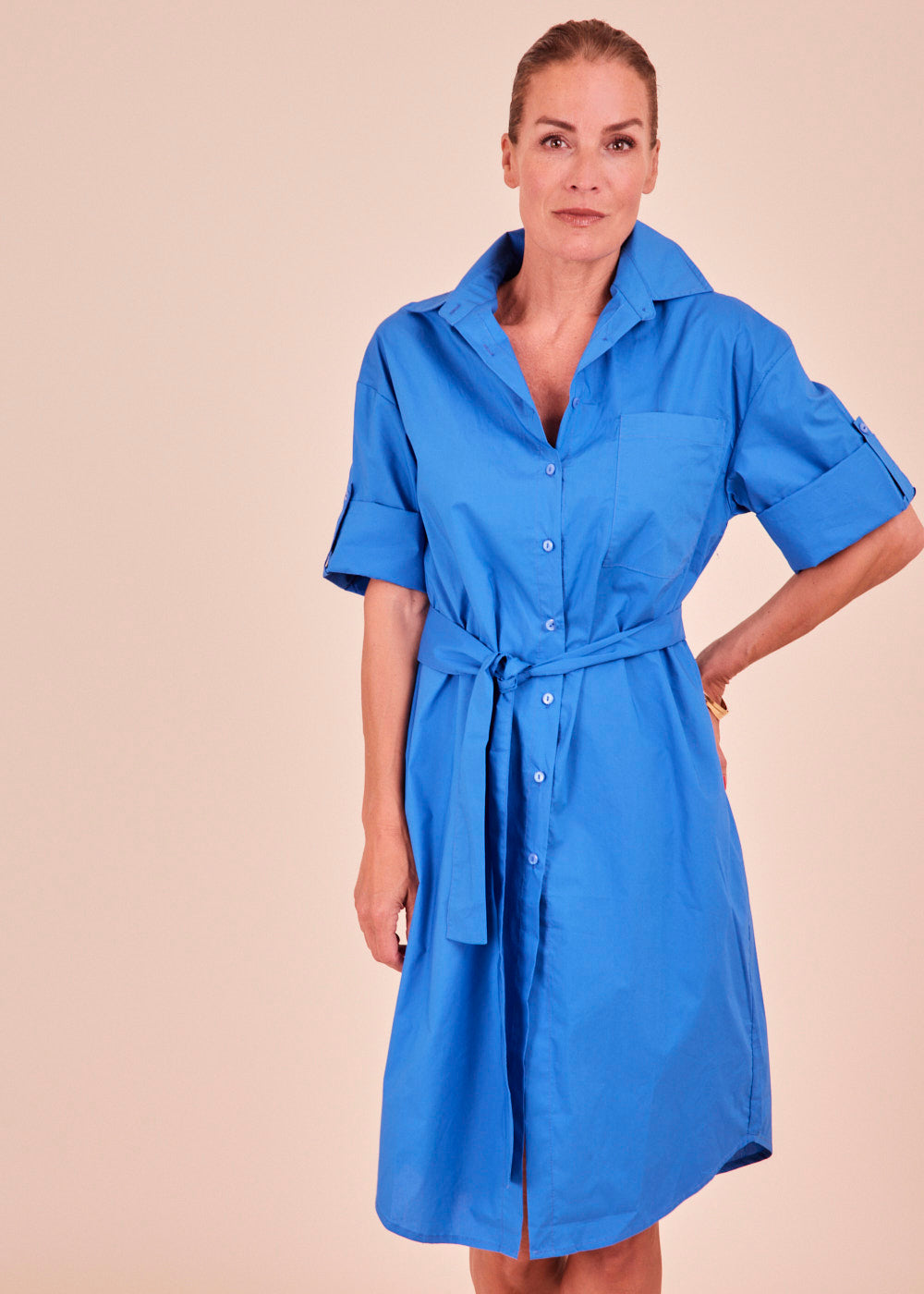 Oversized geschnittenes Hemdblusenkleid mit dreiviertel Ärmeln in einem großartigen blau Ton. Dieses Blusenkleid hat eine offene Knopfleiste vorne. Der lässig fallende Schnitt eignet sich perfekt für legere Alltags-Looks. Mit einem passenden Bindegürtel. Egal ob mit Sneakern oder Sandalen, das Kleid ist ein absoluter Hingucker.