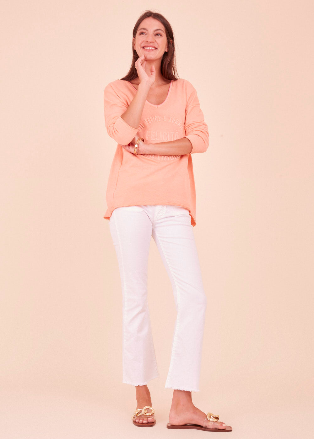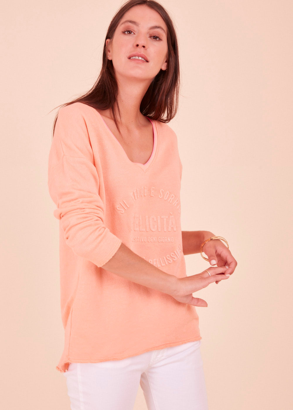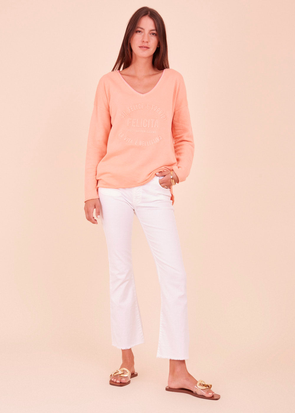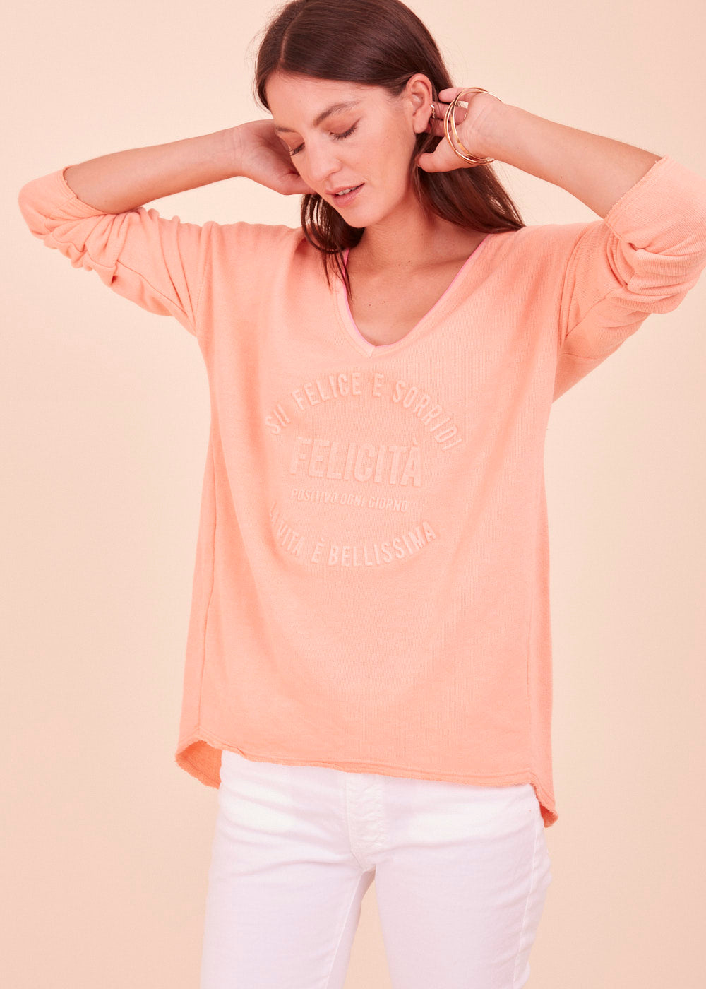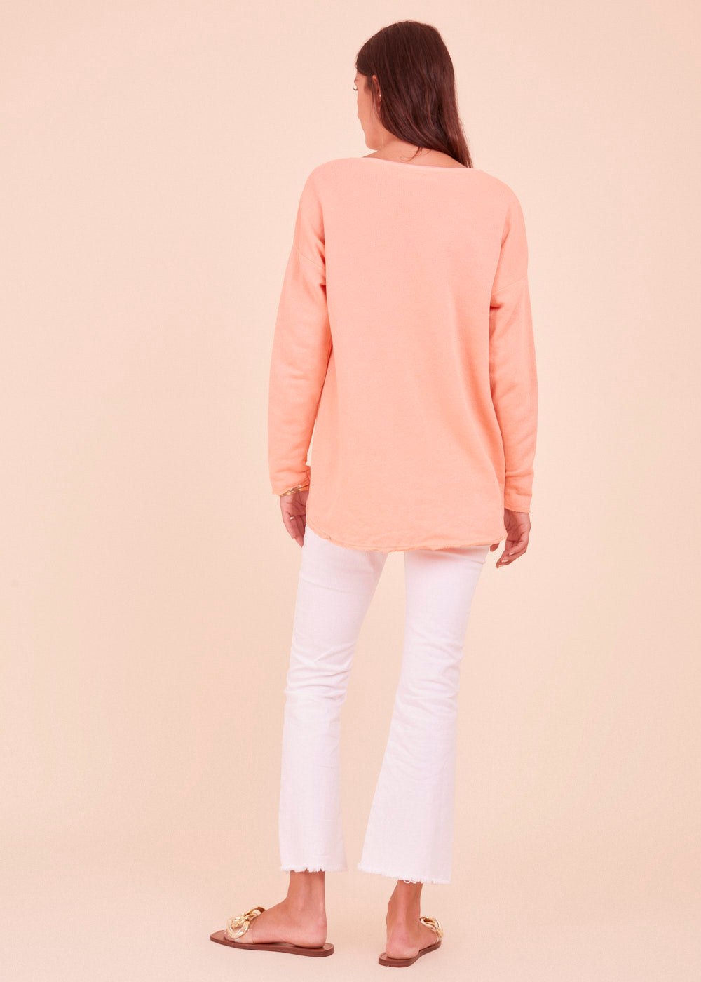 Unser Sweatshirt ist nicht nur ein Mode-Statement, sondern auch der ideale Begleiter für gemütliche Tage, aktive Wochenenden und entspannte Abende. Der wunderschöne  Orange Ton verleiht deinem Outfit eine frische und energiegeladene Note, die garantiert alle Blicke auf sich zieht. Mit einem V-Ausschnitt mit offener Kante.