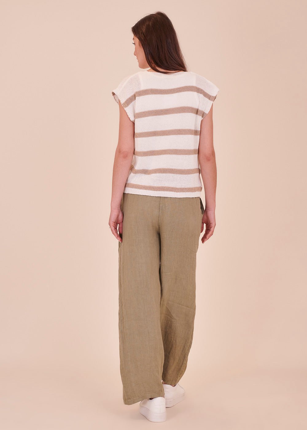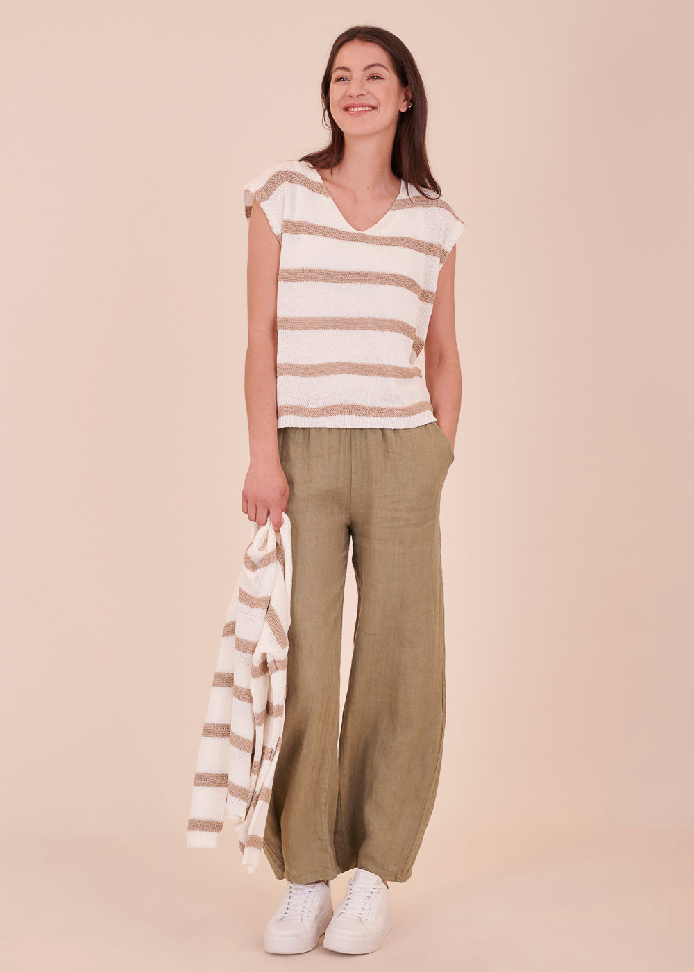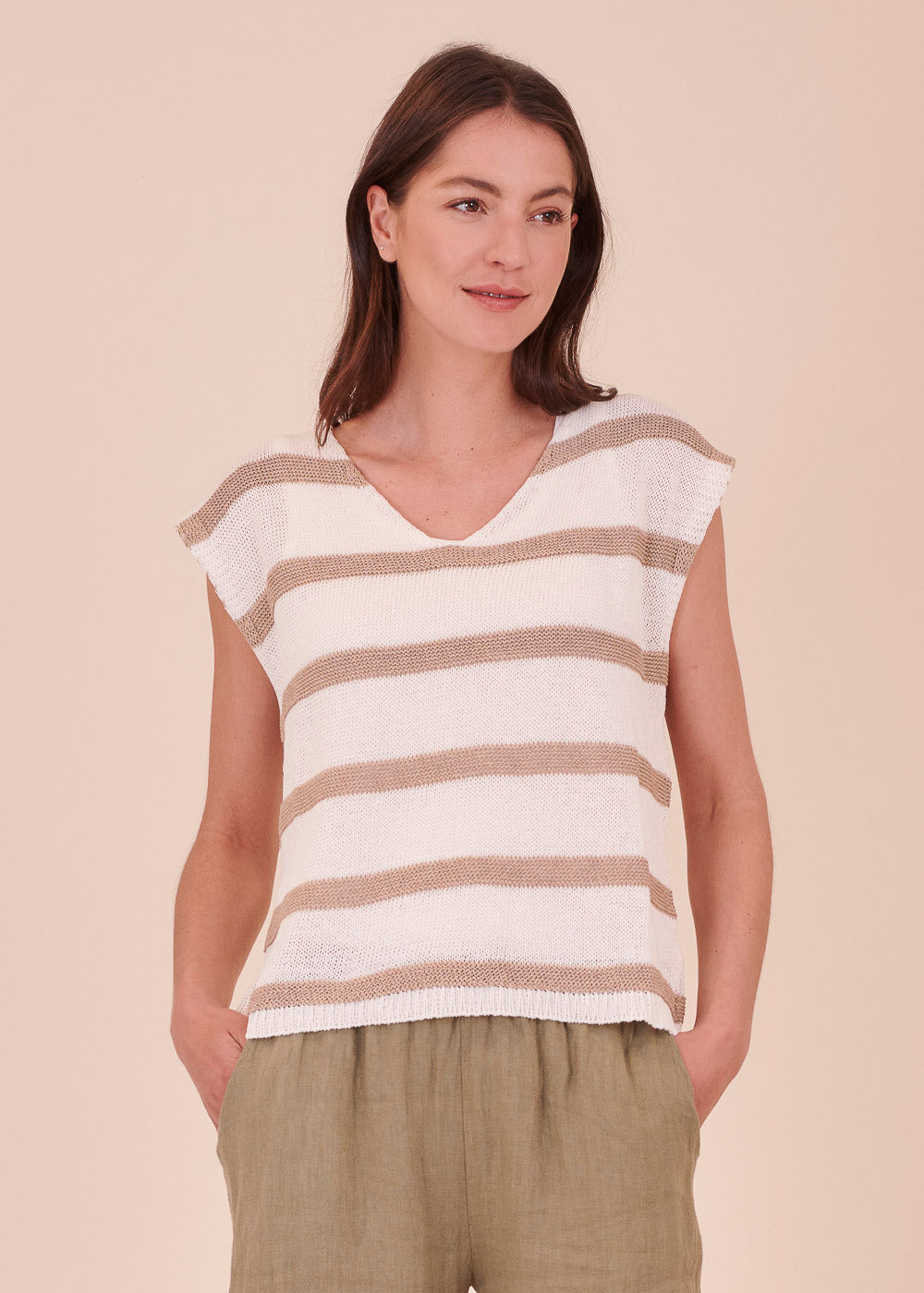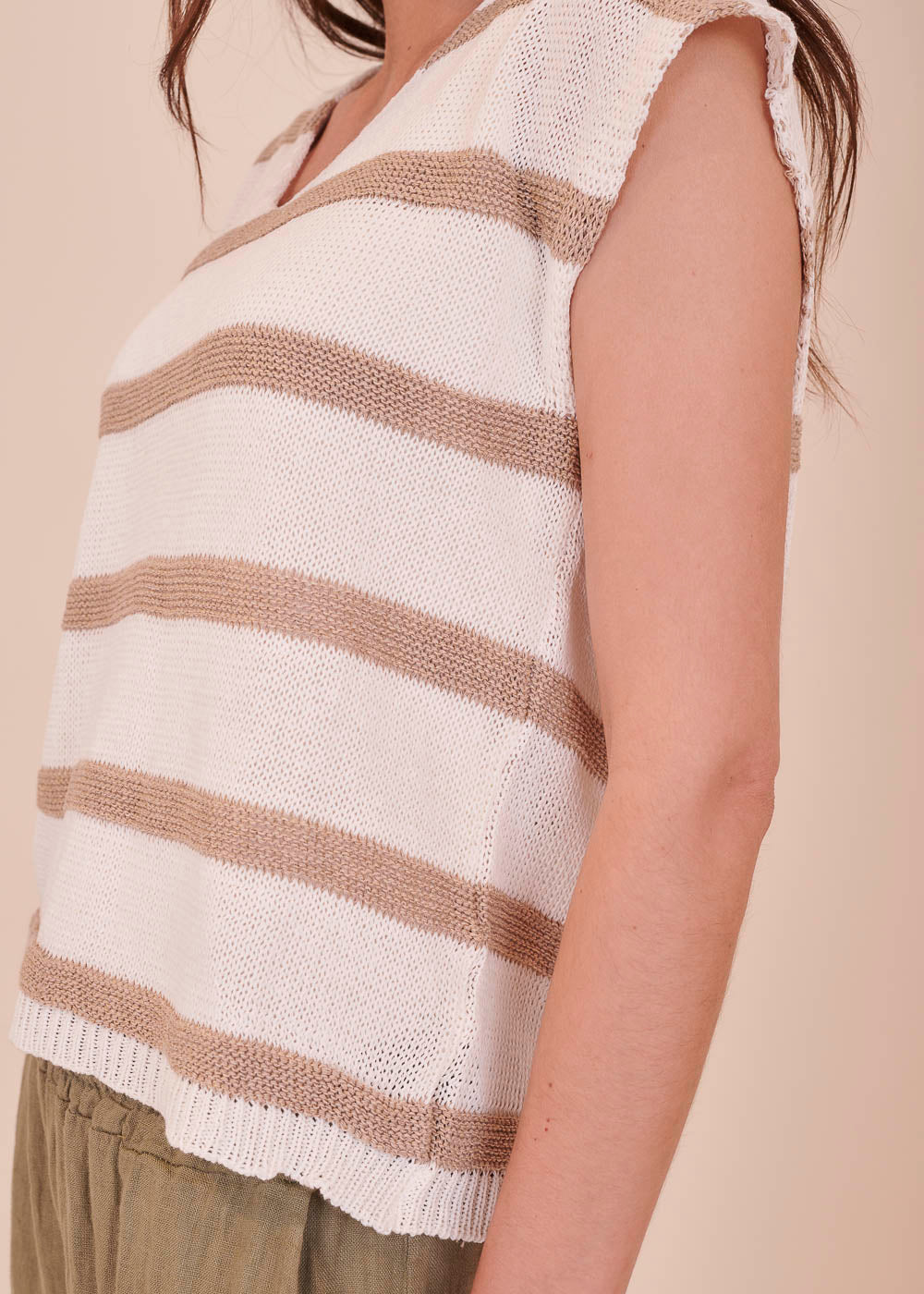 Dieser lässige Strickpullunder im Ringeldesign ist der perfekte Begleiter für kühle Sommerabende. Die weiche Qualität aus Rippstrick die sich nicht nur gut anfühlt, sondern auch sehr lässig aussieht. Kombiniere dieses Modell gerne mit einer Jeans oder einer unserer weit geschnittenen Hosen. Mit einem kurzen kastenförmigen Schnitt und Rippenbündchen an den Ärmeln und am Saum. Einfach perfekt für deine nächste Lieblingskombination!