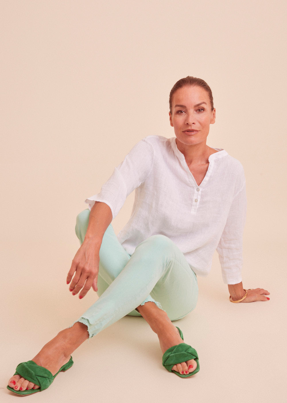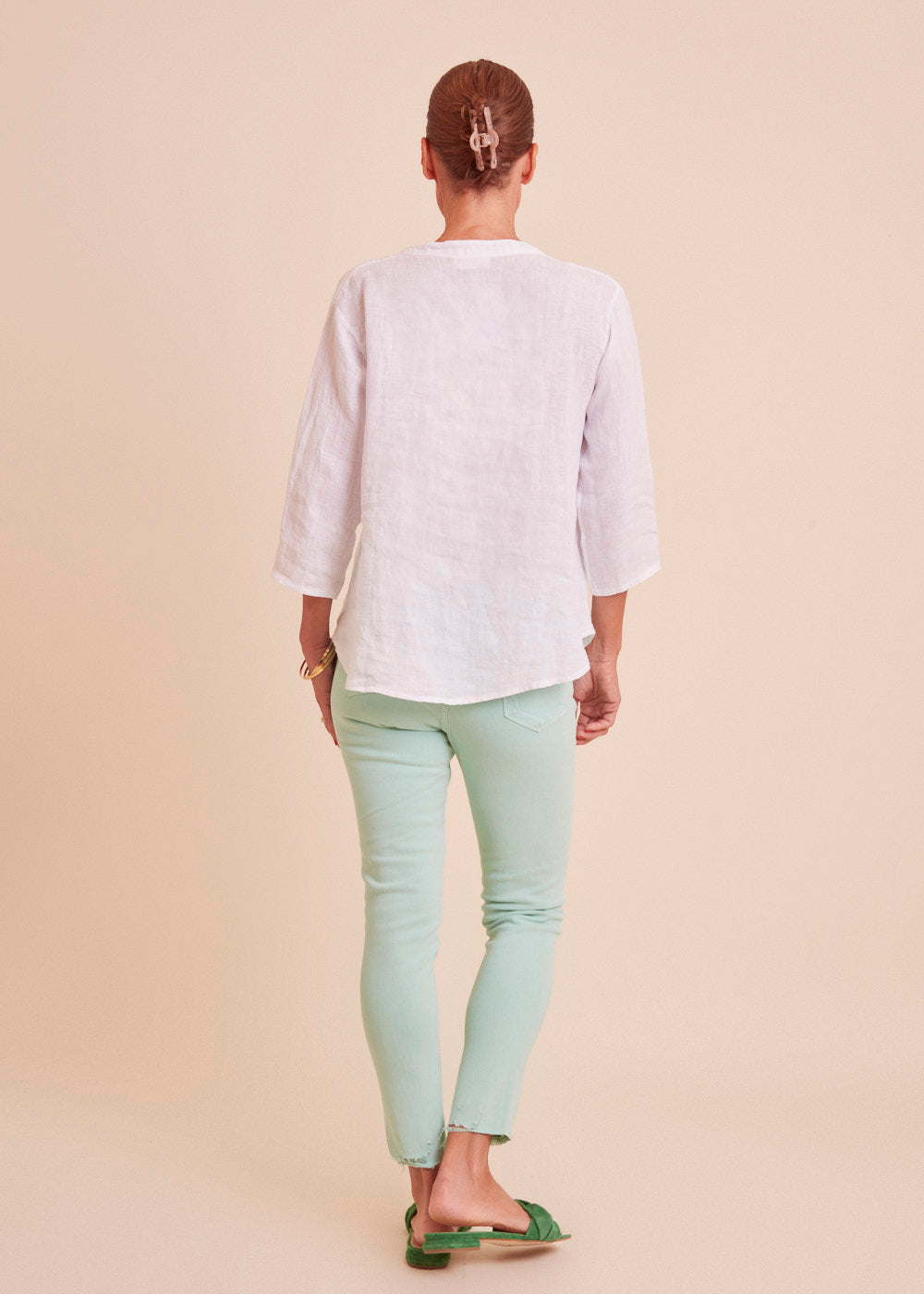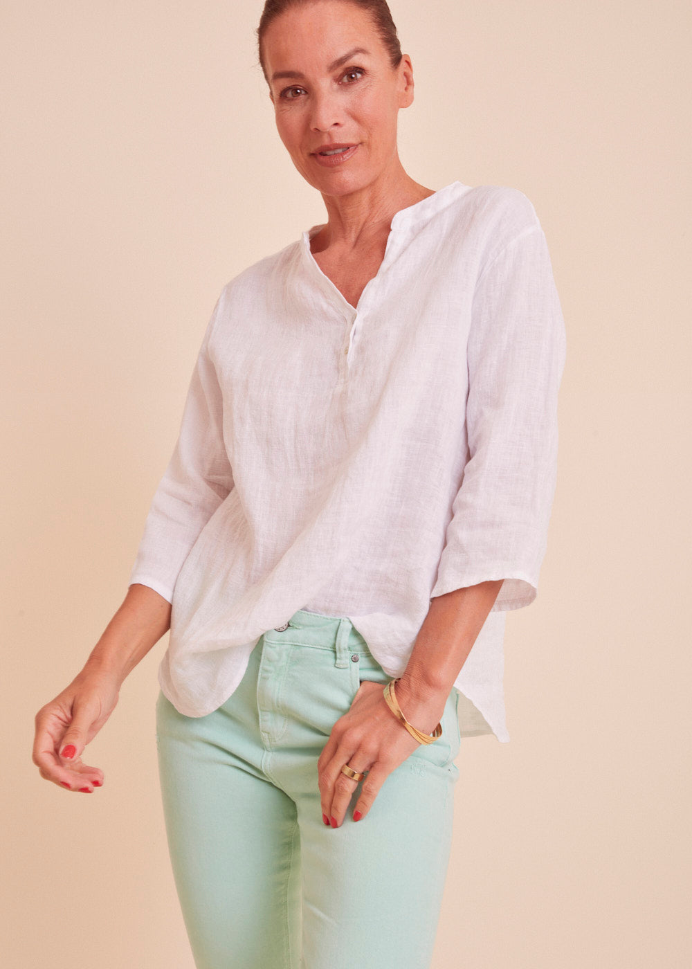 Leinen ist das perfekte Material für die heißen Sommertage. Diese lässig sitzende weiße Leinenbluse mit einem besonders schönen Ausschnitt und angedeuteter Knopfleiste ist ein absoluter Alleskönner. Das luftig leichte Material schmiegt sich angenehm an deinem Körper an.