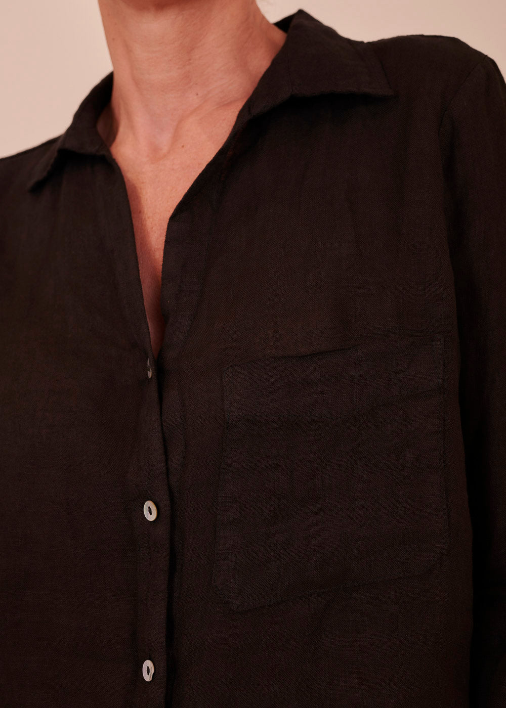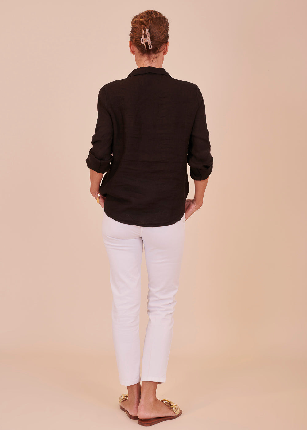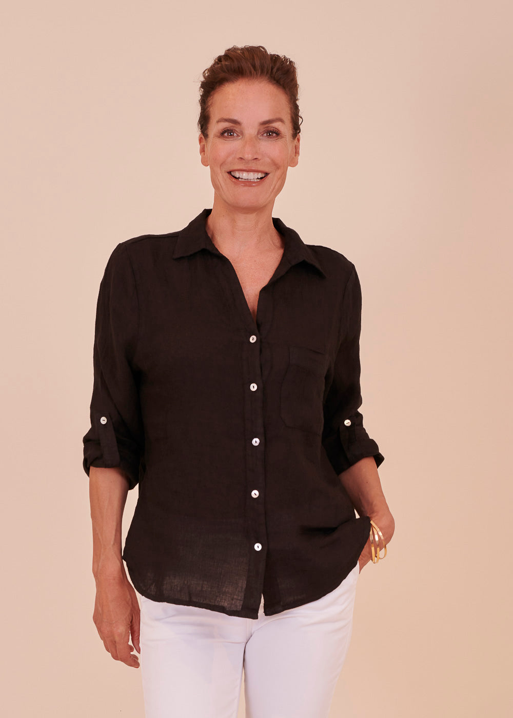 Leinenbluse mit Hemdkragen und Knopfleiste, Langarm mit Krempelriegel für 3/4-Länge. Die Hemdbluse ist sowohl bei schicken Anlässen als auch im Büro eine gute Option. Durch die praktische Knopfleiste sitzt deine Frisur auch noch nach dem An- oder Umziehen. Diese Bluse ist hüftlang sowie lässig geschnitten, sodass du dich wohlfühlst. Ein Traum in Schwarz.