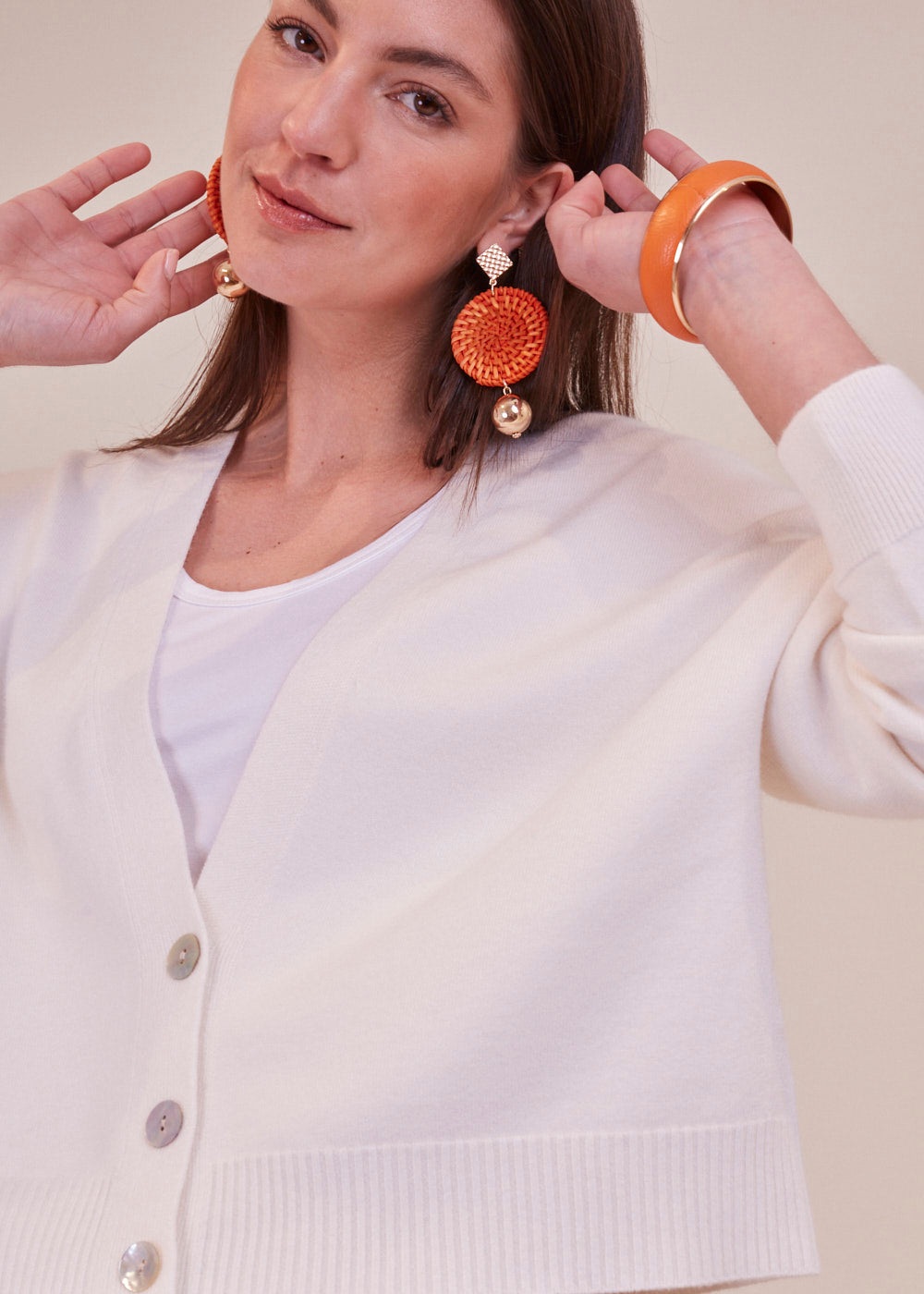 Kurz und kastenförmig geschnittene Strickjacke mit langen Armen aus unserem Bestseller Garn. Sie hat ein Rippenbündchen an den Ärmeln und am Saum. Durch die Frontknöpfe lässt sich diese Jacke wunderbar geschlossen tragen. Zum darunter tragen empfehlen wir dir unsere Basic Tops. Kuschelig weicher Tragekomfort mit absoluter Wohlfühlgarantie.