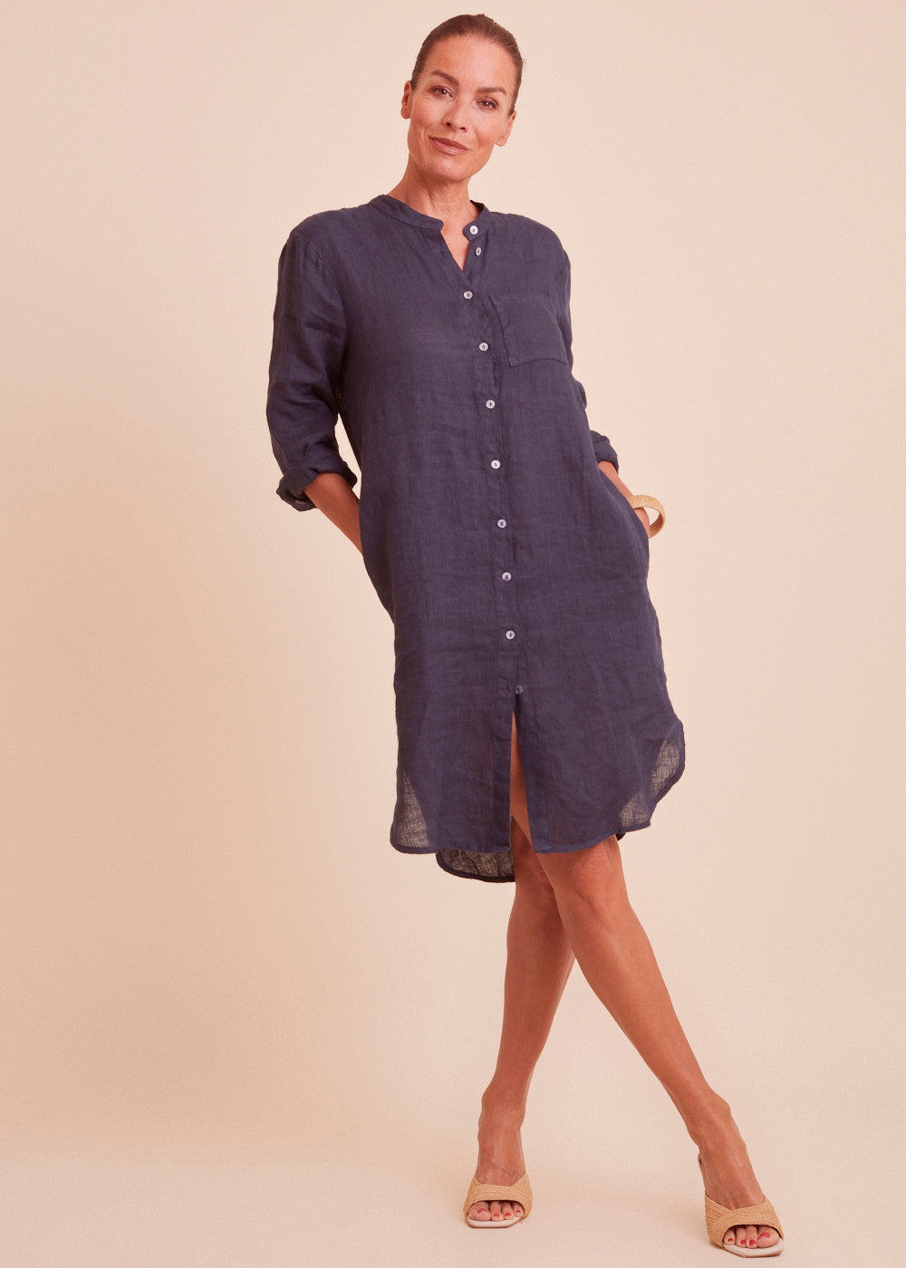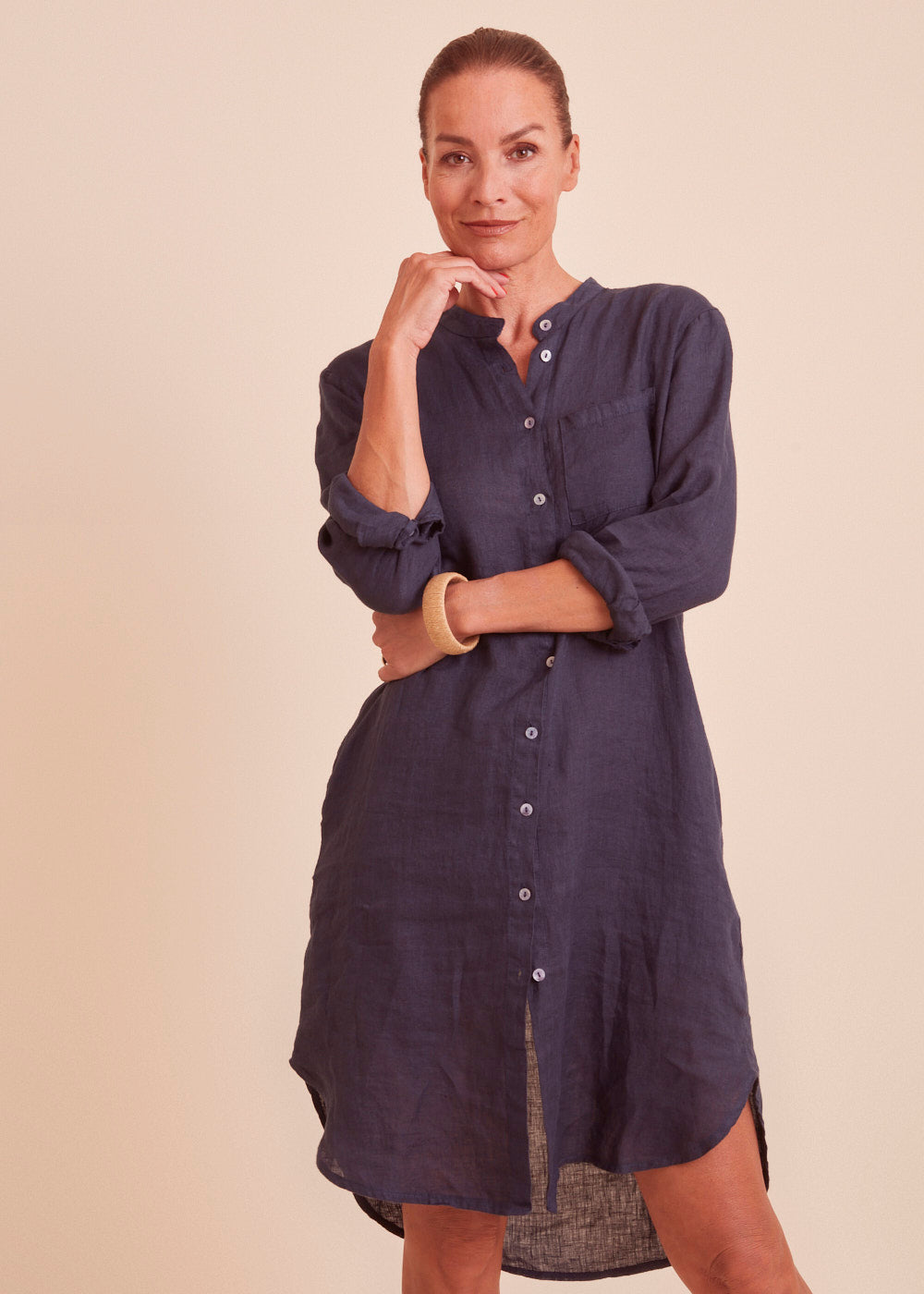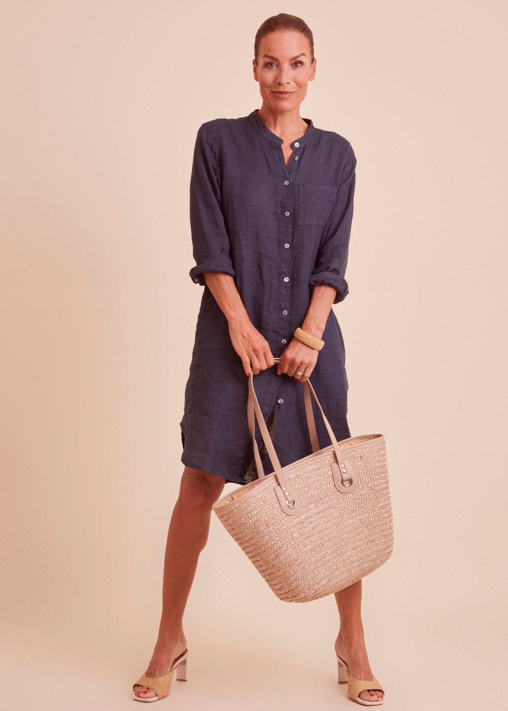 Dieses Leinenkleid im Hemdblusenstil ist schon jetzt deiner neue Lieblingsartikel. Die wunderschöne dunkel blaue Farbe ist dabei zeitlos und modern. Das angenehme Leinenmaterial kühlt auch an heißen Sommertagen deine Haut. Das Hemdblusenkleid-Outfit wird mit Sneakern oder Plateau Sandalen sportlich-modern.