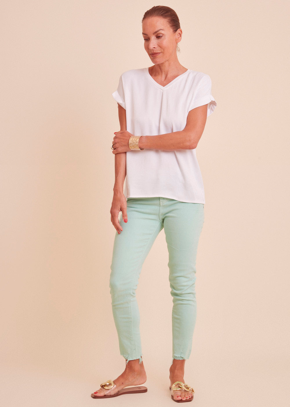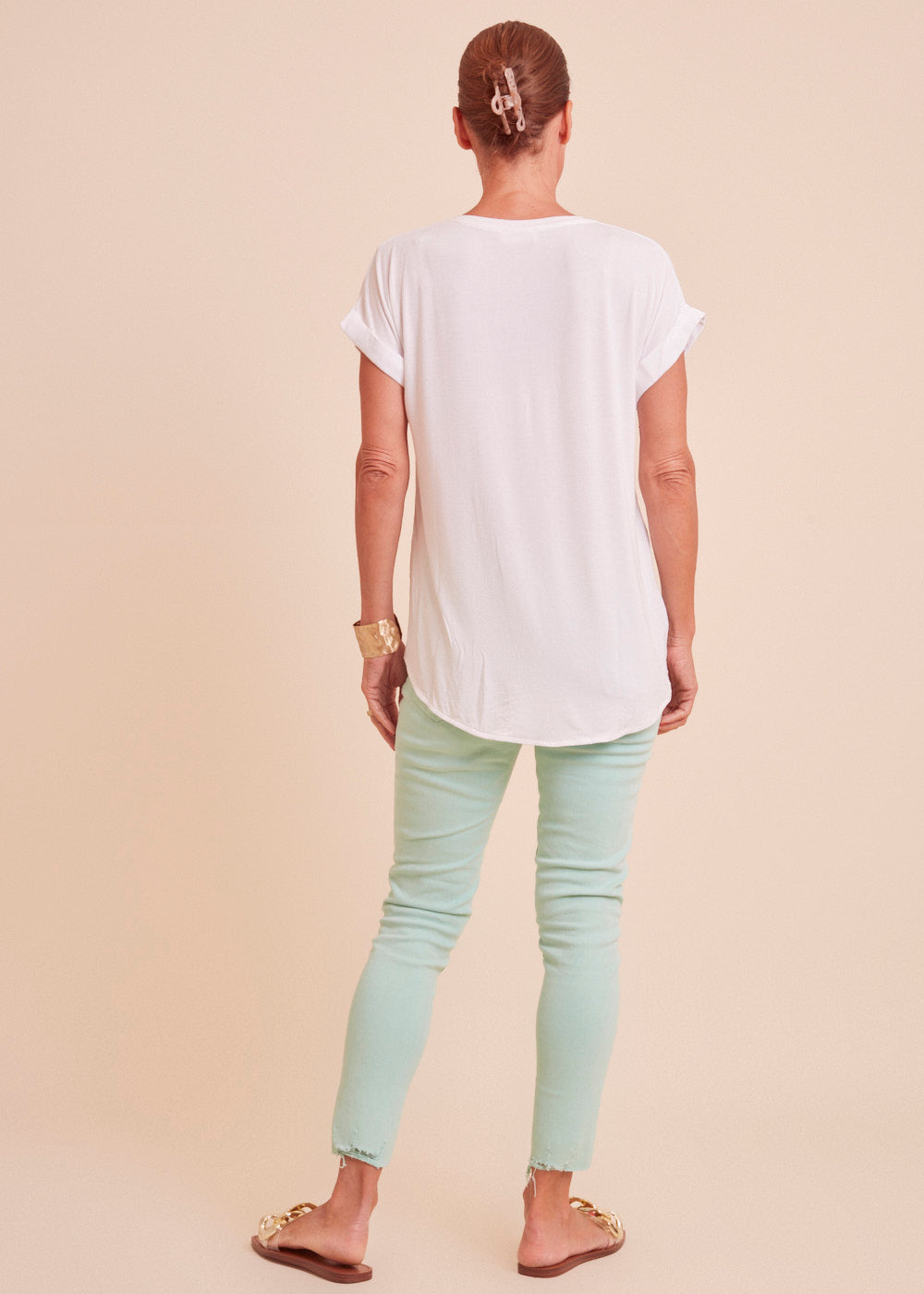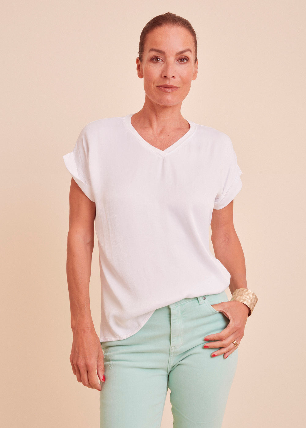 Das perfekte Basic. Dieses Materialmixshirt mit umgeschlagenen Ärmeln und V-Ausschnitt in einem lässigen Schnitt ist einfach perfekt zum kombinieren.