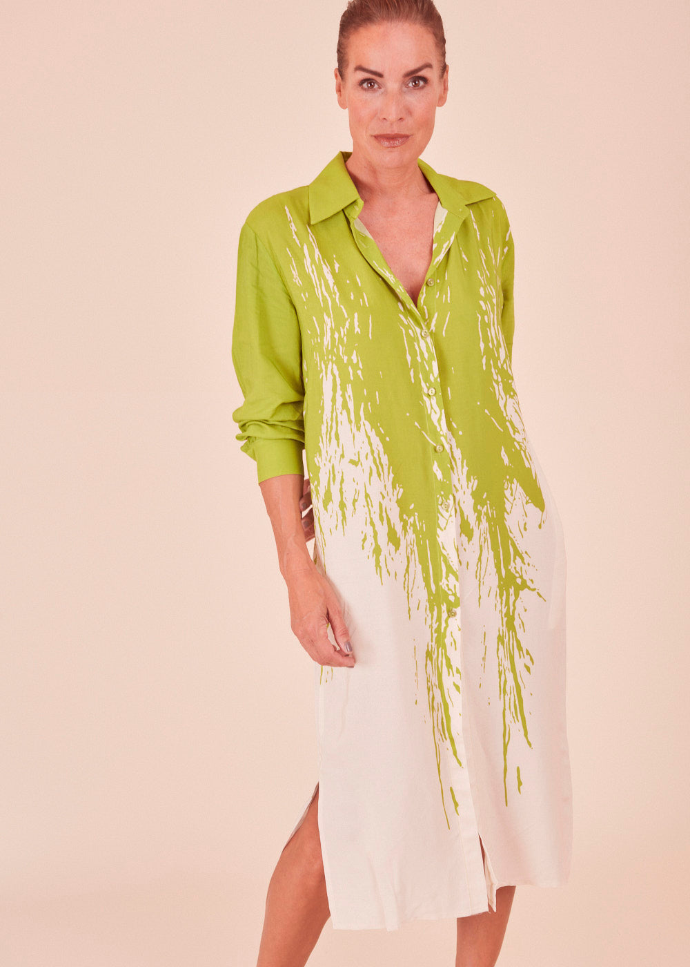 Dieses sommerliche Kleid erstrahlt in frischen neuen Trendfarben und einem All-Over-Print. Das Kleid besitzt einen Hemdkragen, sowie langen Ärmel. Der fließende Schnitt sorgt für ein luftig-leichtes Tragegefühl. Mit seitlichen Eingriffstaschen, einfach besonders!